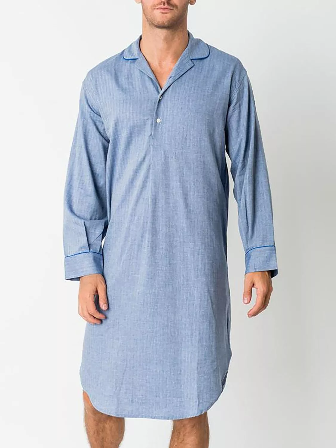 Beautifully crisp and cool, this classic cotton nightshirt delivers luxurious comfort. It's made using the same cloth British Boxers use in the production of their private nightwear label, Jermyn Street. Offering a roomy fit with great freedom of movement, it's a brilliant option for lounging or sleeping as naturally breathable cotton will keep you warm in winter and fresh in summer. Complete with a three-button neck opening and contrast piping around the collar and cuffs. Length: 47"/120cm.