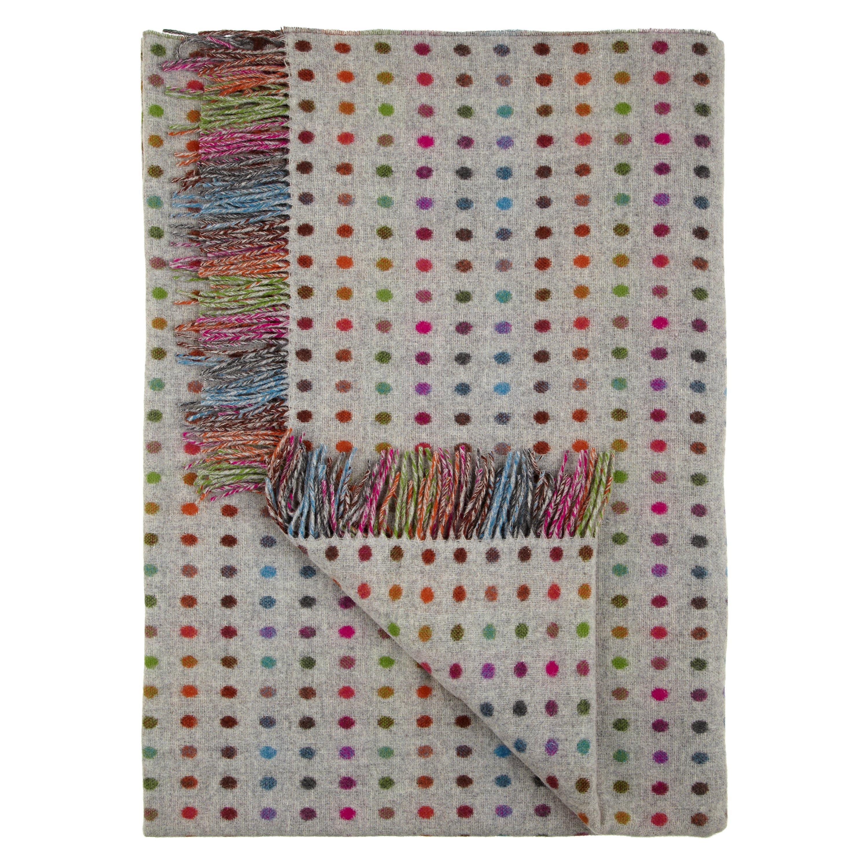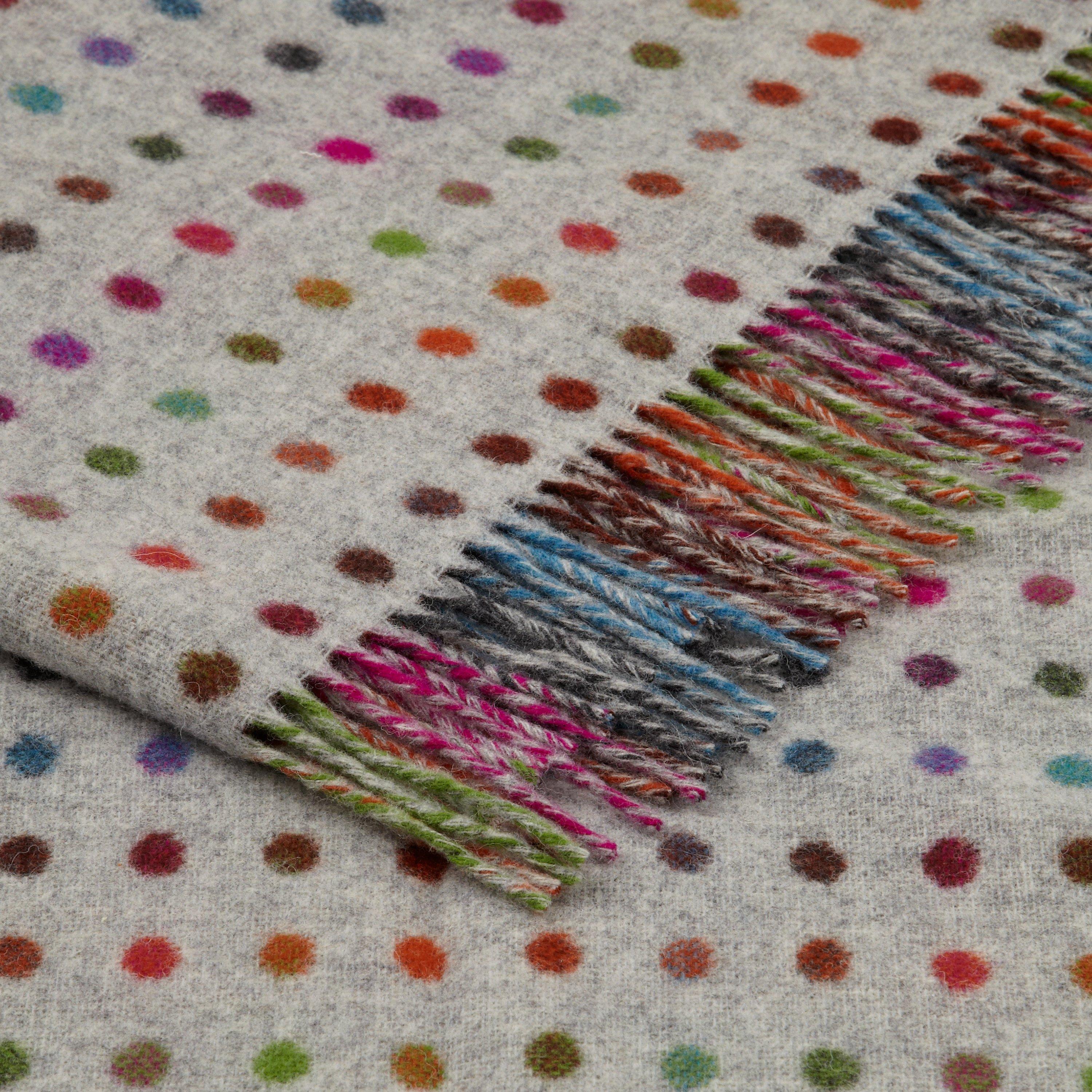 This beautiful merino lambswool wool throw has a colourful fringed edge and a pattern of multicoloured dots.
