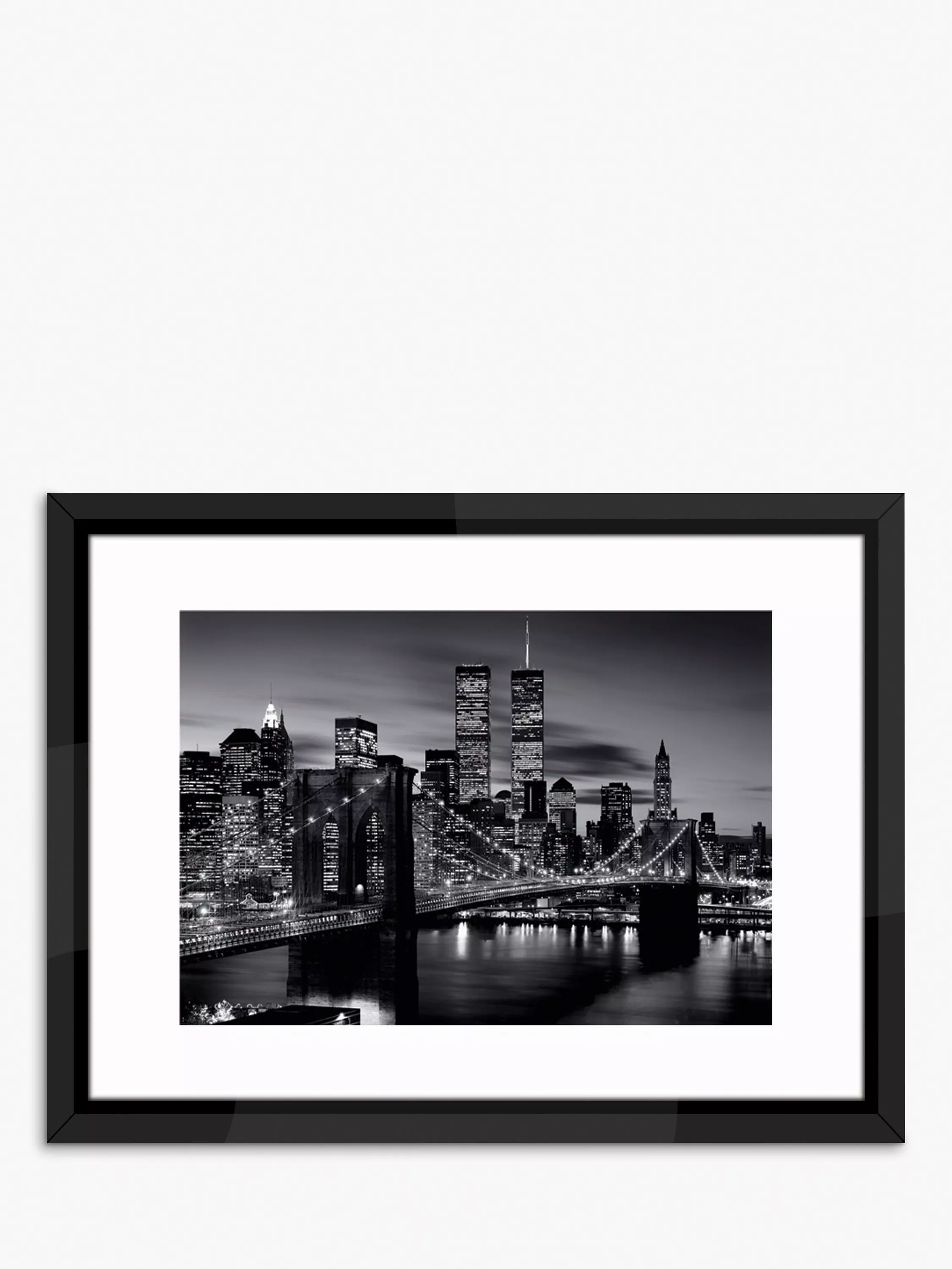 A framed black and white photographic print, from The Studio Collection, of the iconic New York landmark Brooklyn Bridge, at night.