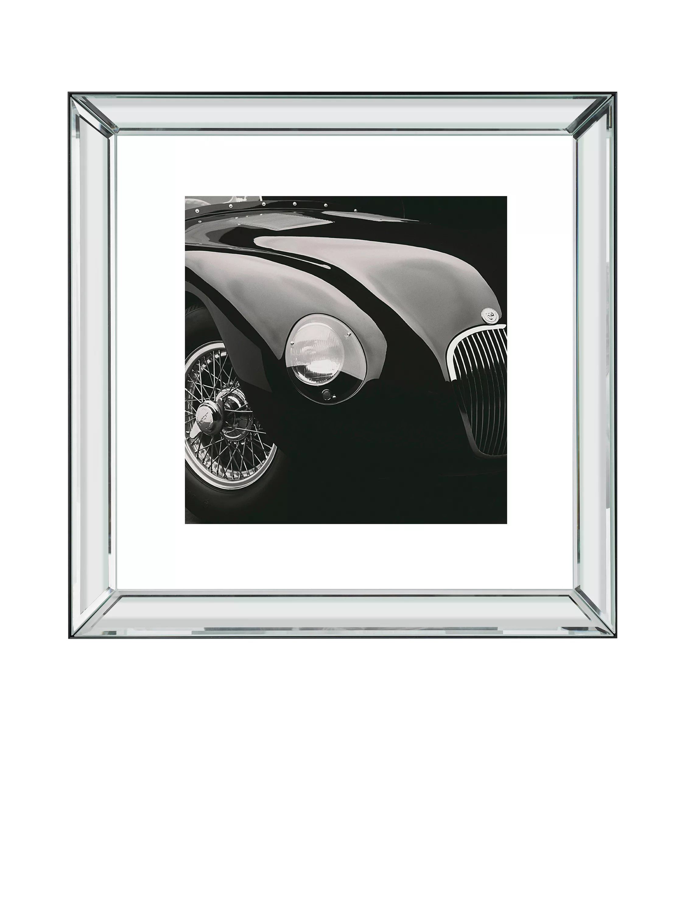 Black and white photograph of the iconic Jaguar C-Type 1950s car, set within a white mountboard that beautifully frames the image. Printed in-house at Brookpace Lascelles in the UK on uncoated 250gsm premium paper to guarantee a glare-free finish. Displayed with float glass in a luxury Italian matt-black wooden frame moulding with engineered bevelled mirrored glass (5cm depth). Ready to hang on your wall.
