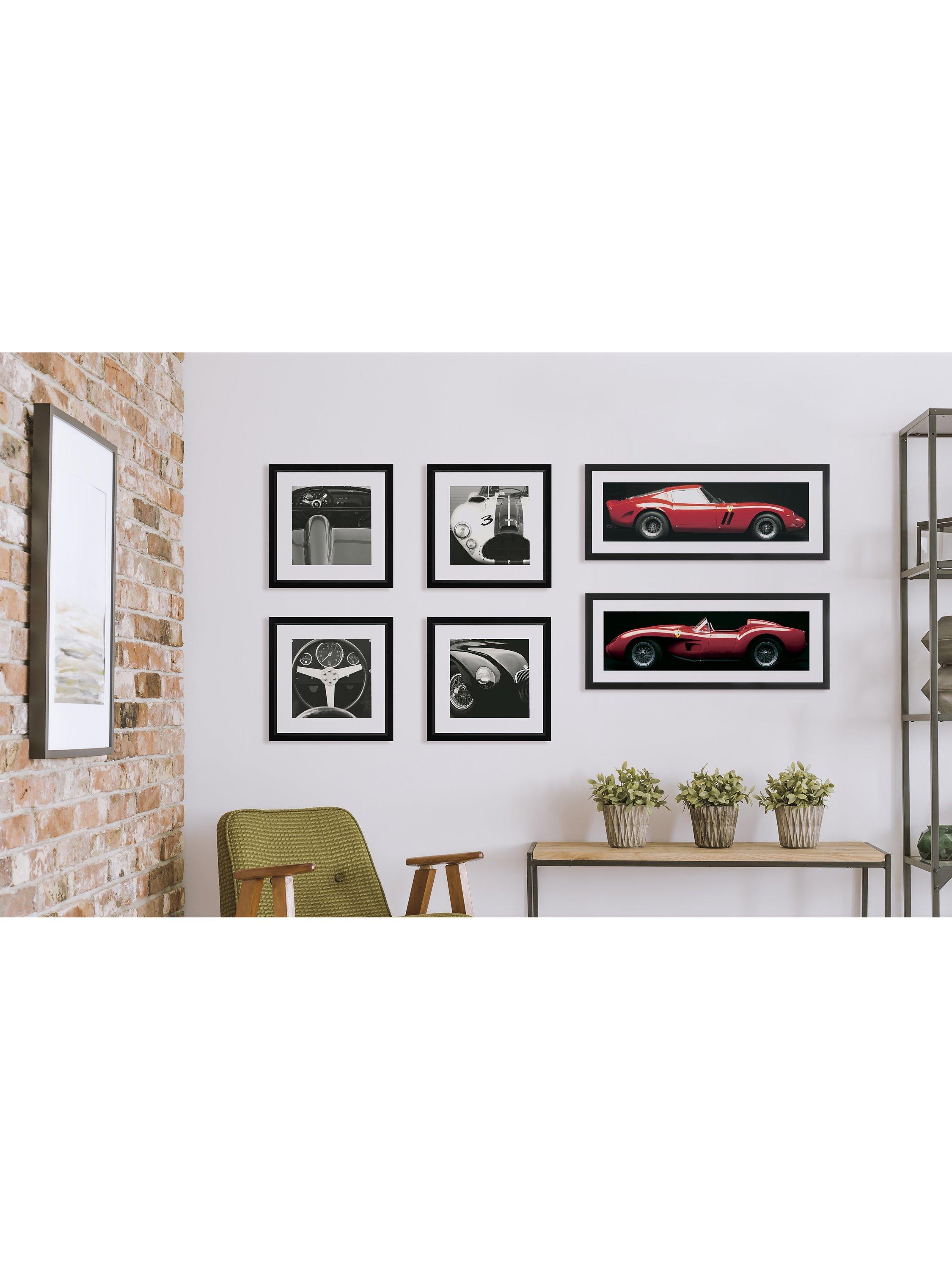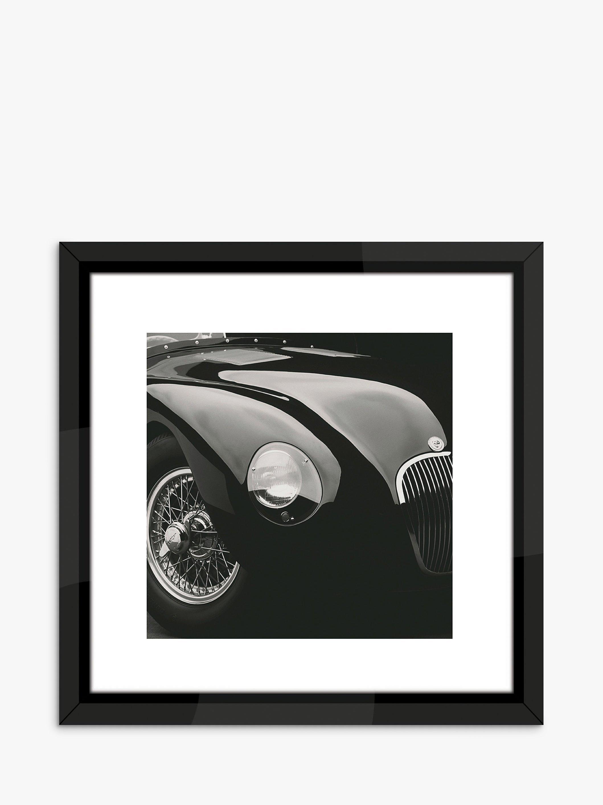 A framed black and white photographic print, from The Studio Collection, of a classic racing sports car from the 1950s, the Jaguar C-Type.