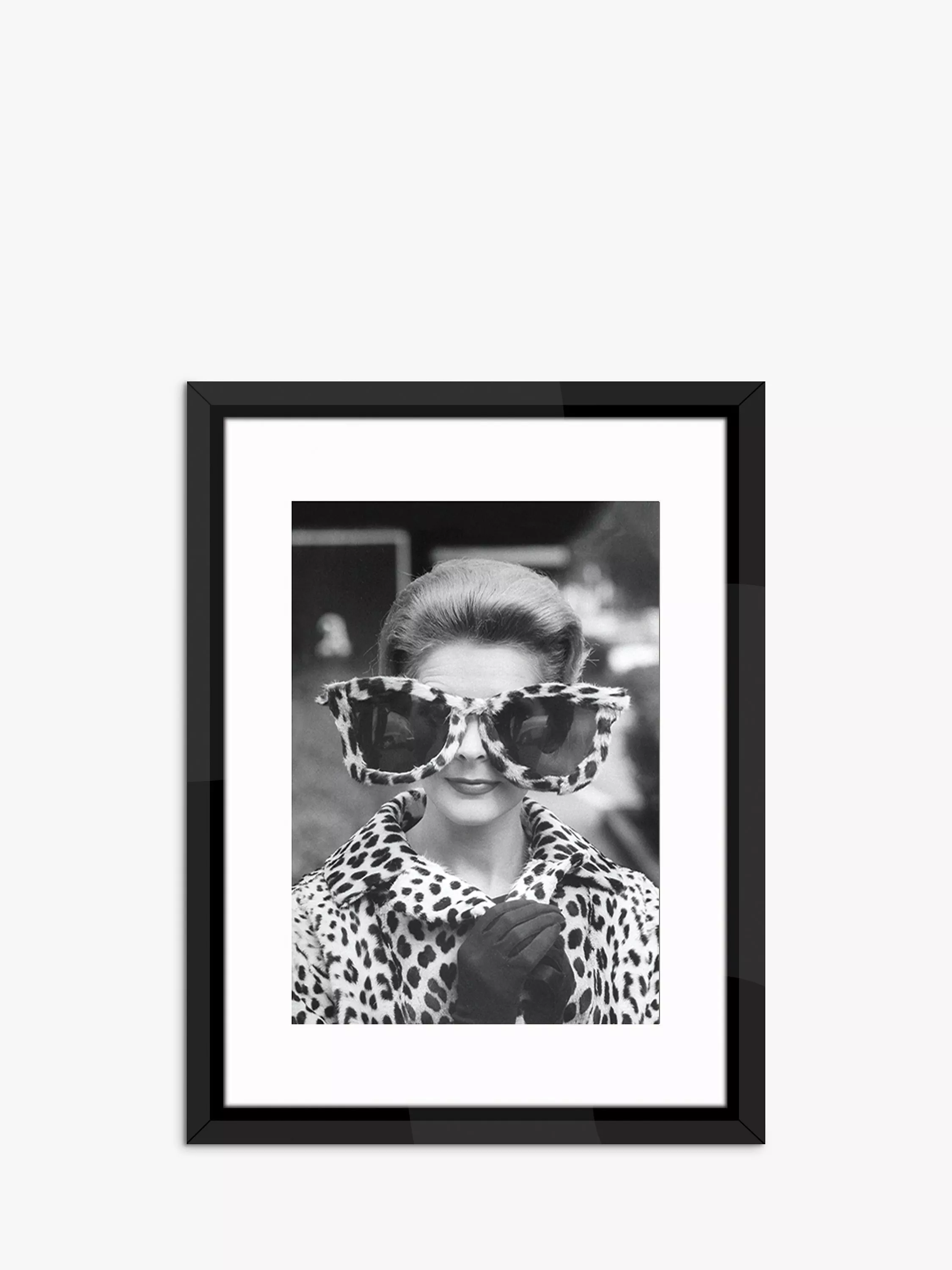 A framed black and white photographic print, from The Studio Collection, by photographer Stan Wayman, capturing the audacity and style of '60s fashion. Model June Pickney wears a leopard print coat and matching over-sized sunglasses.