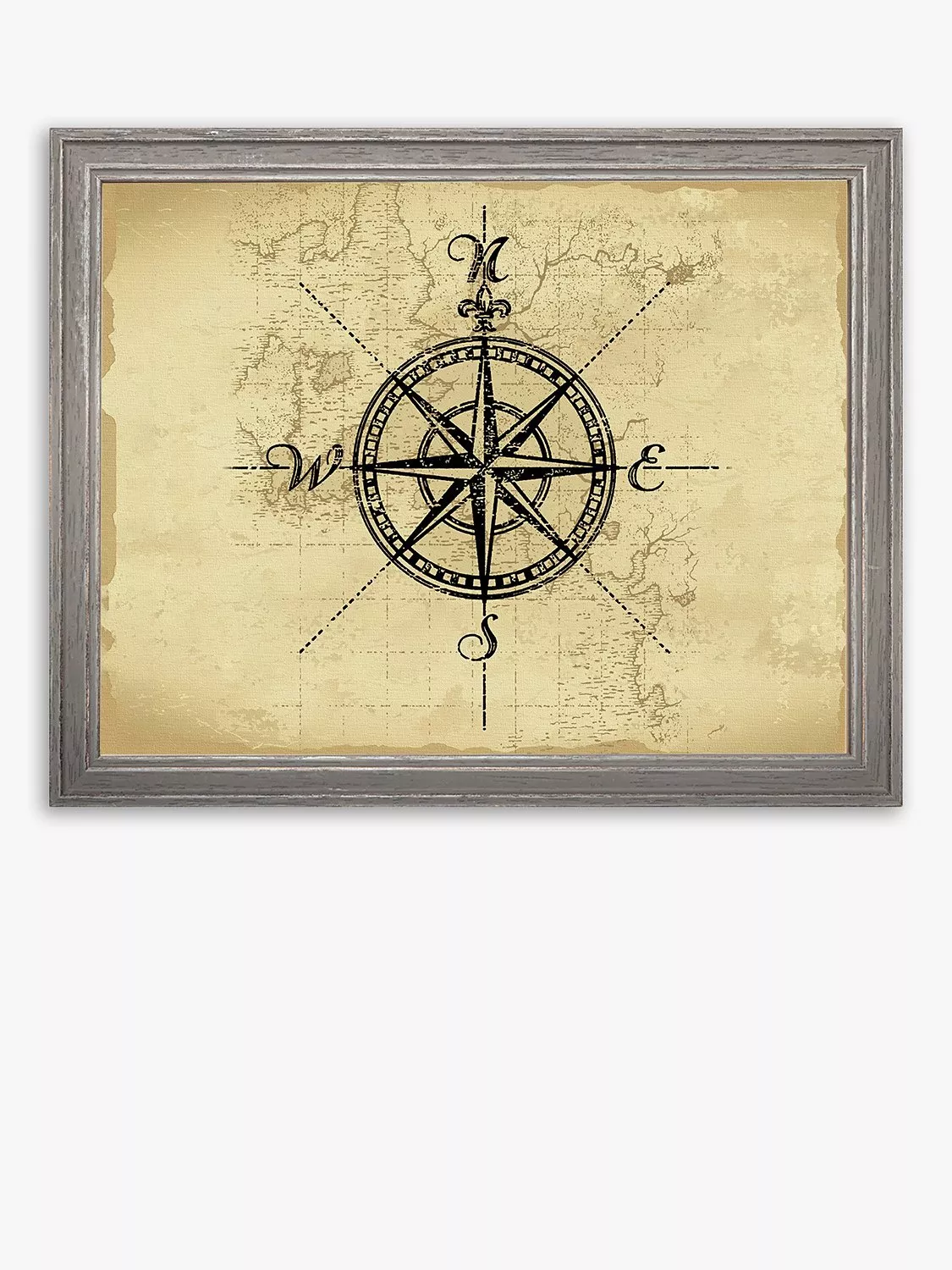 A vintage-style art print of a map and compass. Made in the UK, it's presented in an aged wooden frame set behind glass.