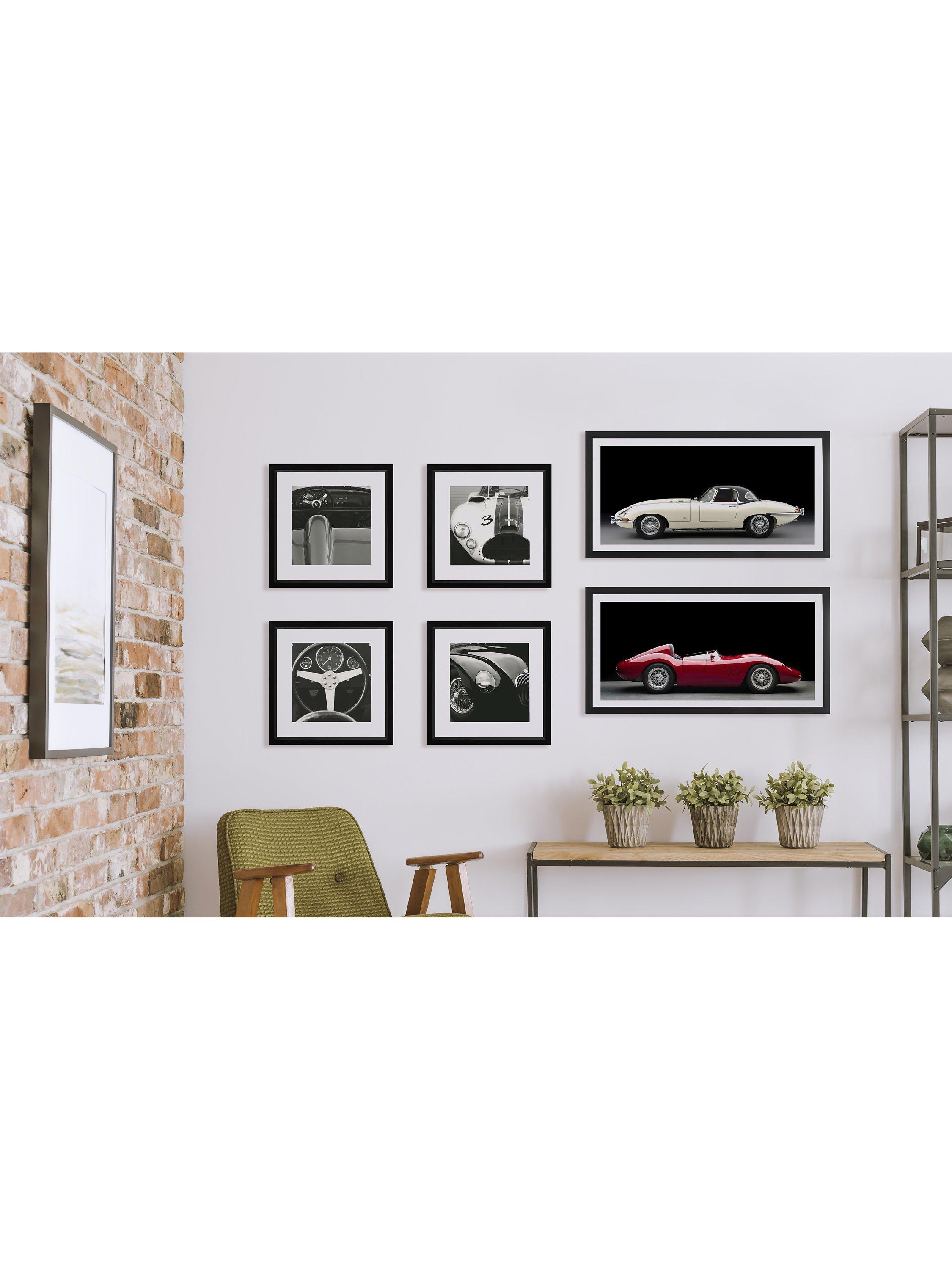 A photograph of a classic 1950s sports car, the Maserati 250S Fantuzzi. Presented in a gloss black 'studio' frame with a window mount, this picture is ready to wall hang.