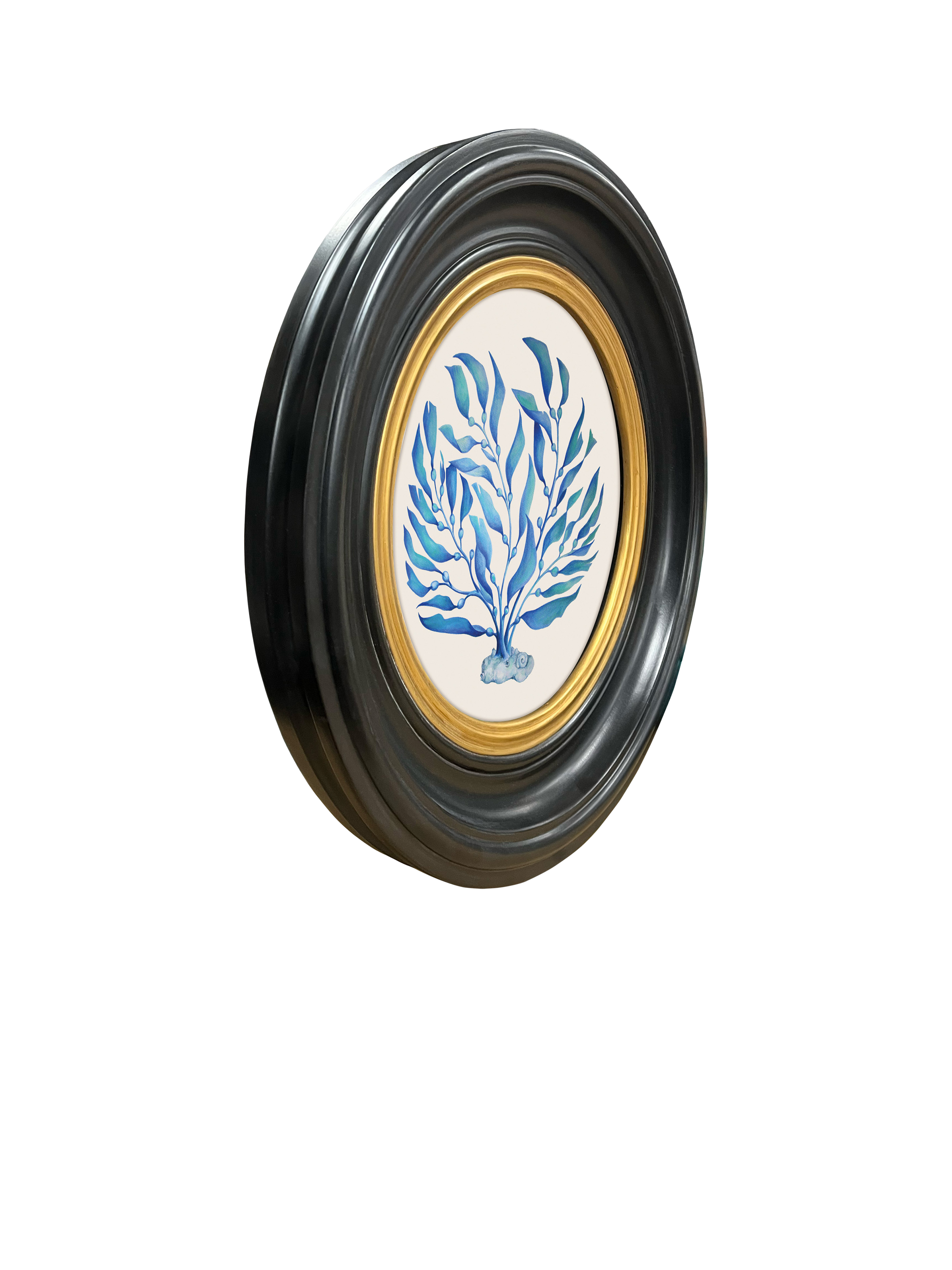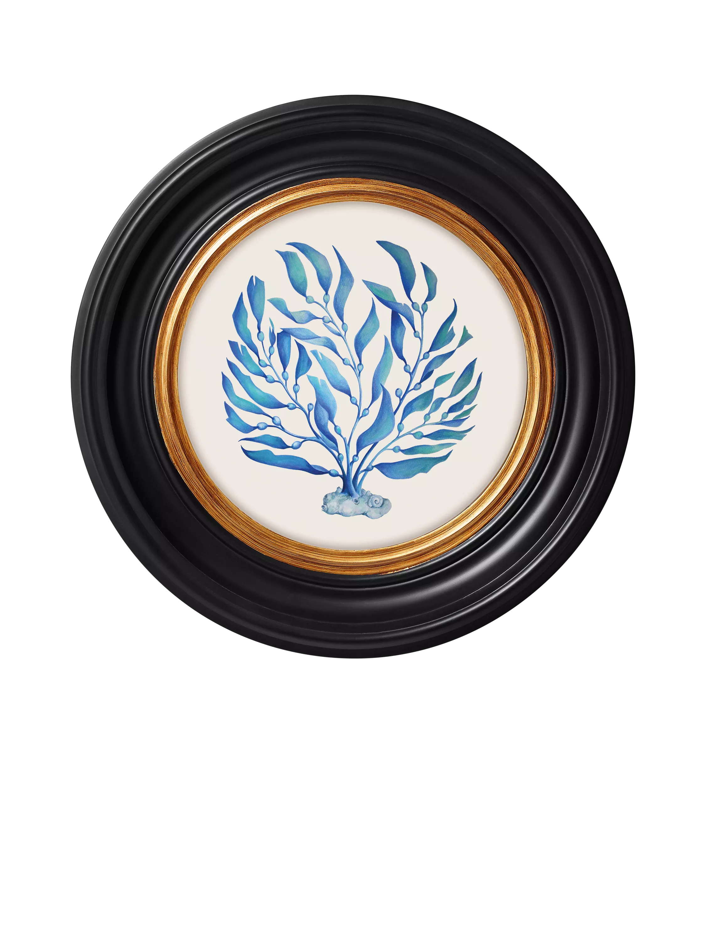 A vintage-style book print illustration of blue feather-like seaweed. Printed on high-quality 250gsm satin photo paper and presented in an antiqued black round frame with a gold-toned border and domed glass lens. Made in the UK, it's ready to hang on your wall.