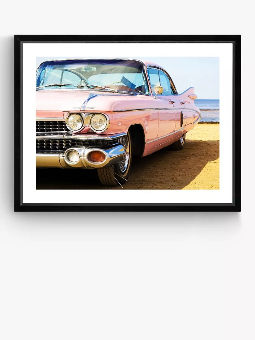 Classic car, a pink Cadillac, photographed on a beach, California style. Framed, glazed and printed in the UK on 250gsm satin photo paper, this print is presented in a window mount, ready to hang on your wall.