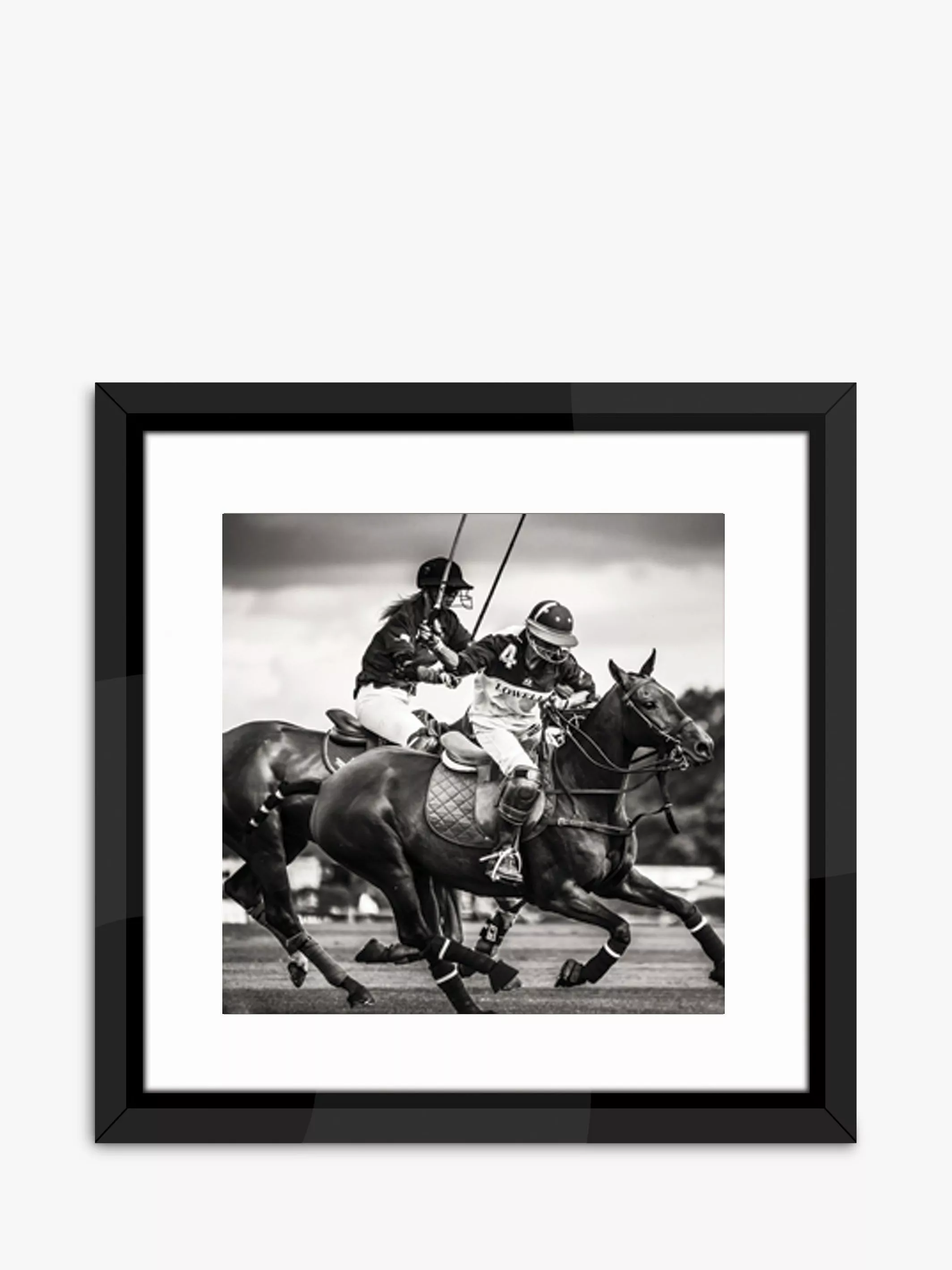 A framed black and white photographic print, from The Studio Collection, capturing the energy of a polo match.