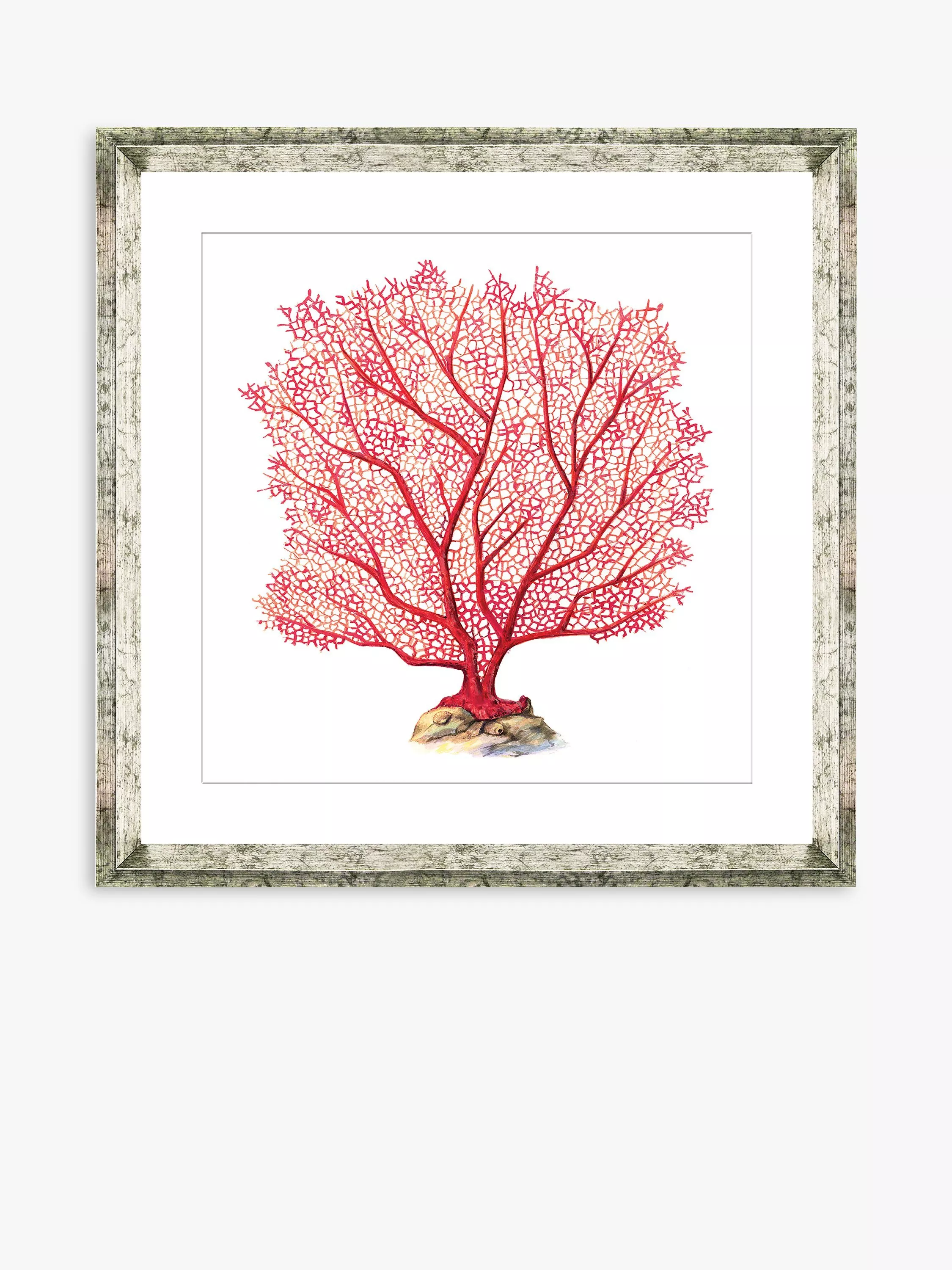 A vintage-style book print illustration of red coral. Framed and printed in the UK on 250gsm satin photo paper, this glazed print is presented in a window mount with an antiqued wood-effect frame that beautifully complements the base of the coral.