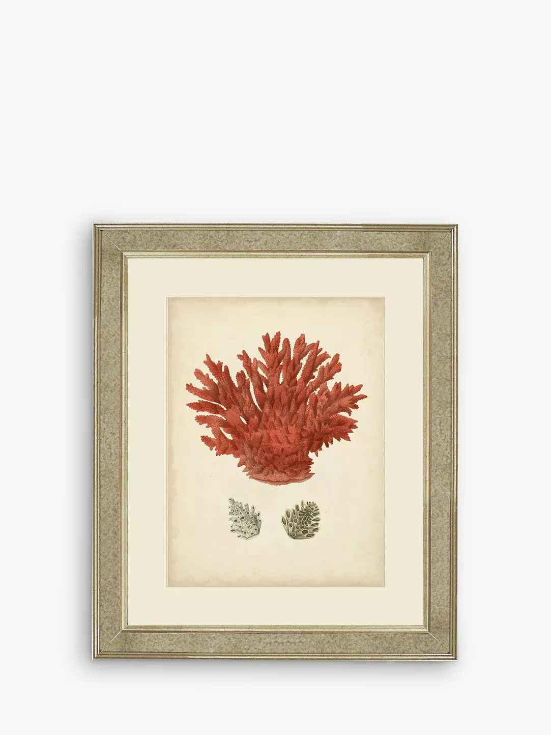 A vintage-style book print illustration of red coral. Presented with a mount and framed in an antiqued mirror glass frame.