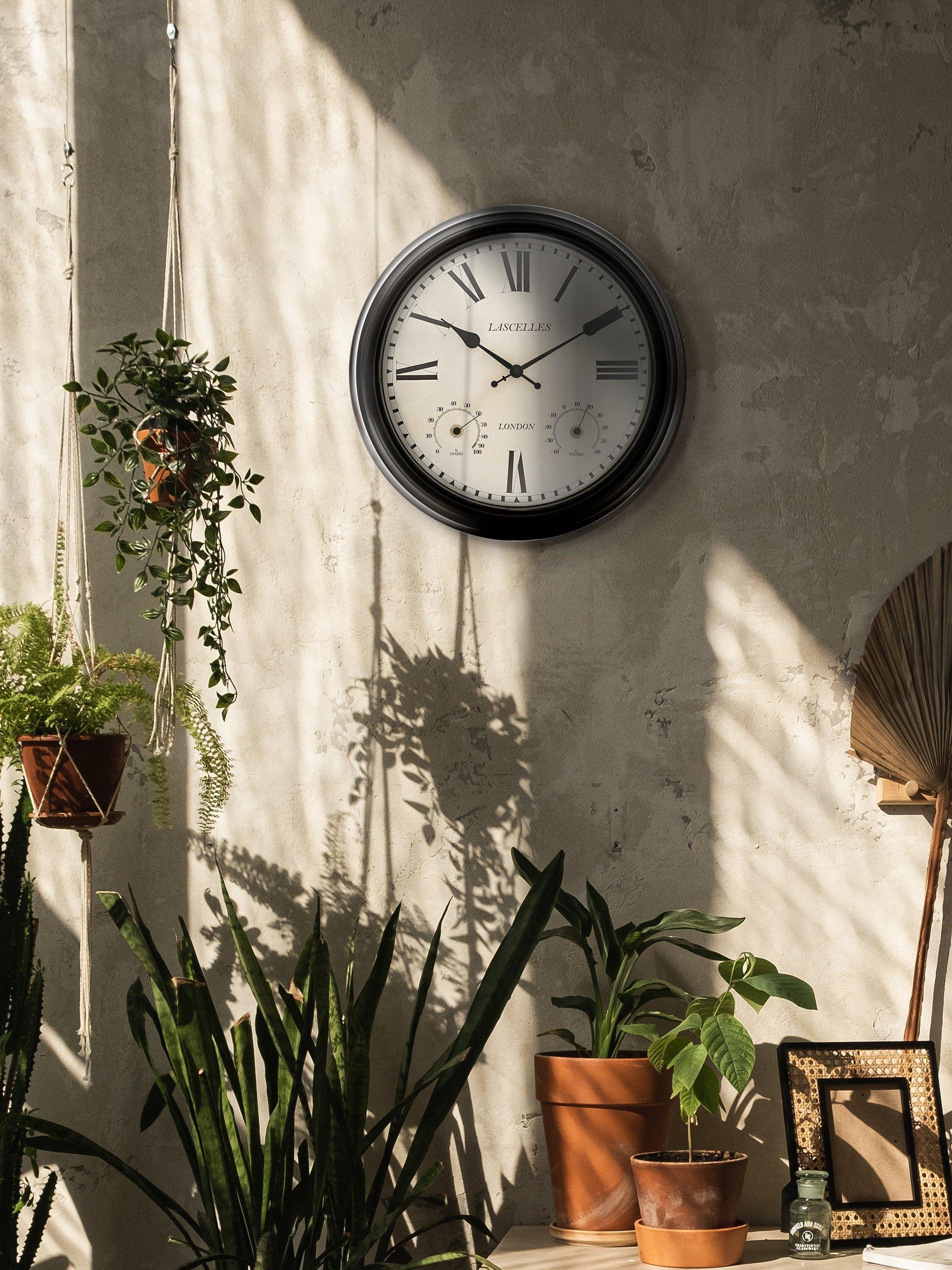 A vintage-style design from Brookpace Lascelles, this clock has all the charm of a traditional Roman numeral indoor wall clock yet it can be wall-mounted outdoors. Sturdy and waterproof with a metal casing, this garden clock has temperature and humidity gauges on the clock face.