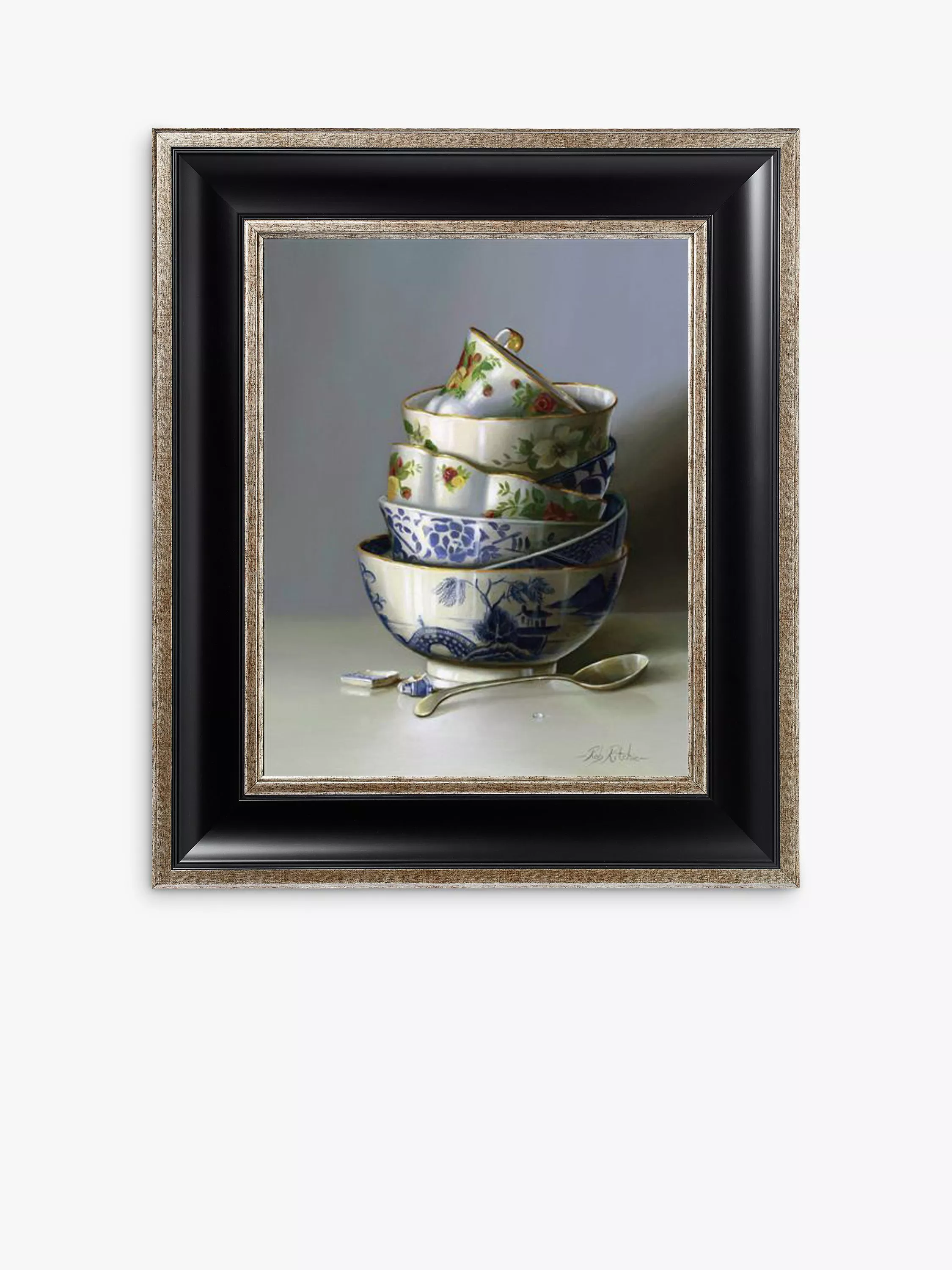 Patterned china tableware fills this still life canvas. Presented in a dark wood-effect frame with an inner gold rim.
