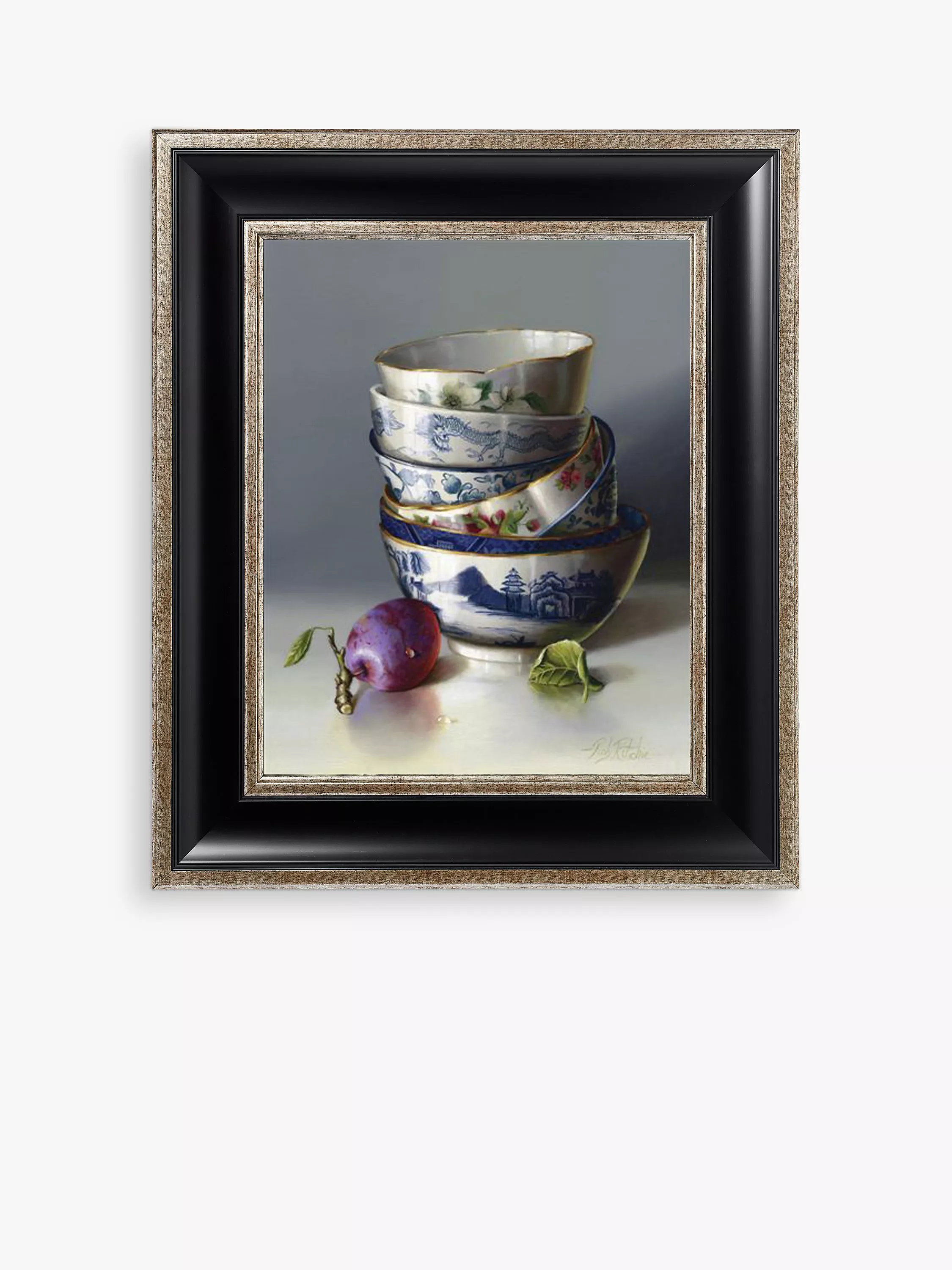 Patterned china tableware and a ripe plum fill this still life canvas. Presented in a dark wood-effect frame with an inner gold rim.