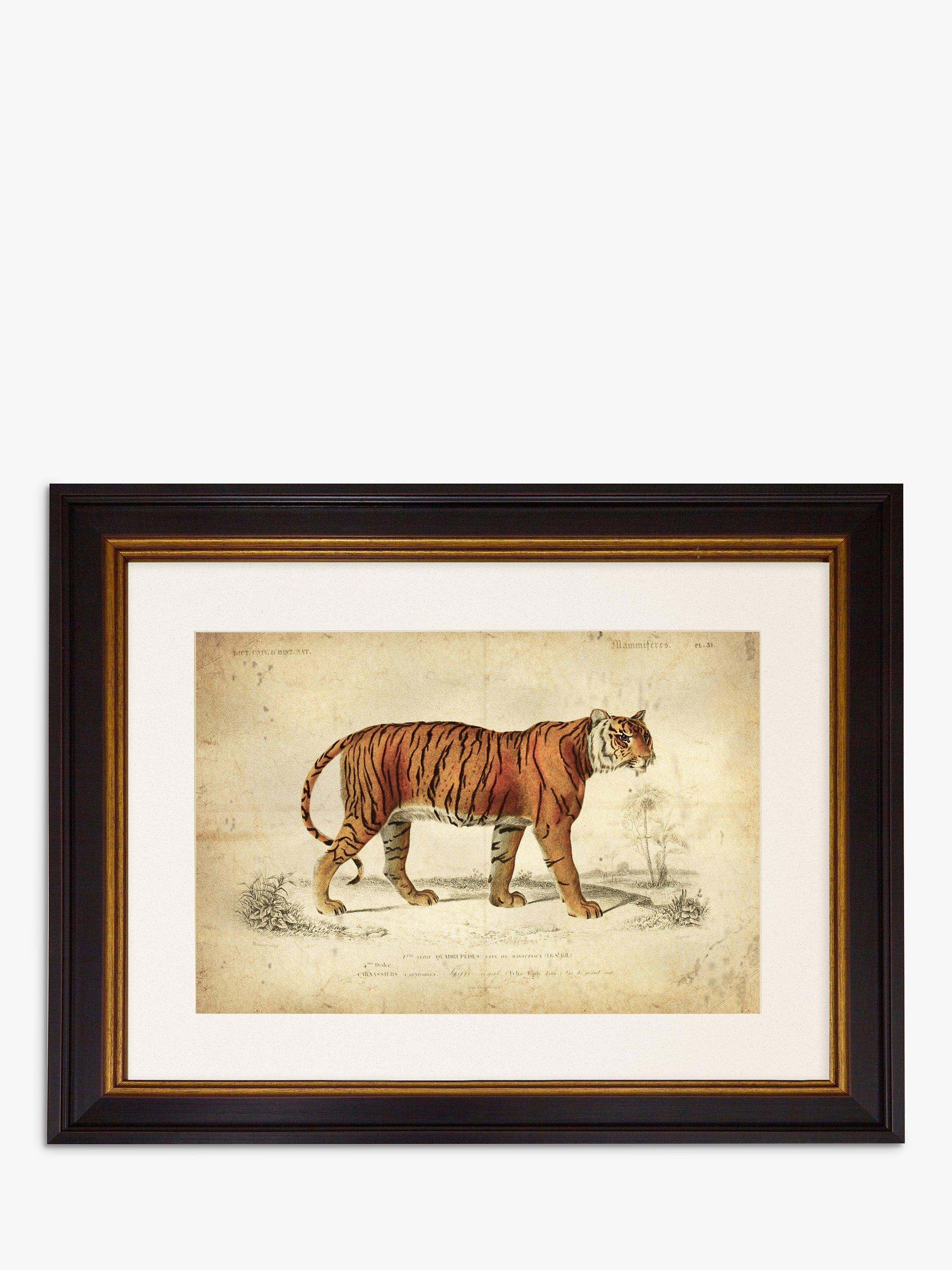 A vintage-style print illustration of a prowling tiger. Presented with a mount and a dark wood-effect frame with an inner gold rim.