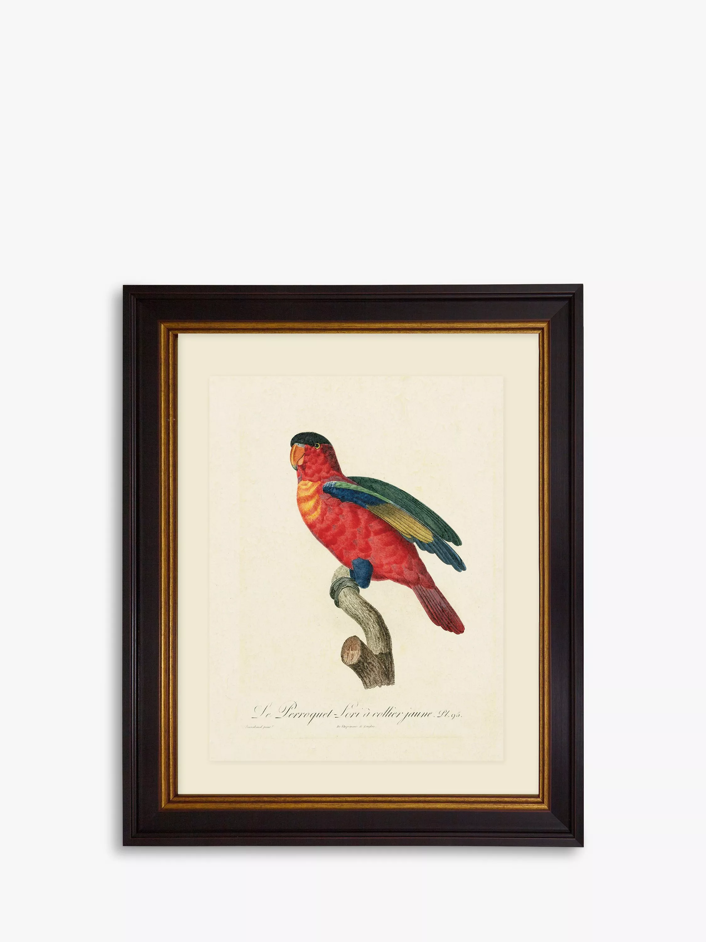 A vintage-style print illustration of a parrot. Presented with a mount and a dark wood-effect frame with an inner gold rim.