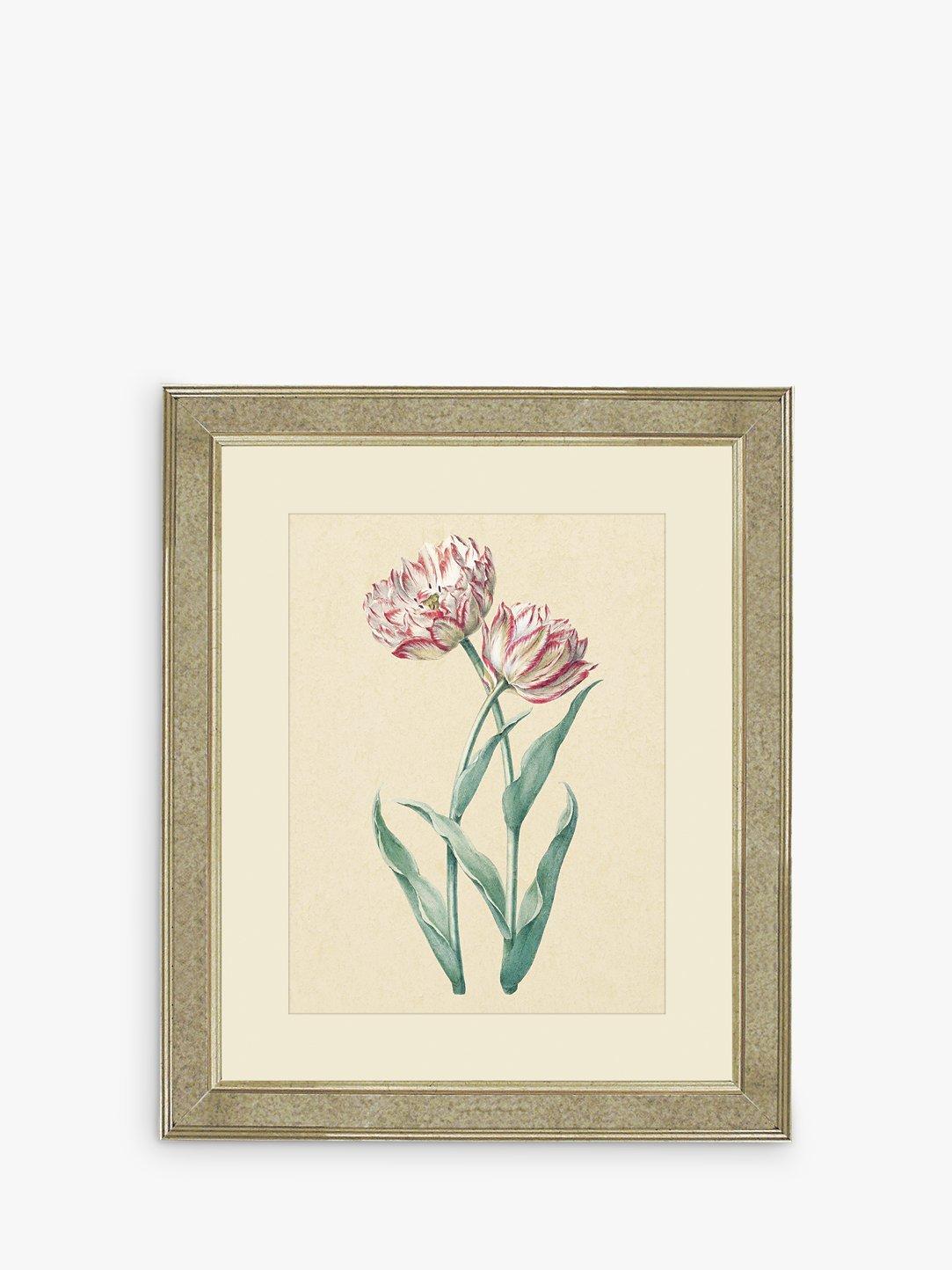 A vintage-style book print illustration of tulips. Presented with a mount and framed in an antiqued mirror glass frame.