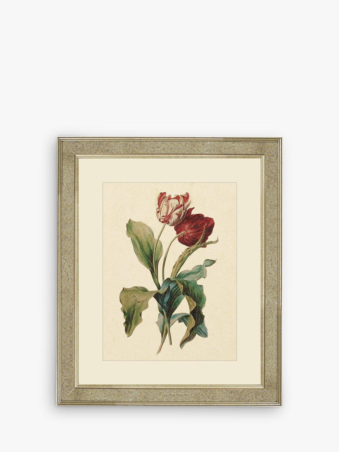 A vintage-style book print illustration of tulips. Presented with a mount and framed in an antiqued mirror glass frame.