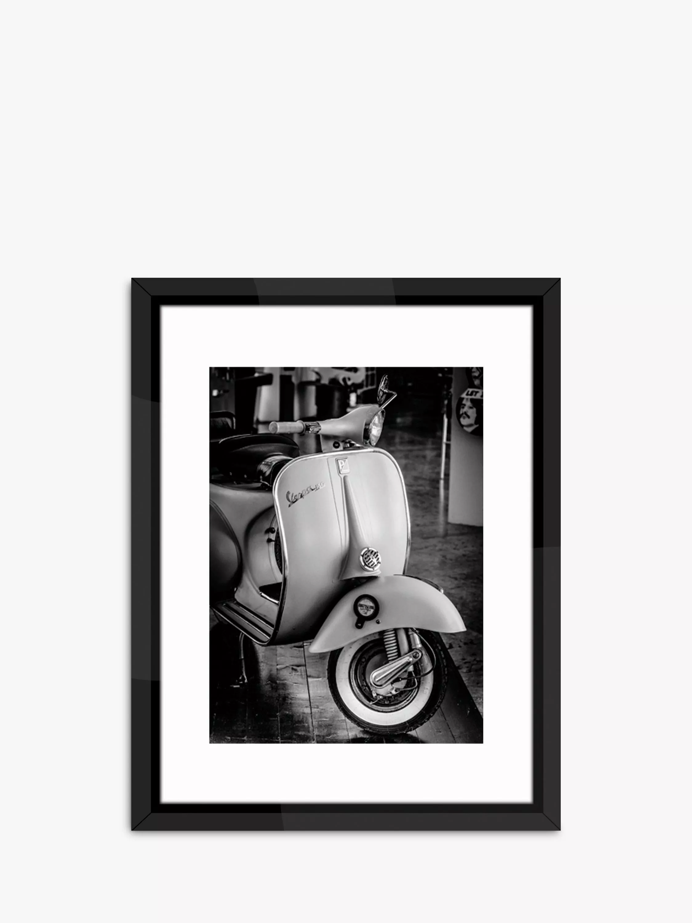 A framed black and white photographic print, from The Studio Collection, of an urban Italian classic, a Vespa.
