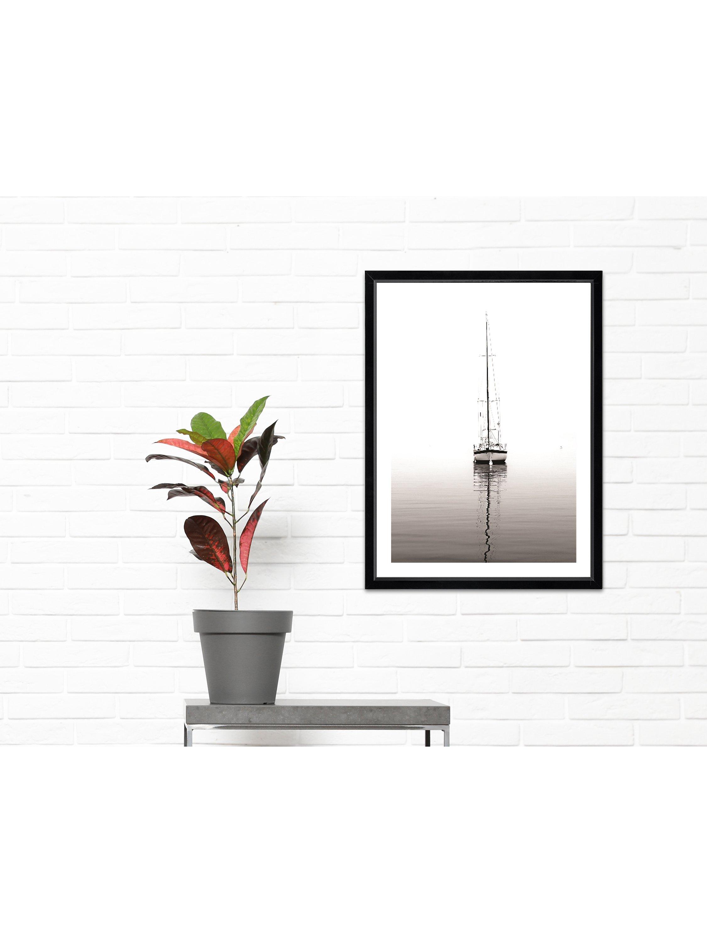 A tall yacht reflected on still water. Framed, glazed and printed in the UK on 250gsm satin photo paper, this photographic print is presented in a window mount, ready to hang on your wall.