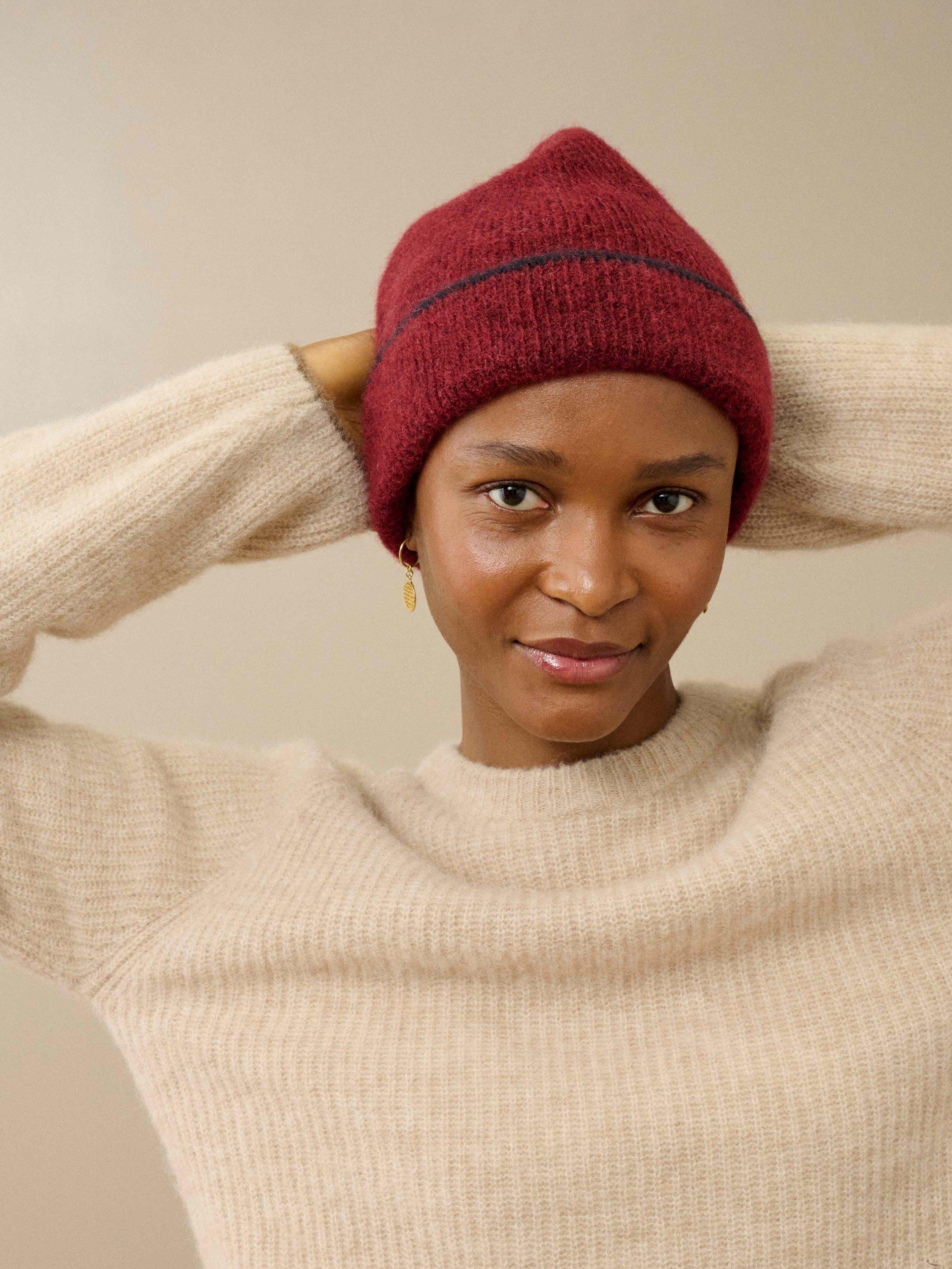 Keep your head and ears warm whenever the north wind blows with this contrast-tipped beanie, beautifully knitted from a blend of natural alpaca and merino wool, adored for its sublimely soft handle and fluffy texture.