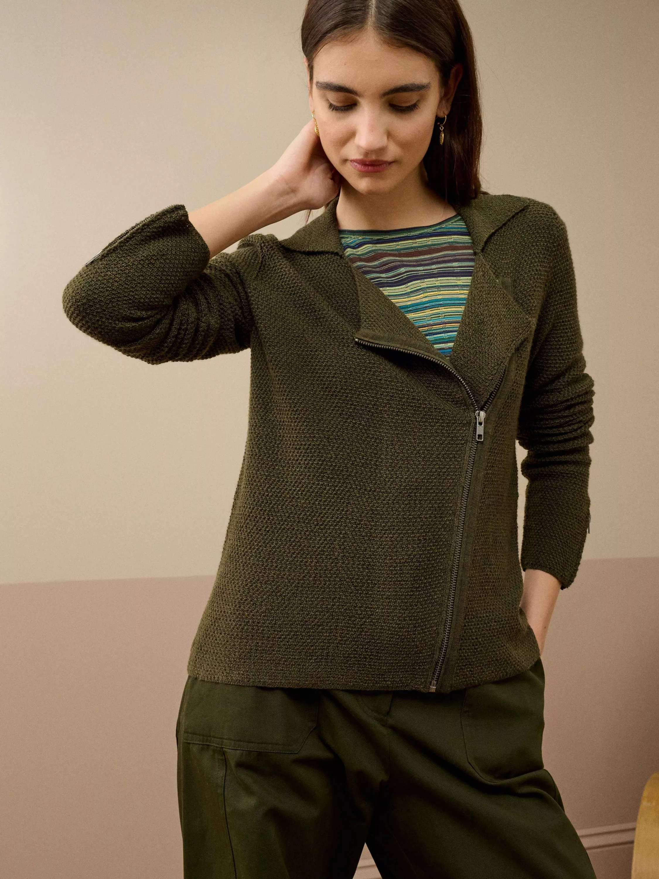 Biker Jackets are back with a chic asymmetric zip front, zip sleeves and a contrasting insert, all on a lightweight, textured merino base.