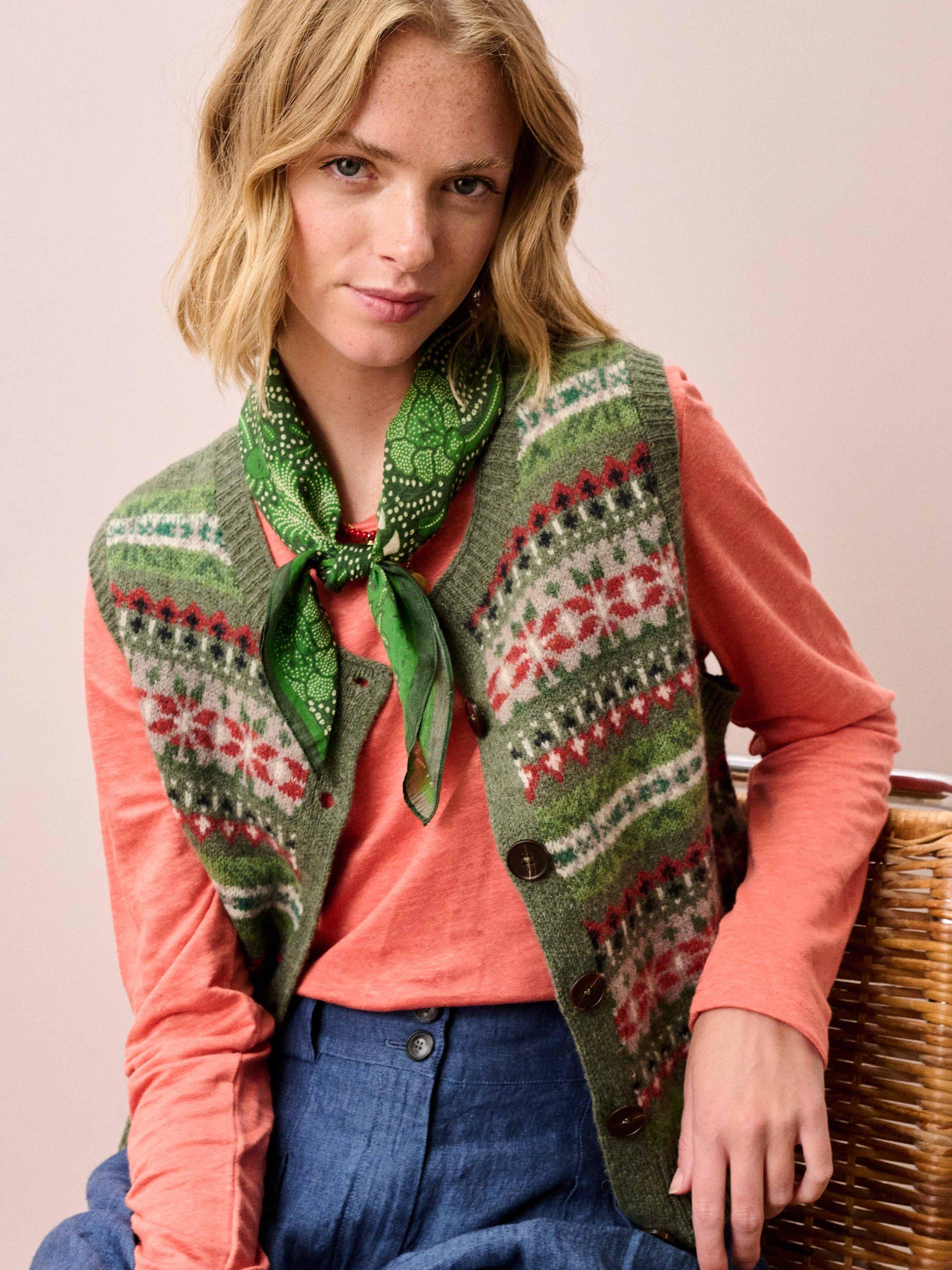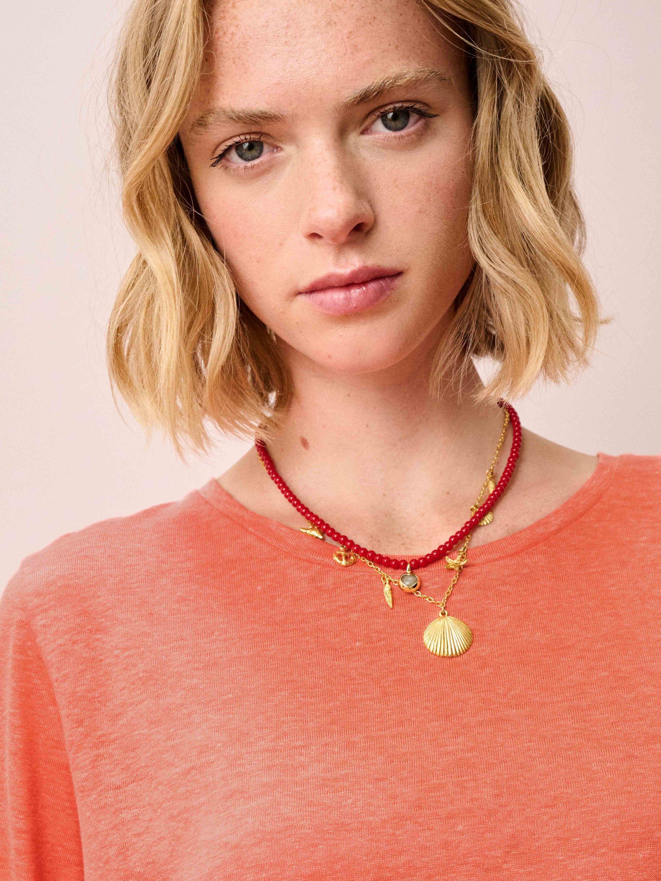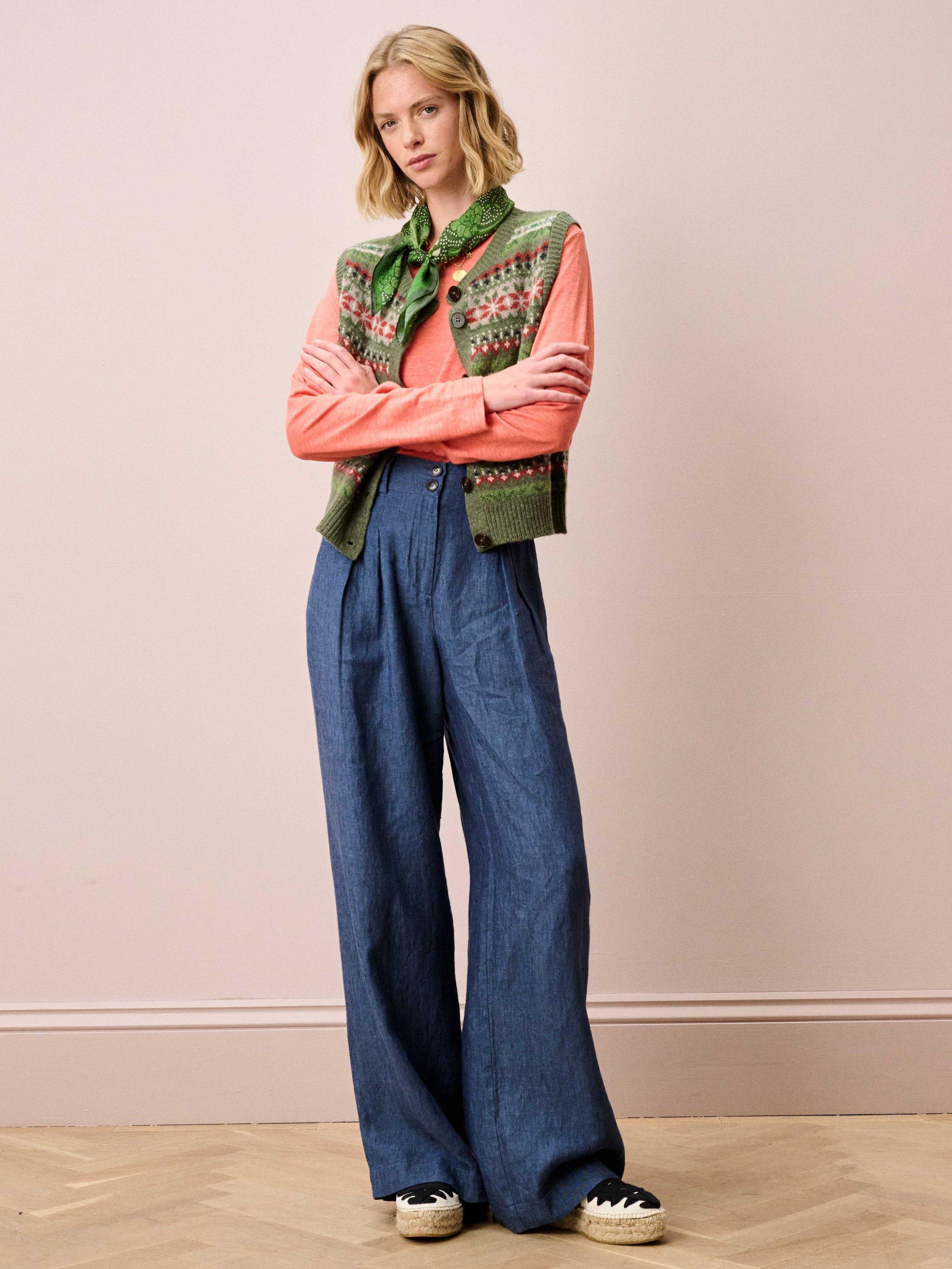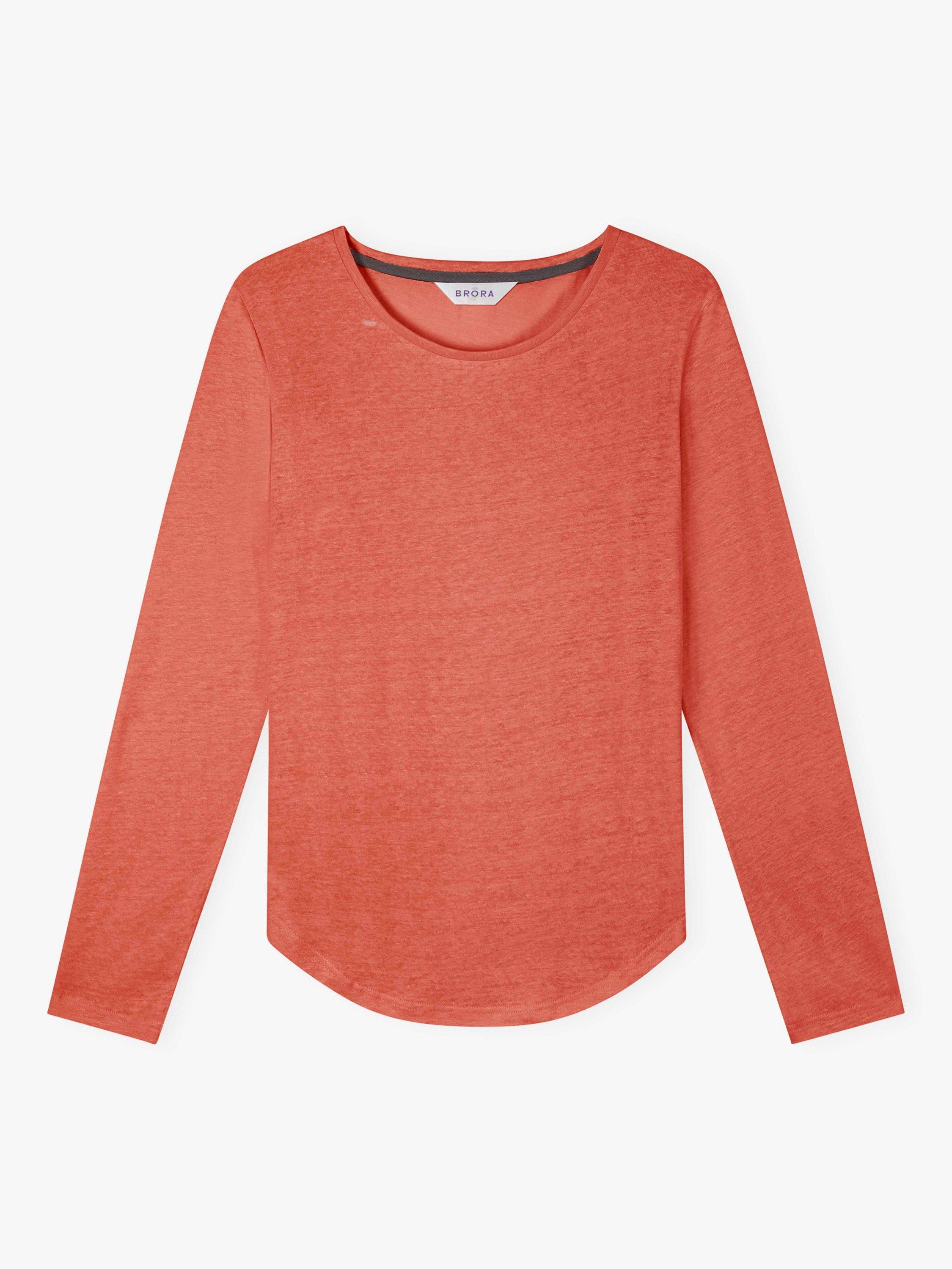This linen knit top features a flattering boat neckline, long sleeves and a curved hemline.