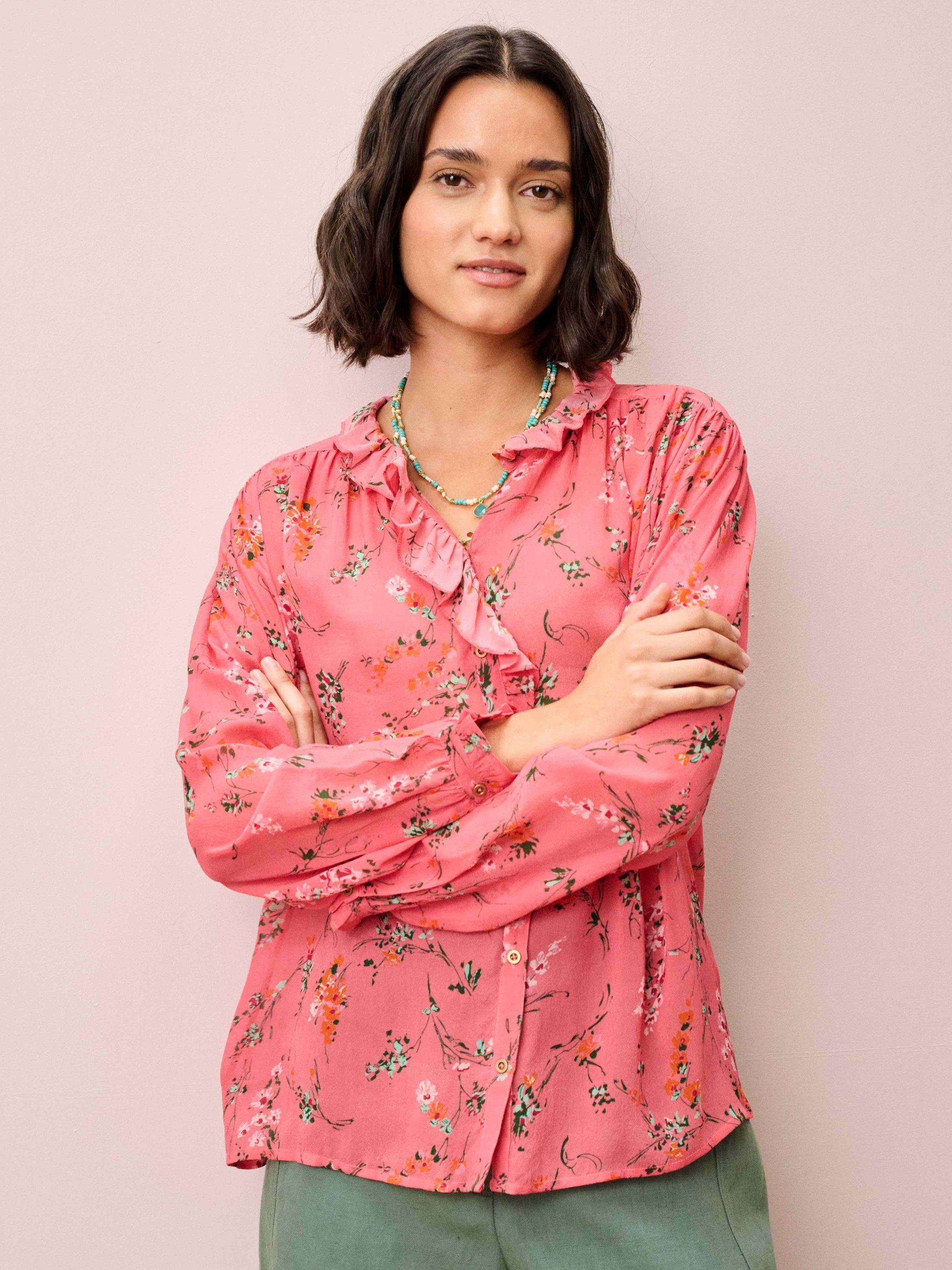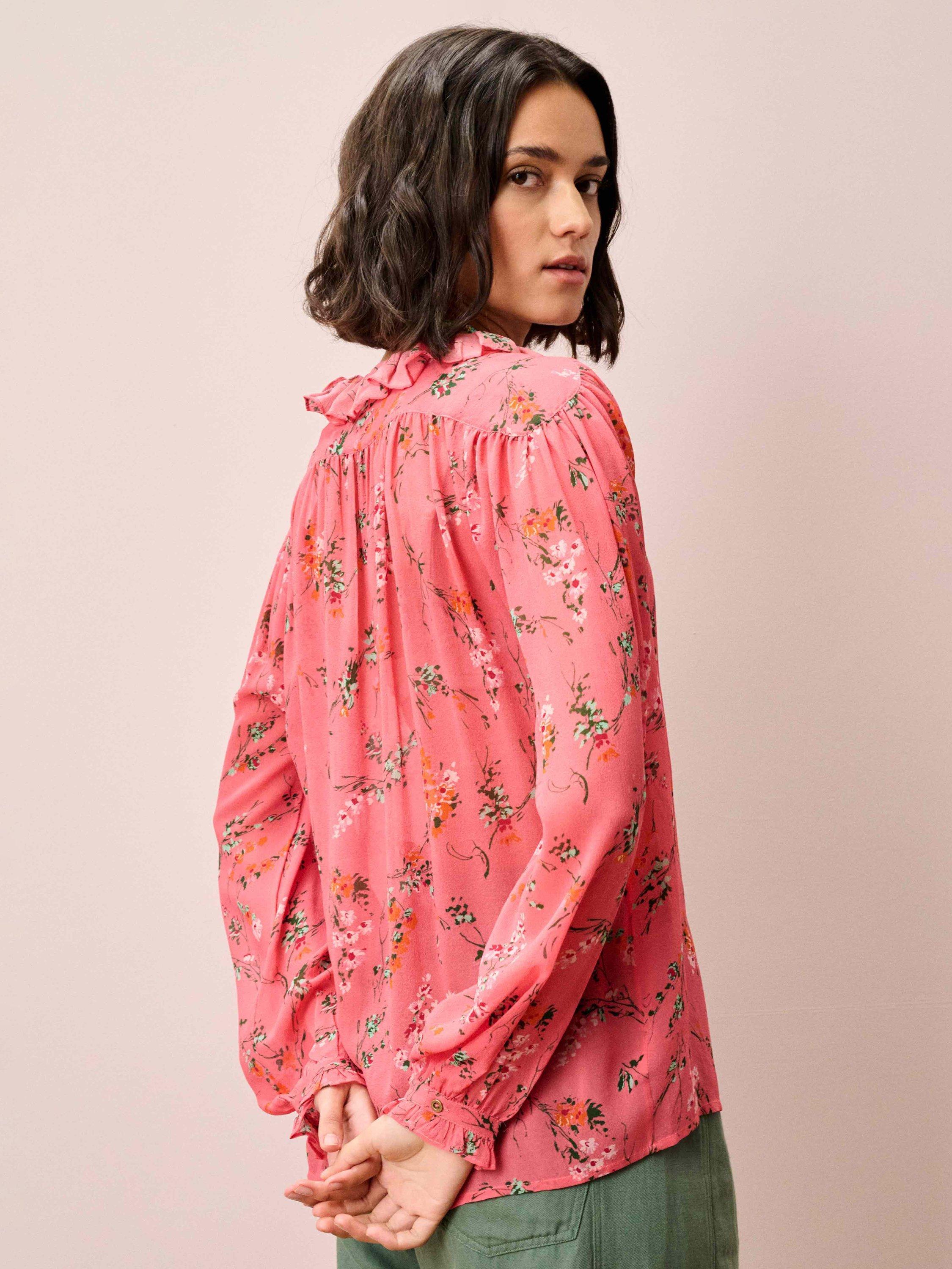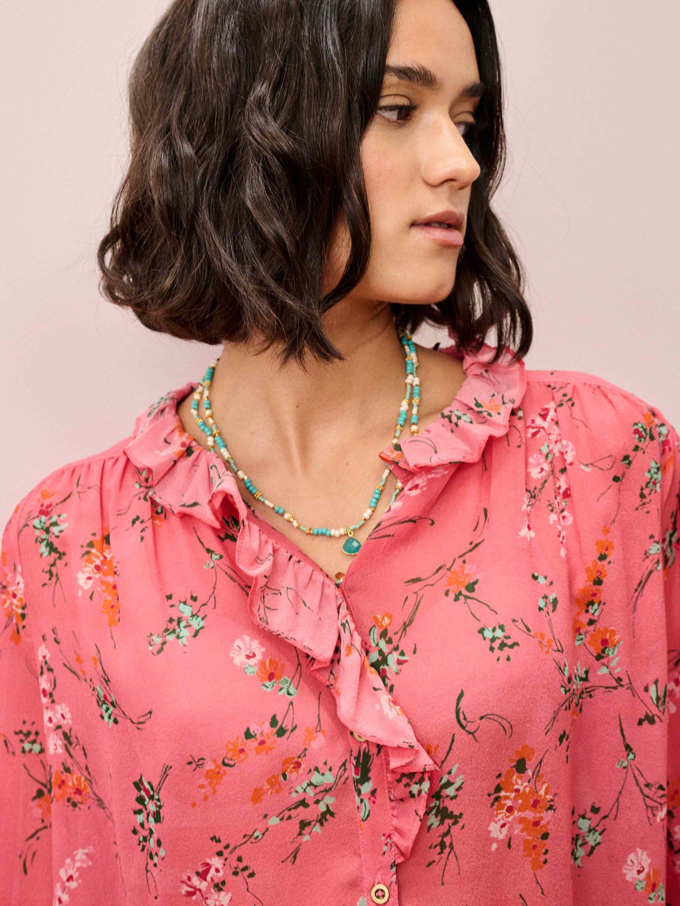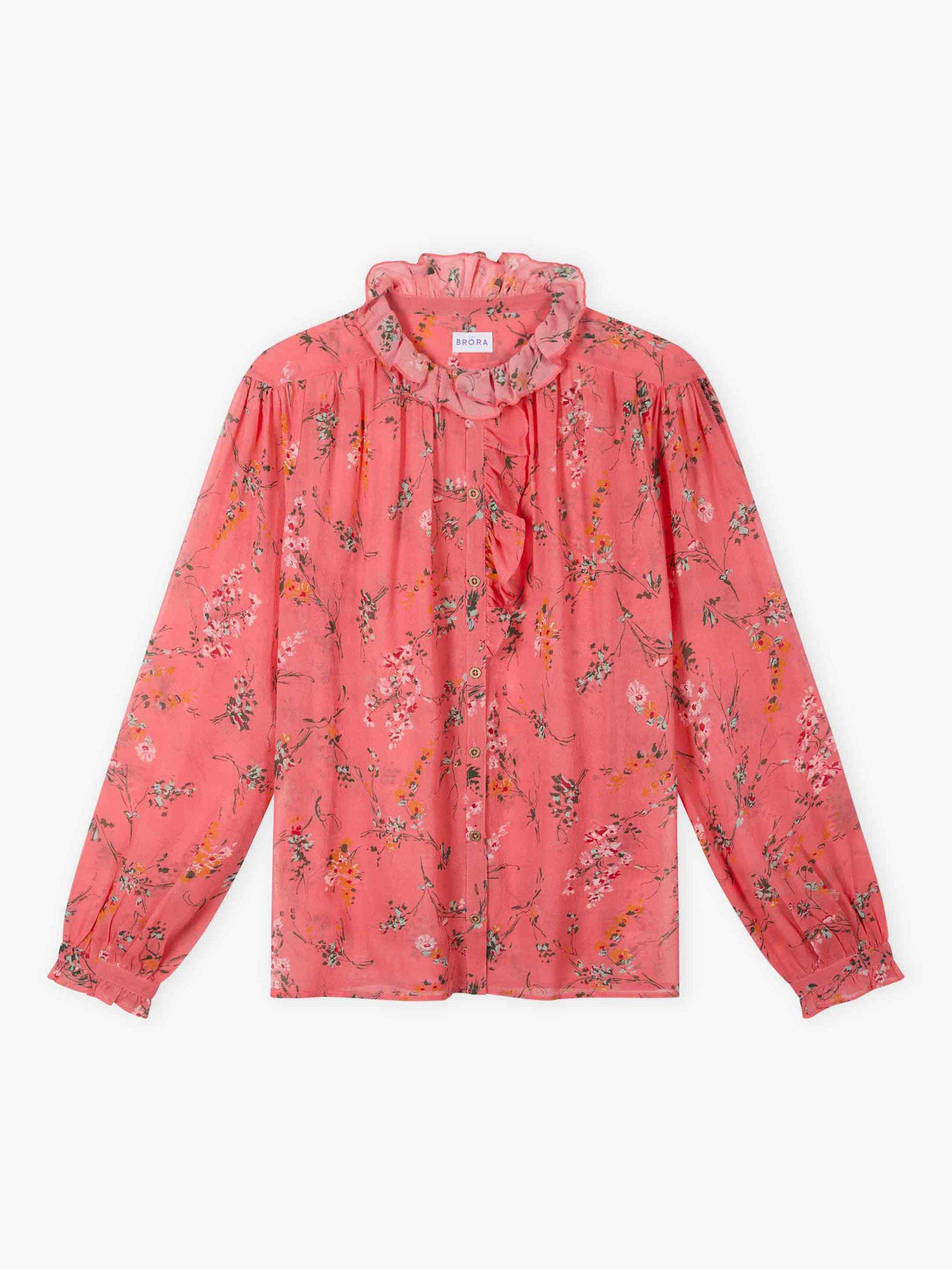 Made from a sumptuous silk georgette fabric, this adaptable blouse shape, adored for its charming, frilled neckline and placket, has been reimagined into a colour-clashing botanical print for Spring-Summer.