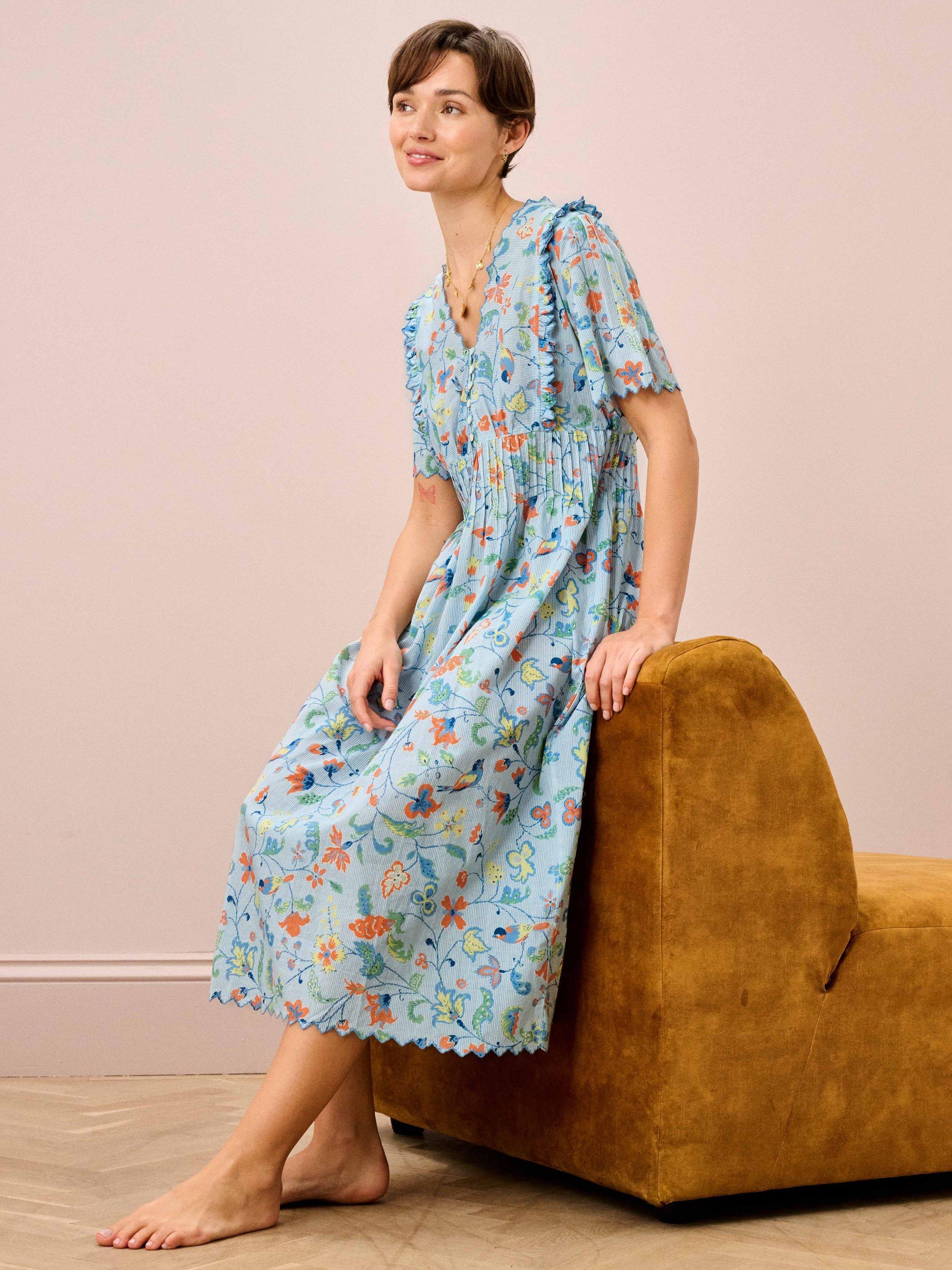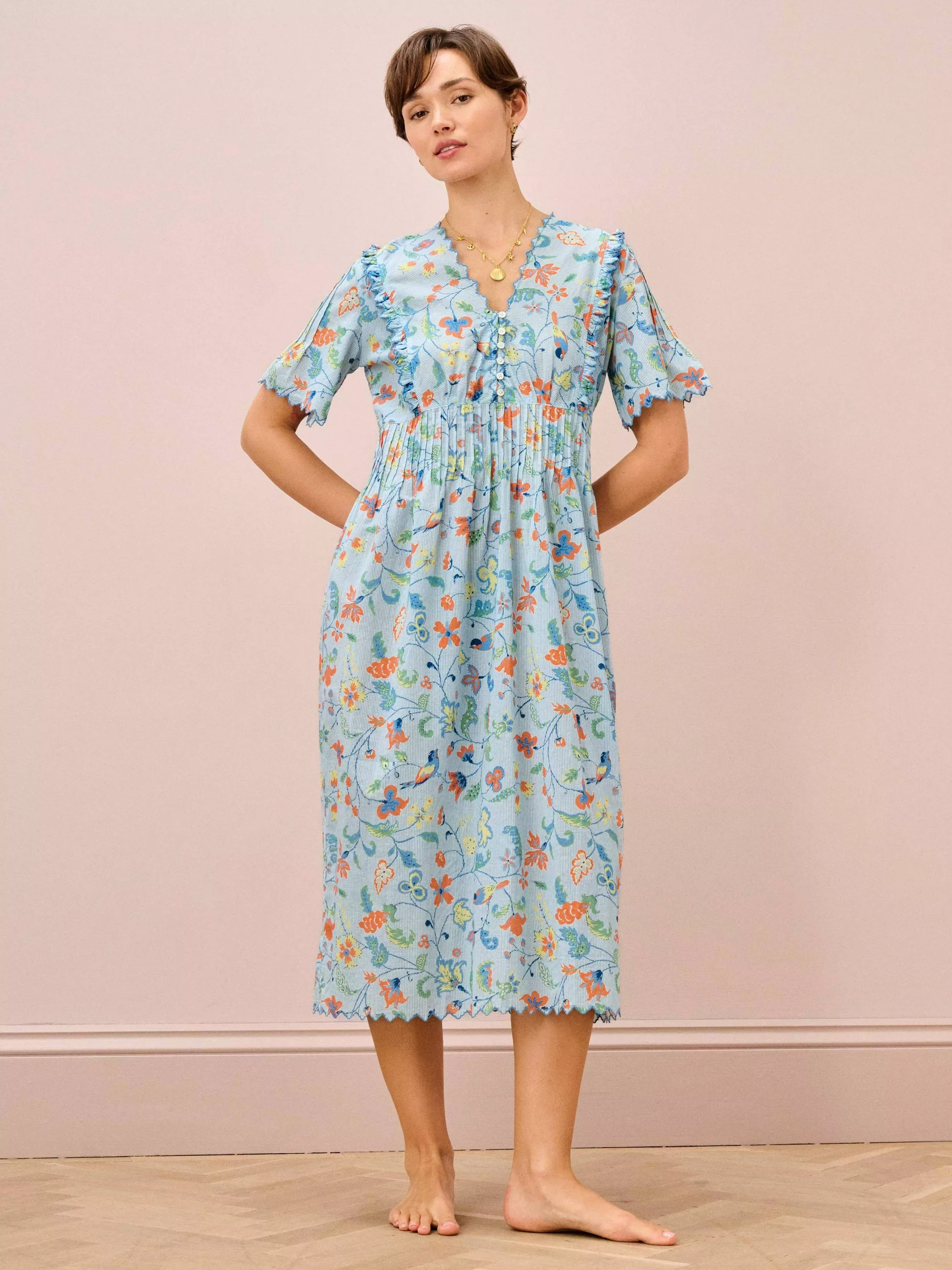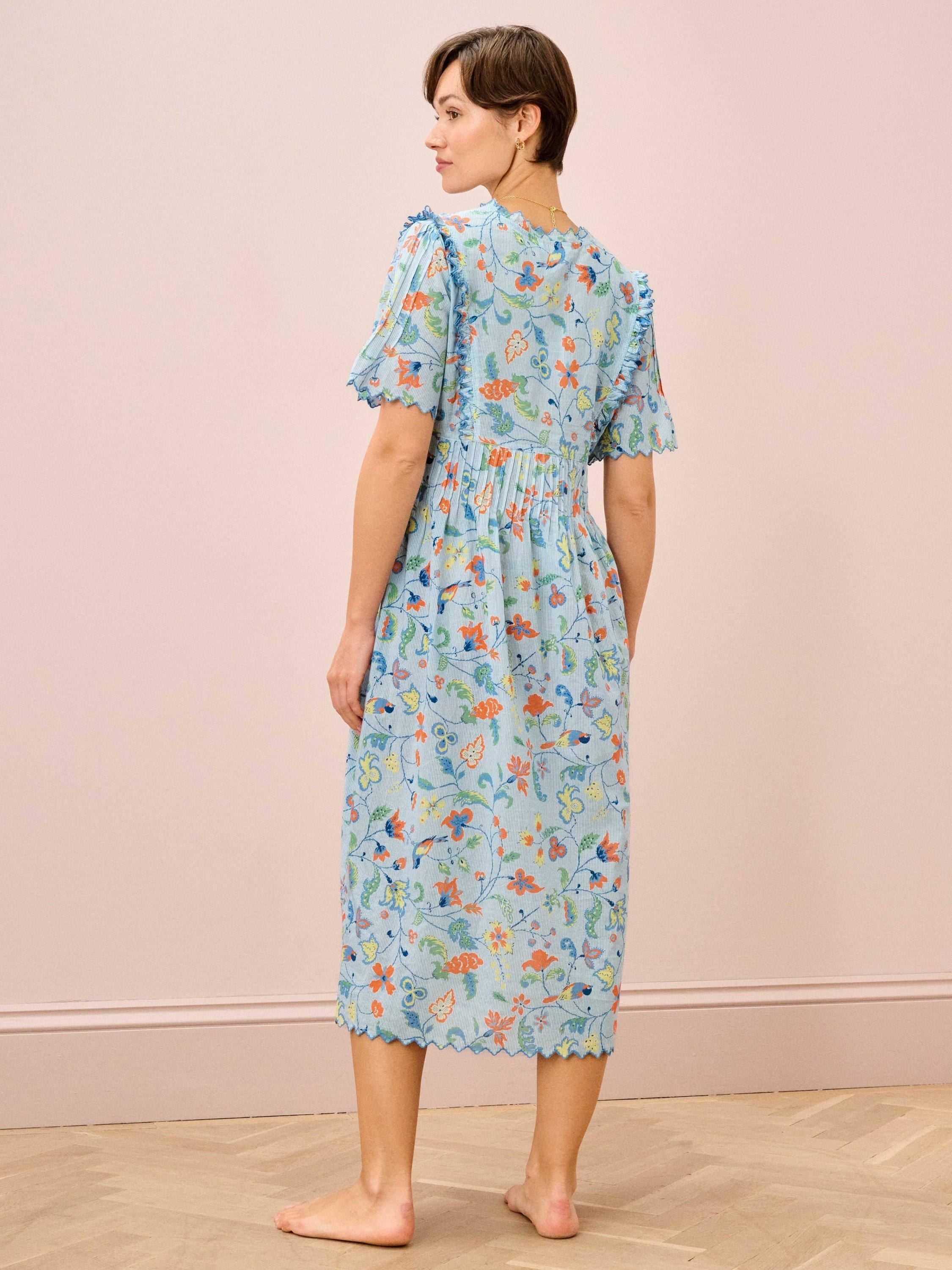 Made from breathable cotton, the mood-boosting Botanical Print Nighty features a scalloped V-neckline with buttons to the waist, intricately stitched pintucks and broderie anglaise frill details to finish.