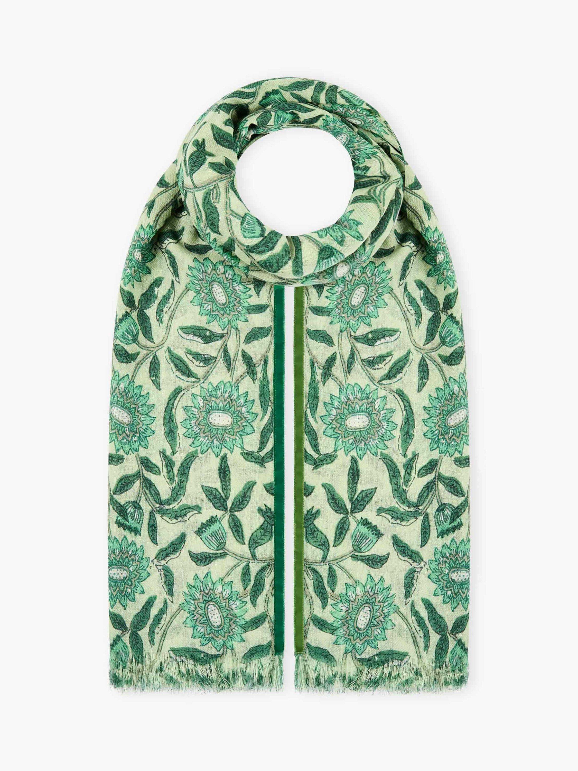 Expertly woven from the finest natural wool yarn, this striking stole is the ultimate outfit lifter and collector's piece, showcasing a colourful botanical print with luxurious, contrasting velvet trims to finish.