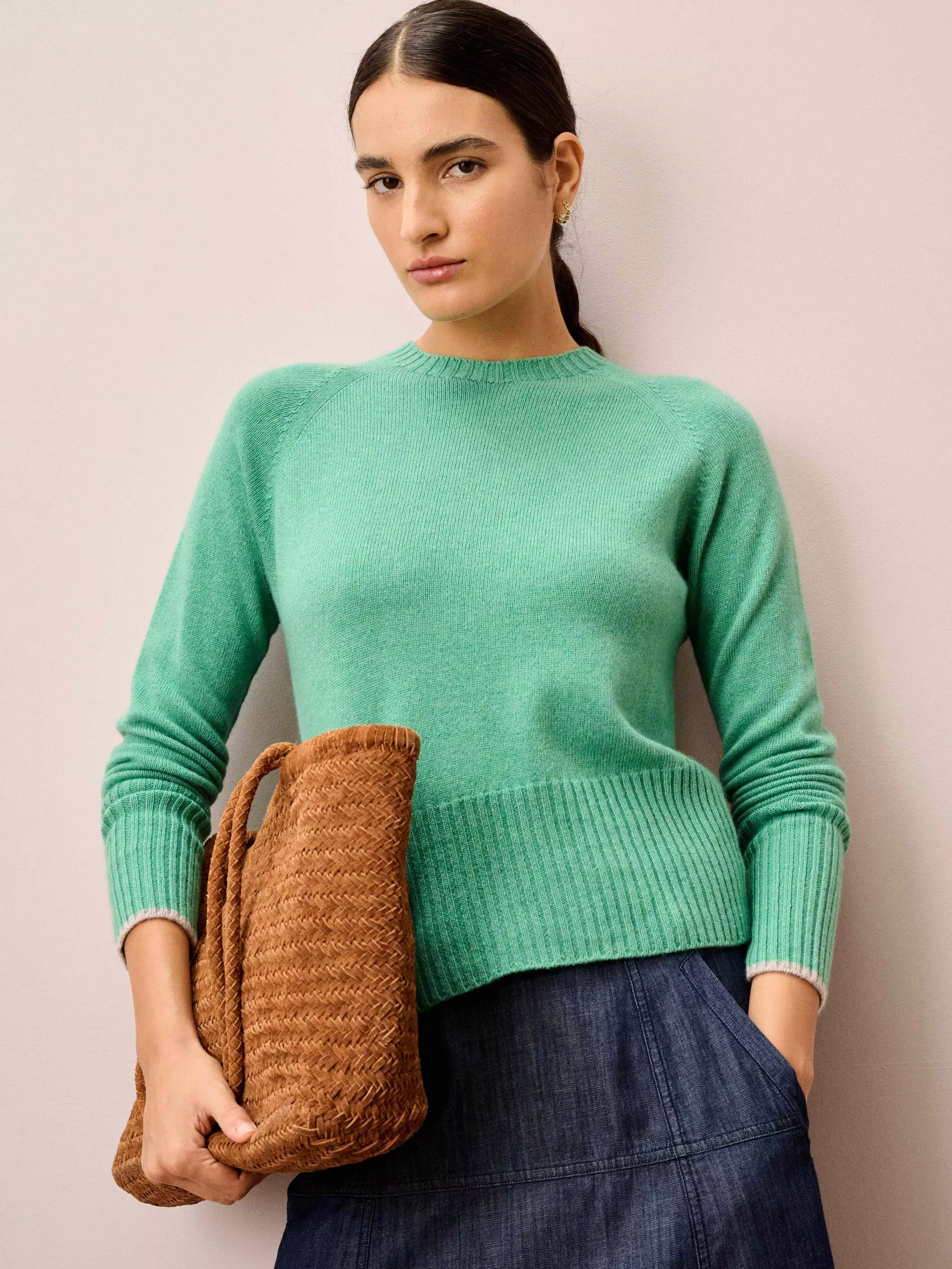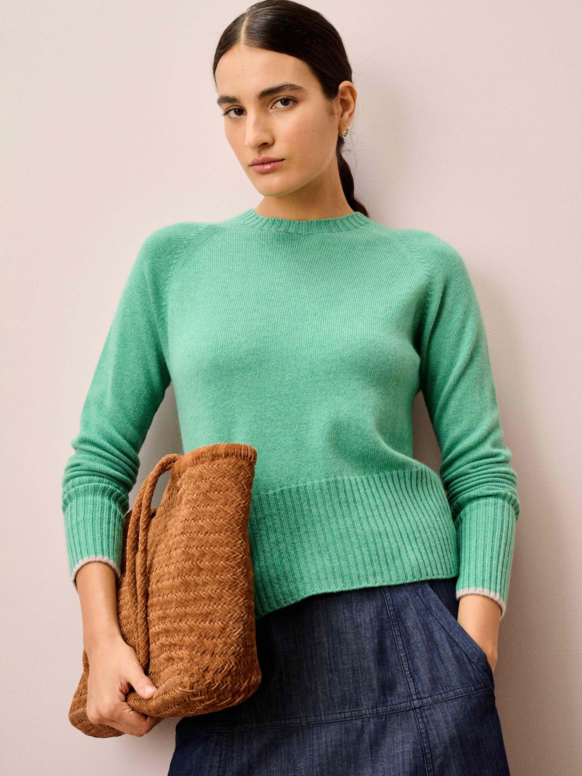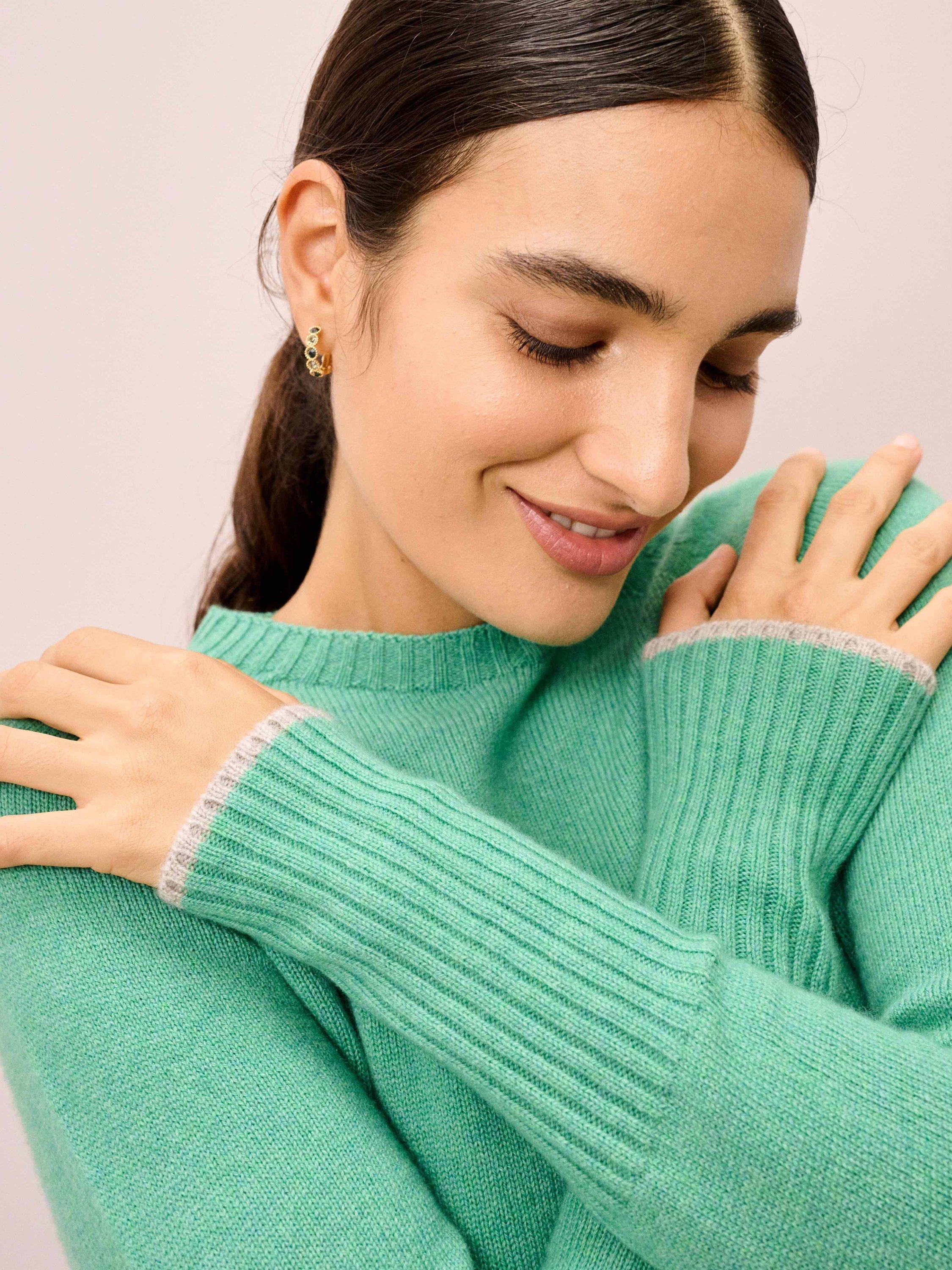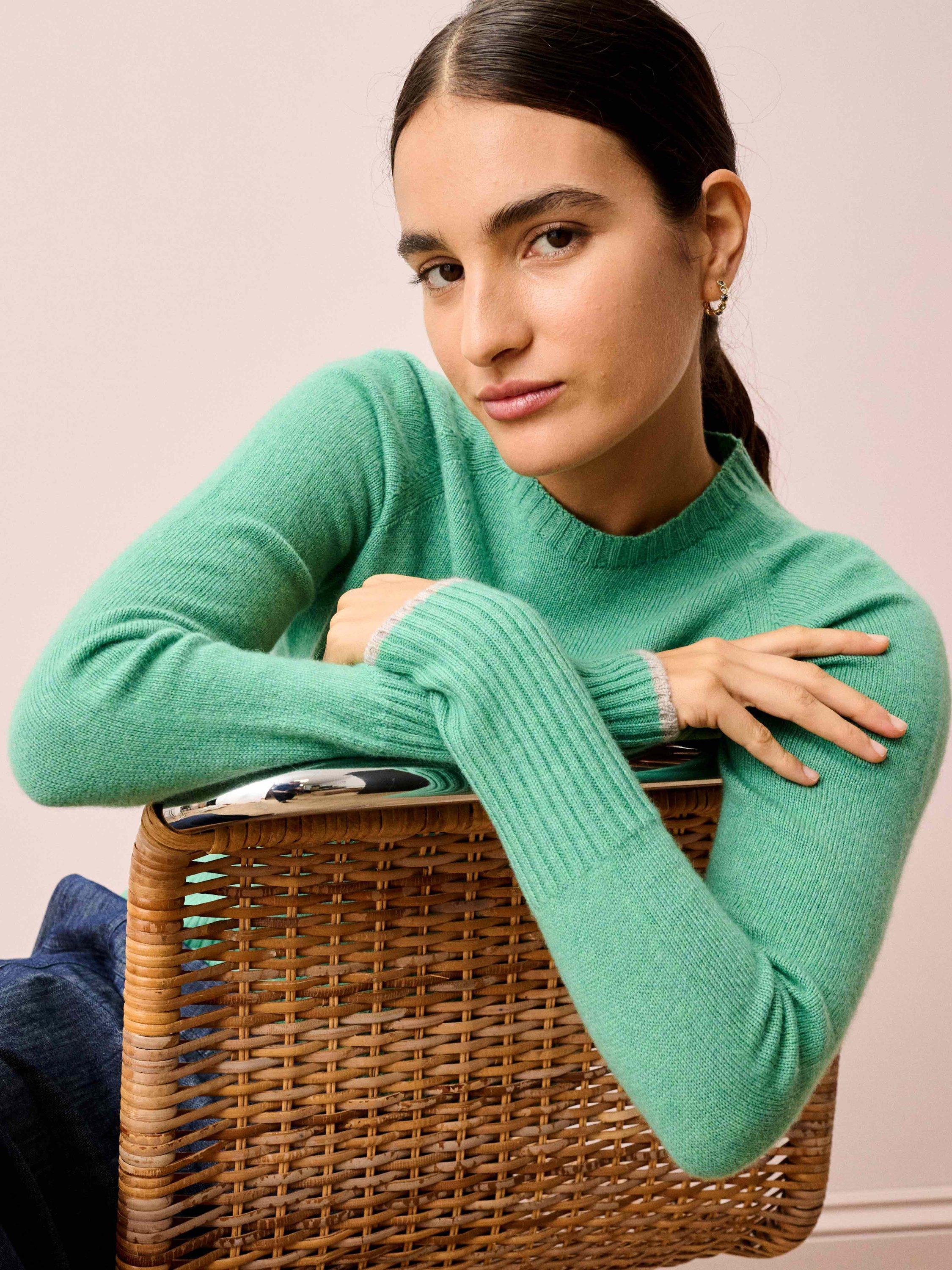 Knitted in Scotland using whole-garment machine technology, these super-flattering cashmere wonders are utterly adored for their neat-fitting, deep-rib waist, high round neckline and contrasting pop on the cuffs.