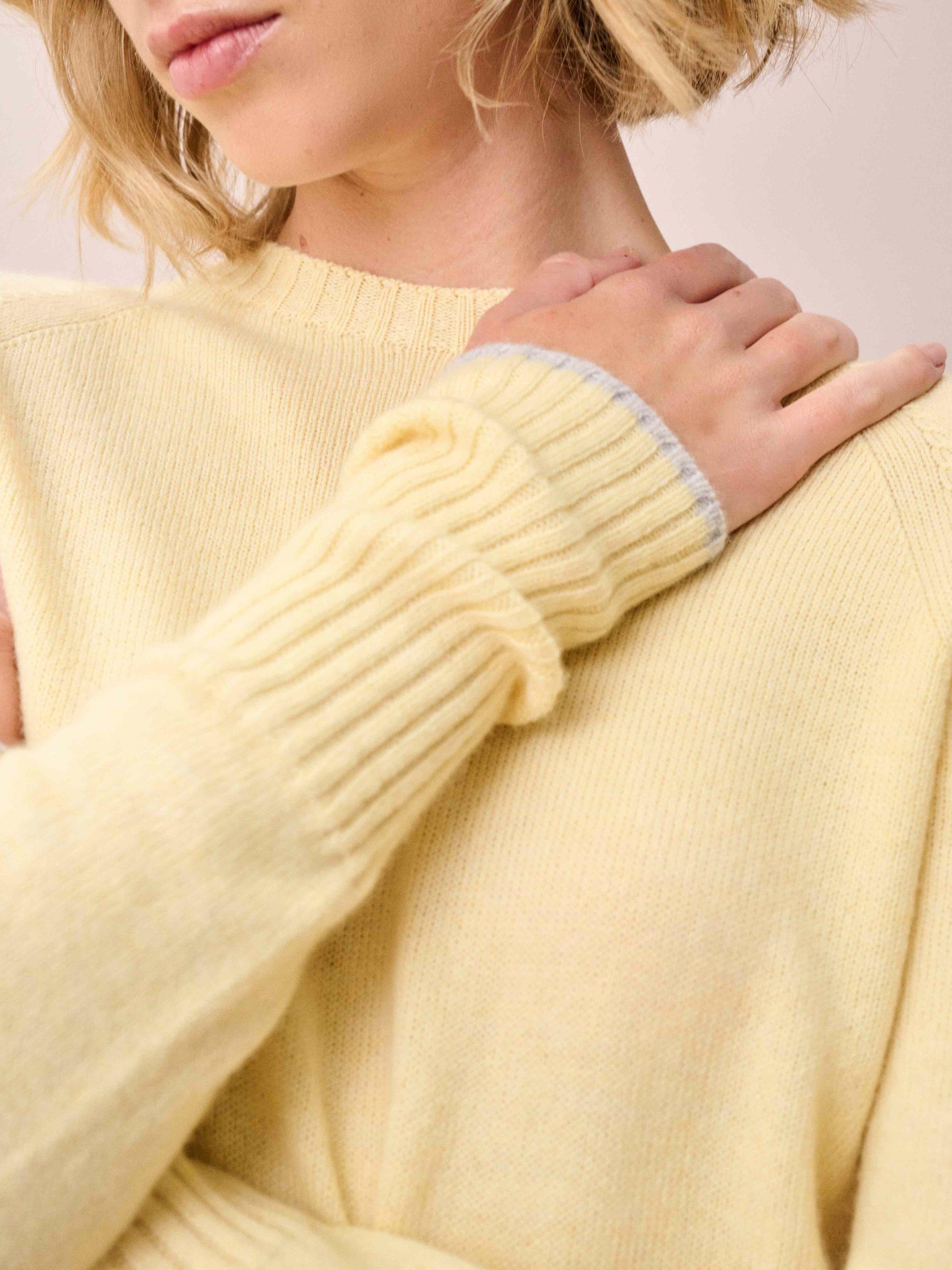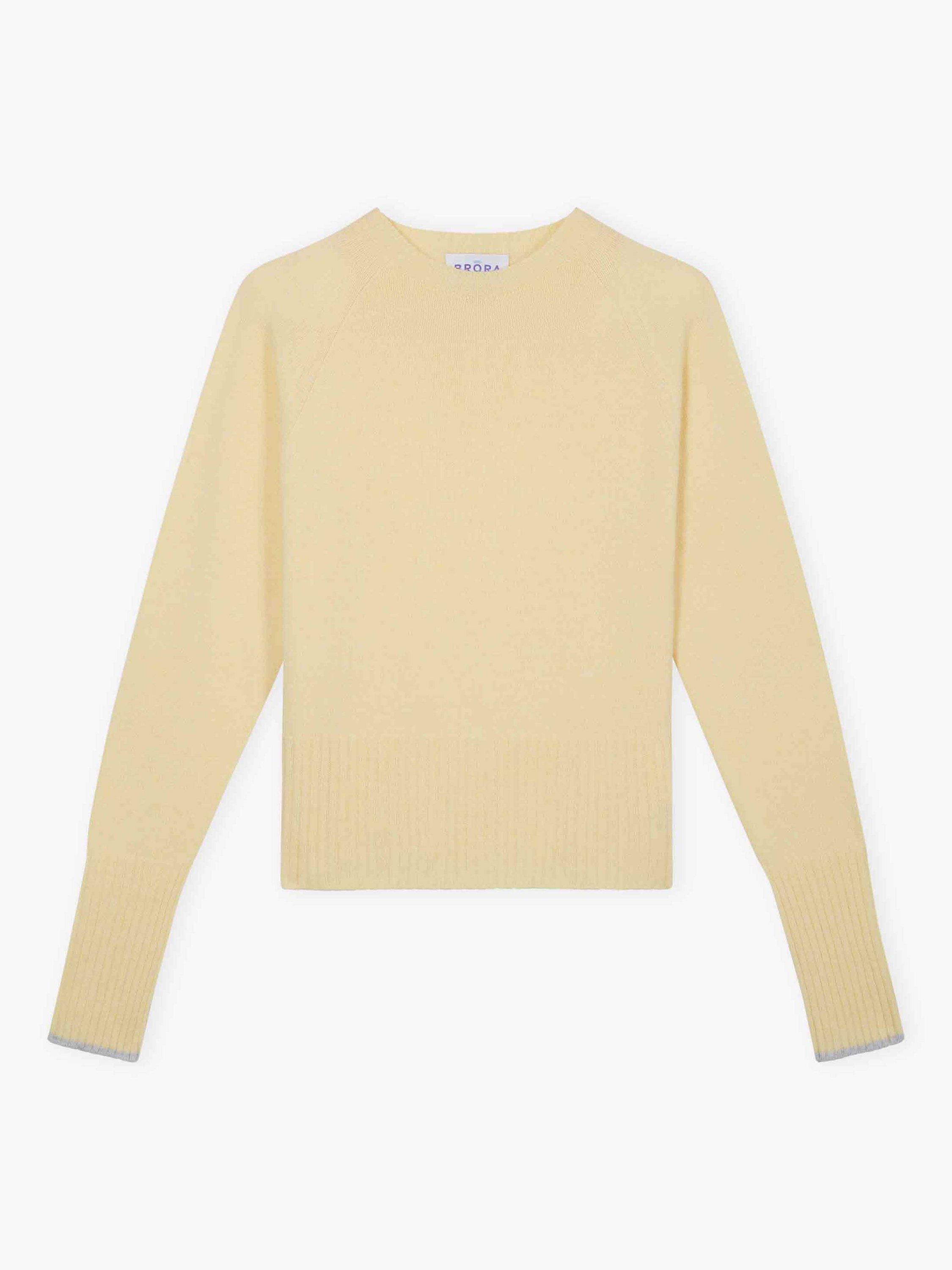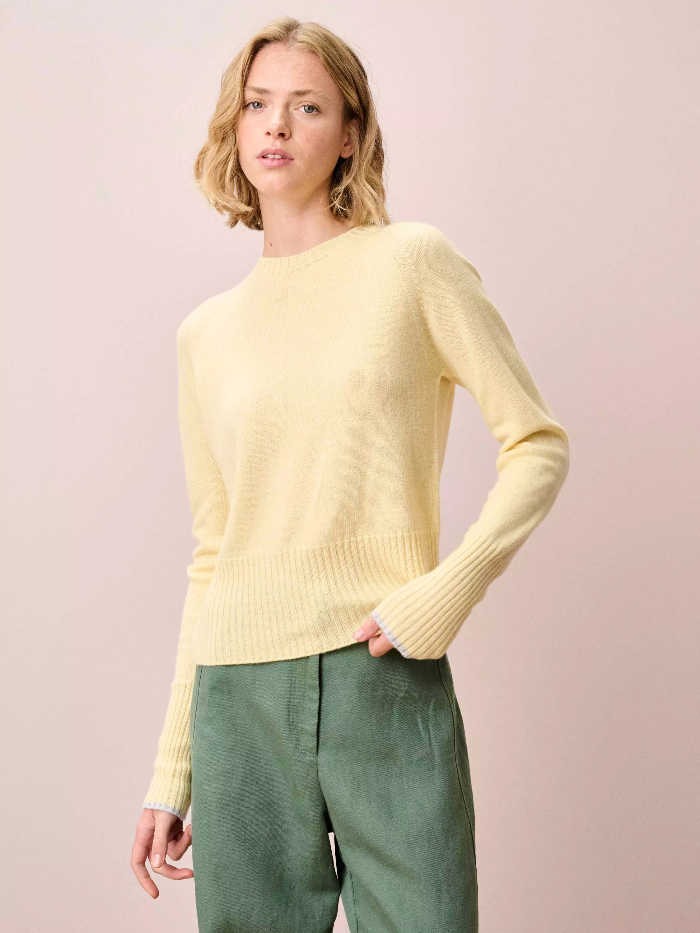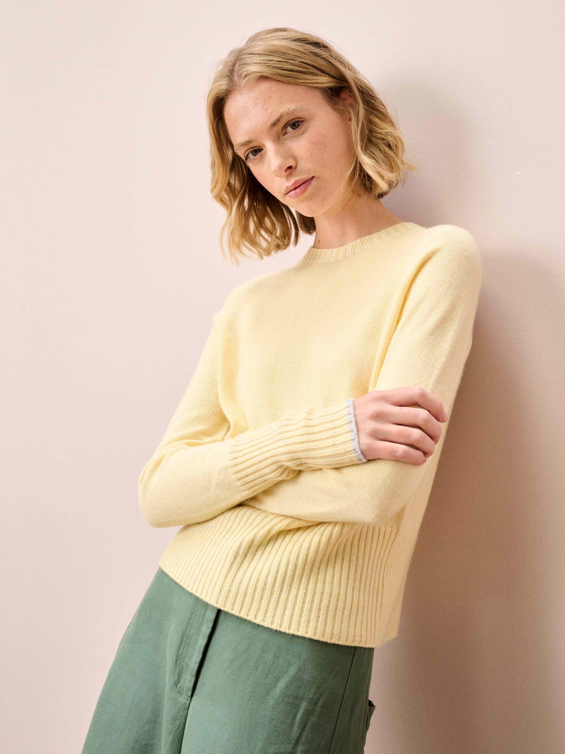 Knitted in Scotland using whole-garment machine technology, these super-flattering cashmere wonders are utterly adored for their neat-fitting, deep-rib waist, high round neckline and contrasting pop on the cuffs.