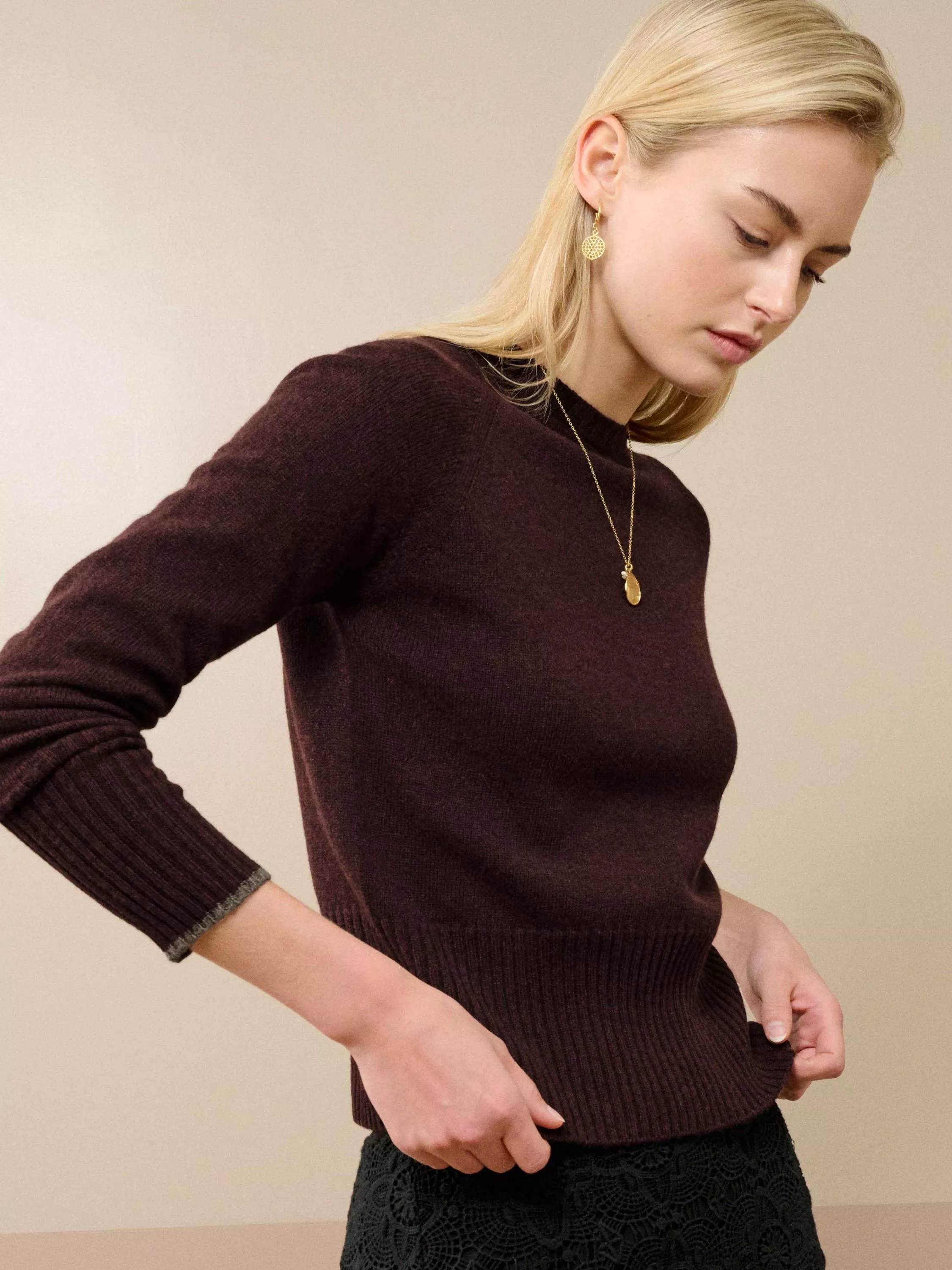 Knitted in Scotland using whole-garment machine technology, these super-flattering cashmere wonders are utterly adored for their neat-fitting, deep-rib waist, high round neckline and contrasting pop on the cuffs.