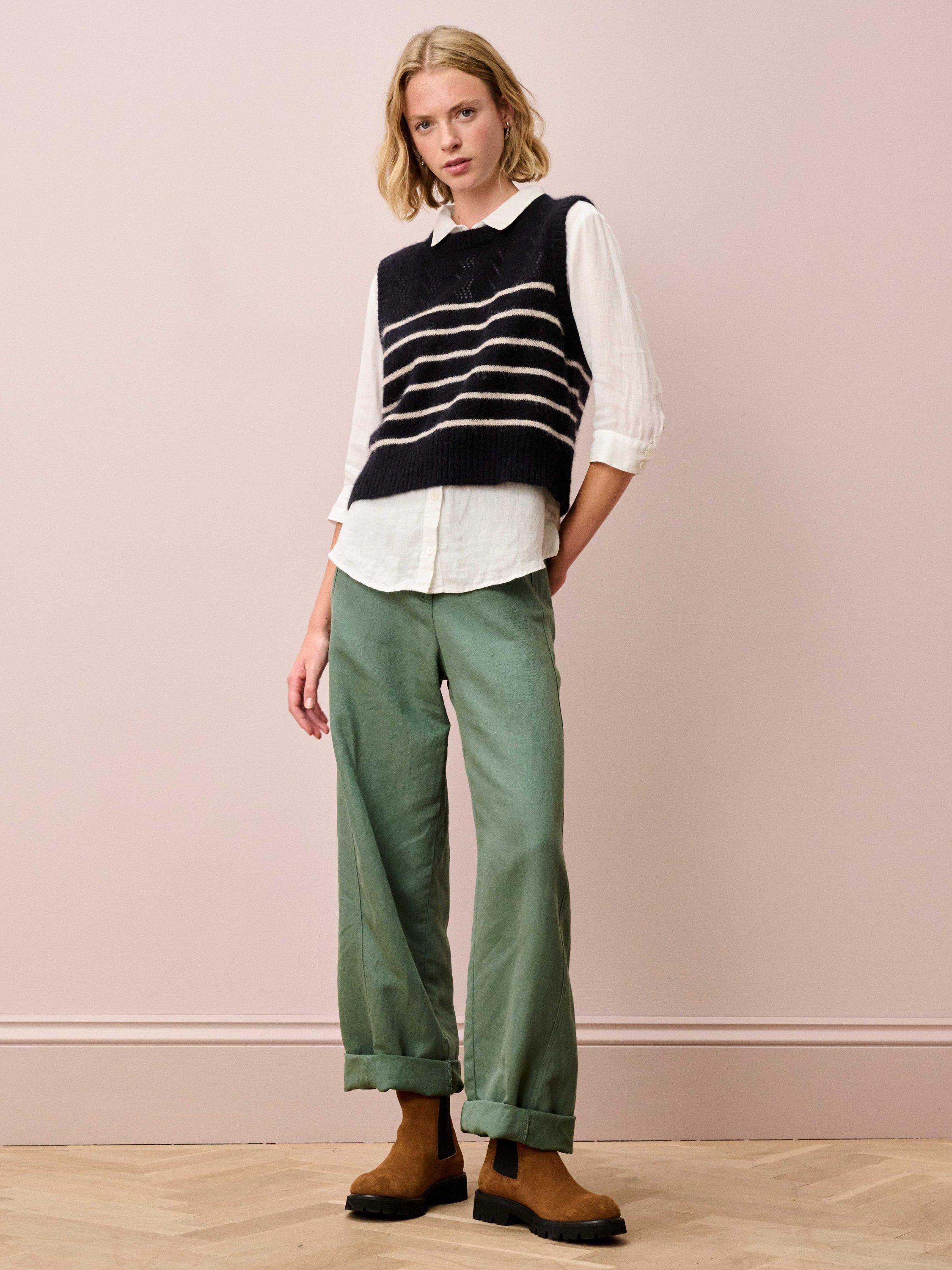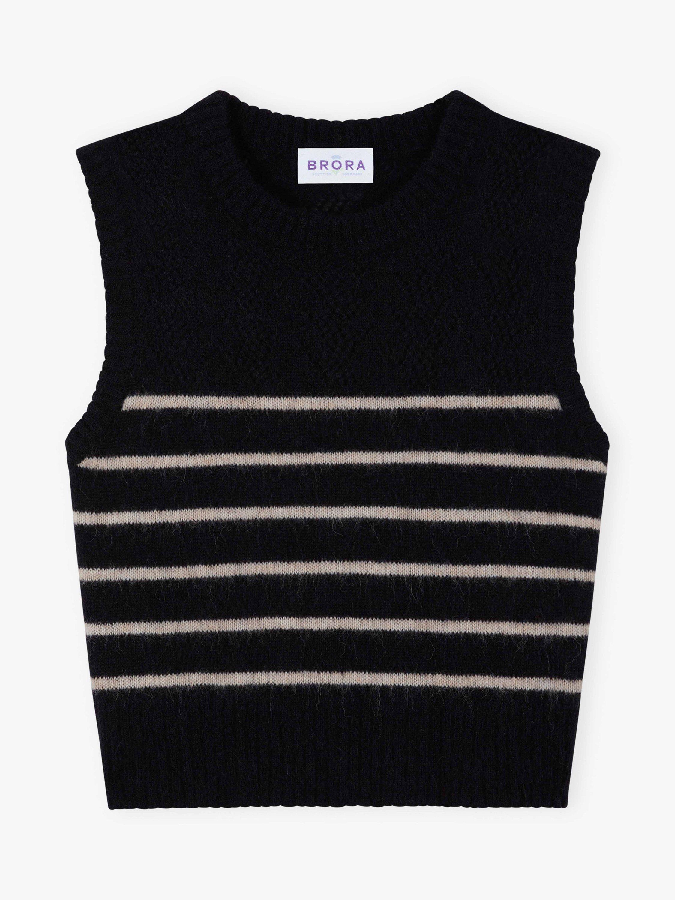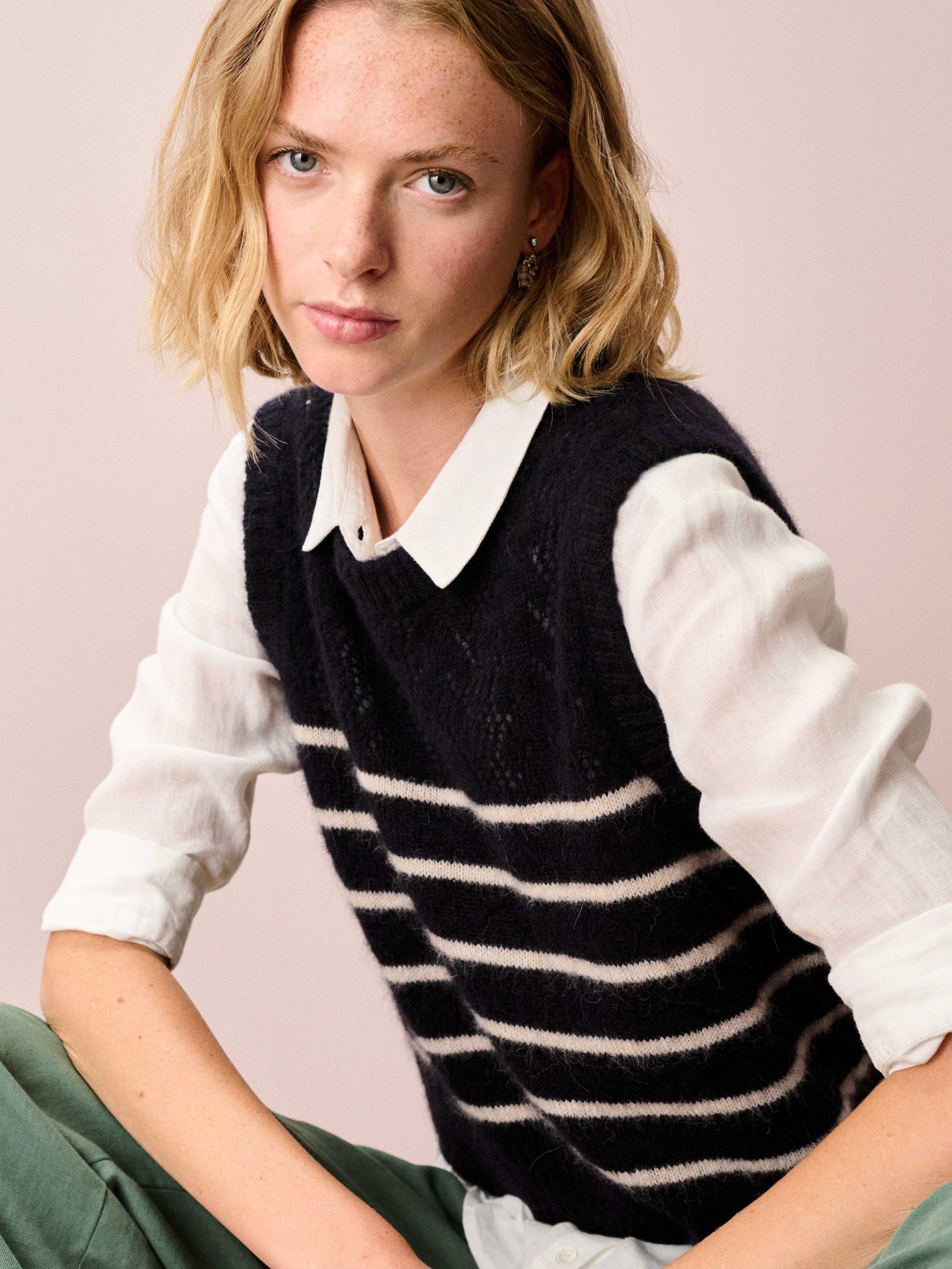 With a gorgeous pointelle yoke and statement Breton stripes, this layer is truly a cut above the rest, knitted in Europe from a supersoft alpaca-merino blend using only the finest yarns spun by trusted specialists in Italy.