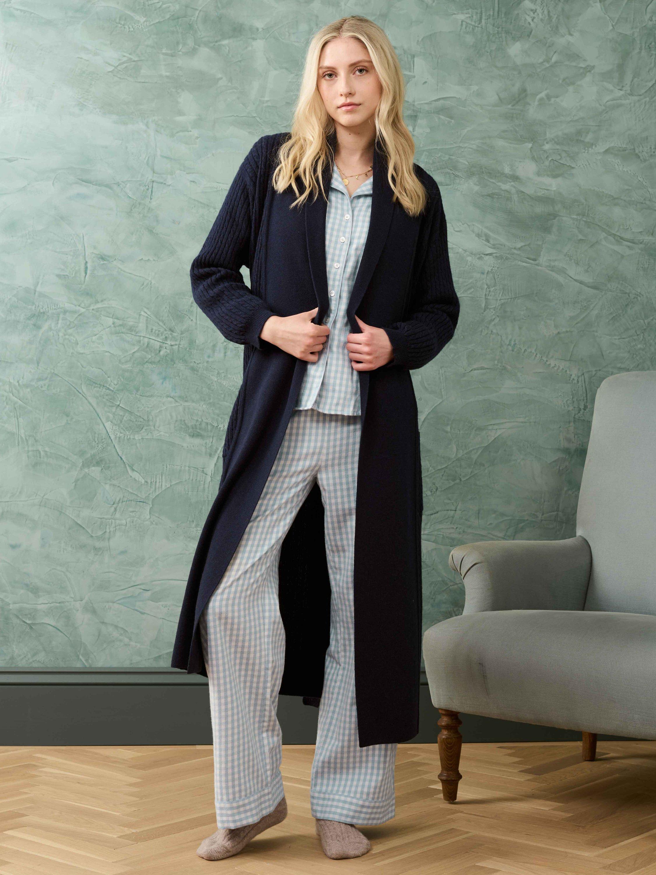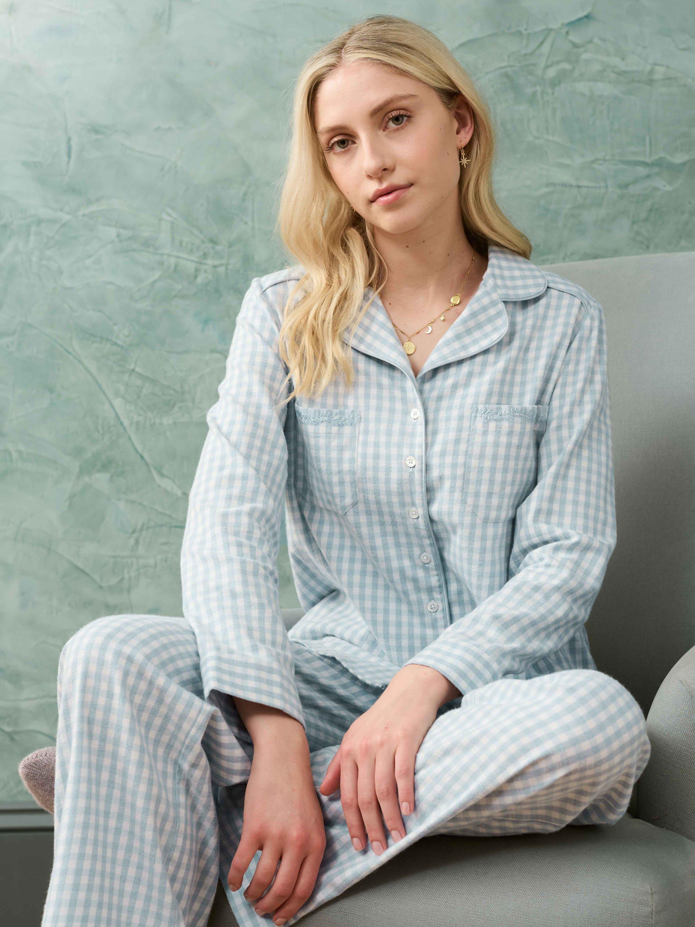 Expertly designed in-house, this pyjama set has been made from butter-soft brushed cotton. With a dreamy check, silk satin piping details, an elasticated drawstring waist and intricate hand embroidery on the pockets.