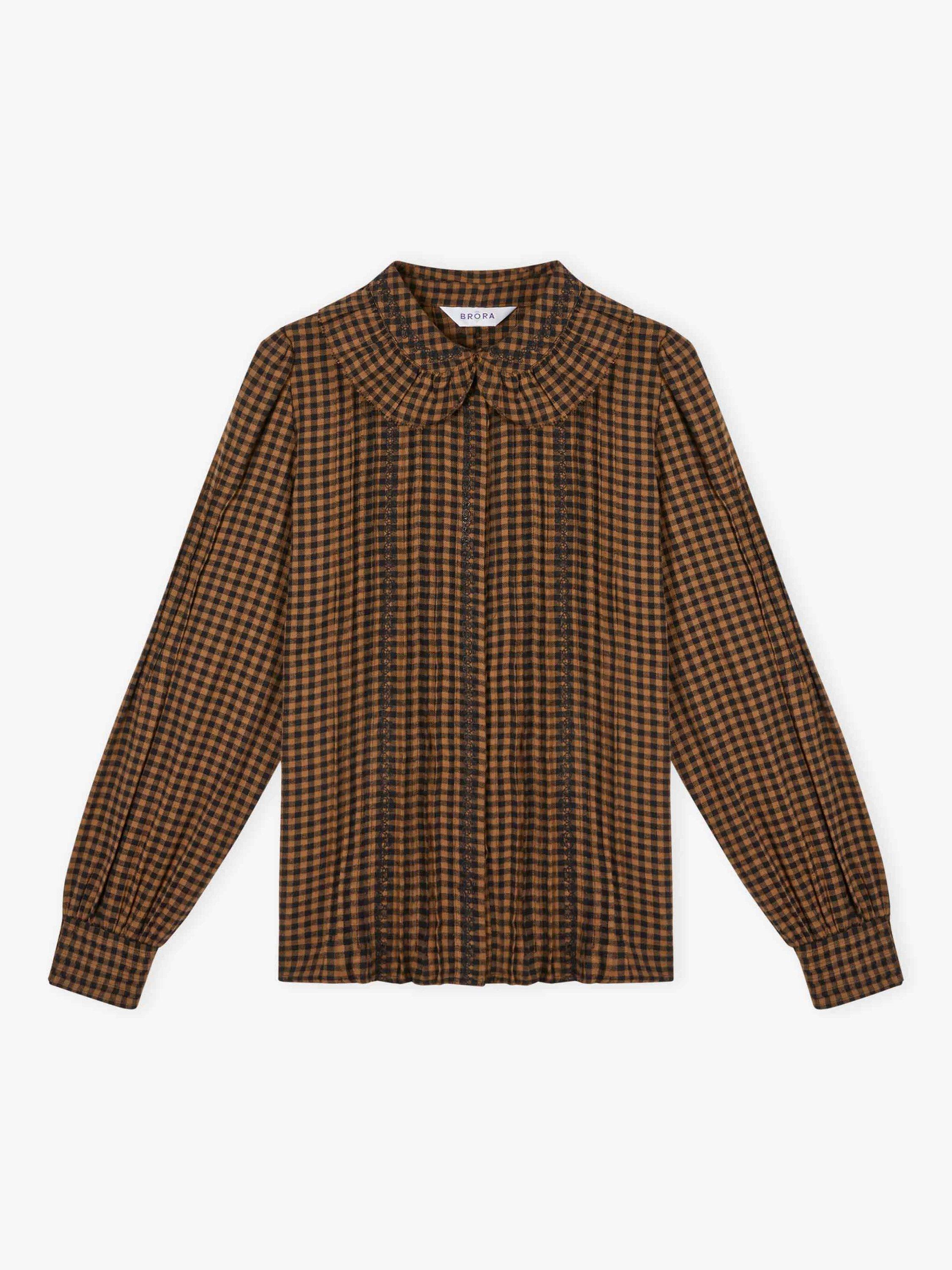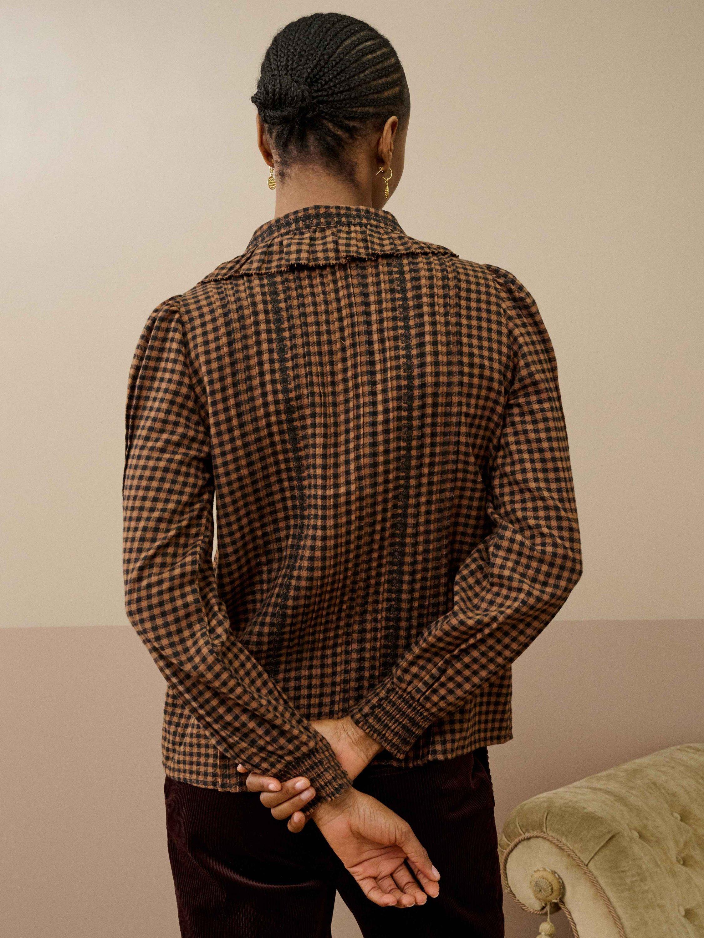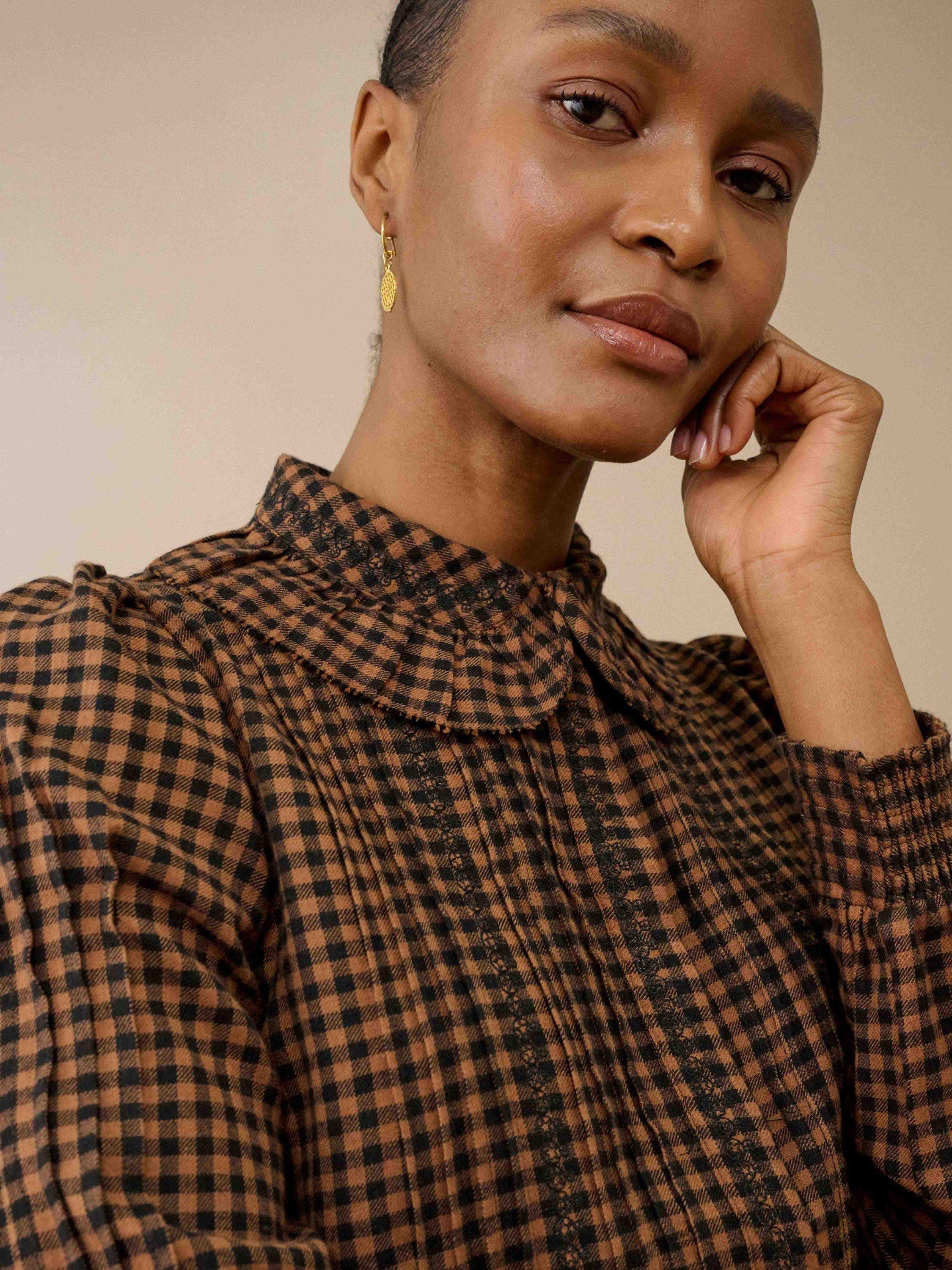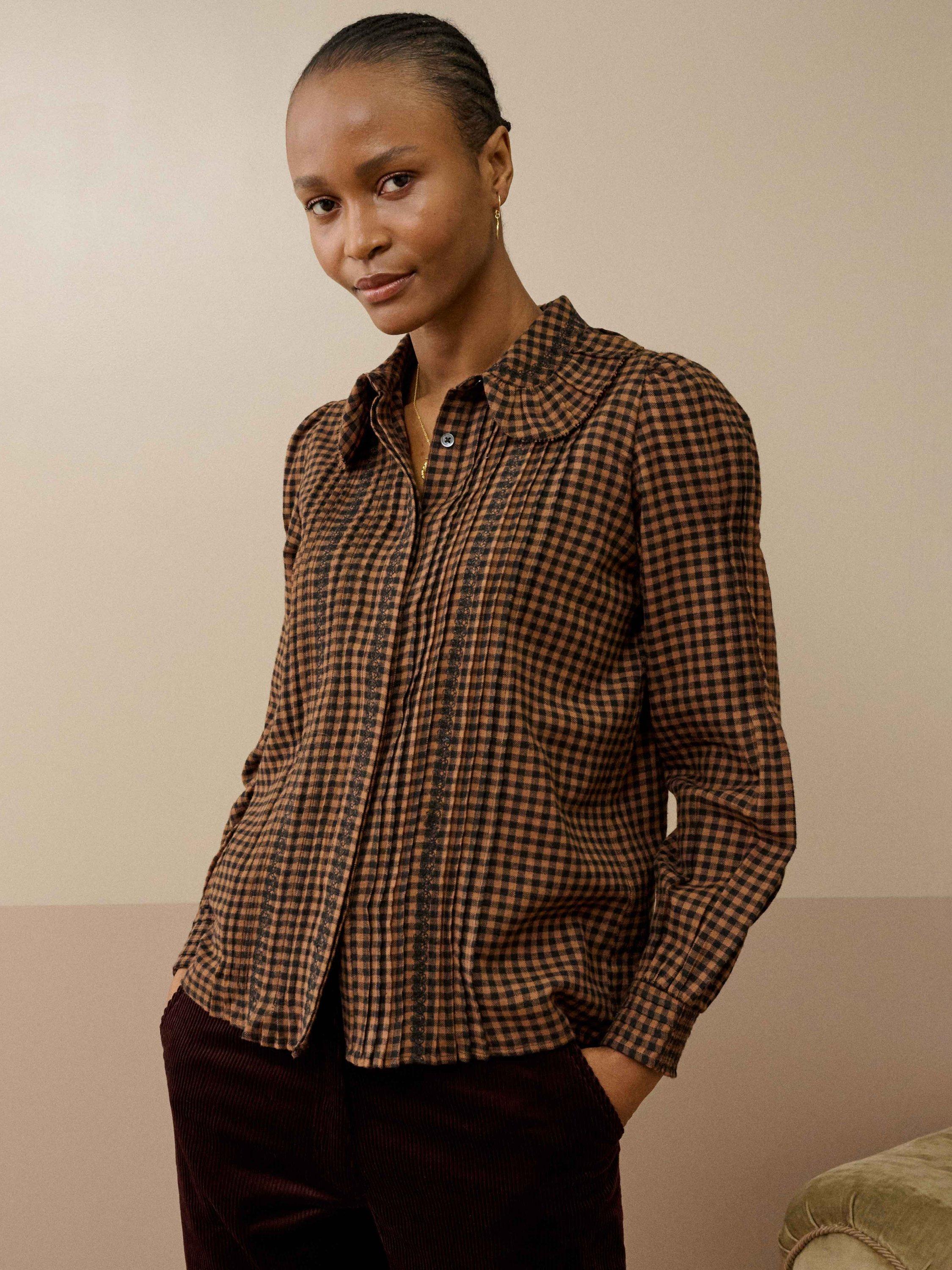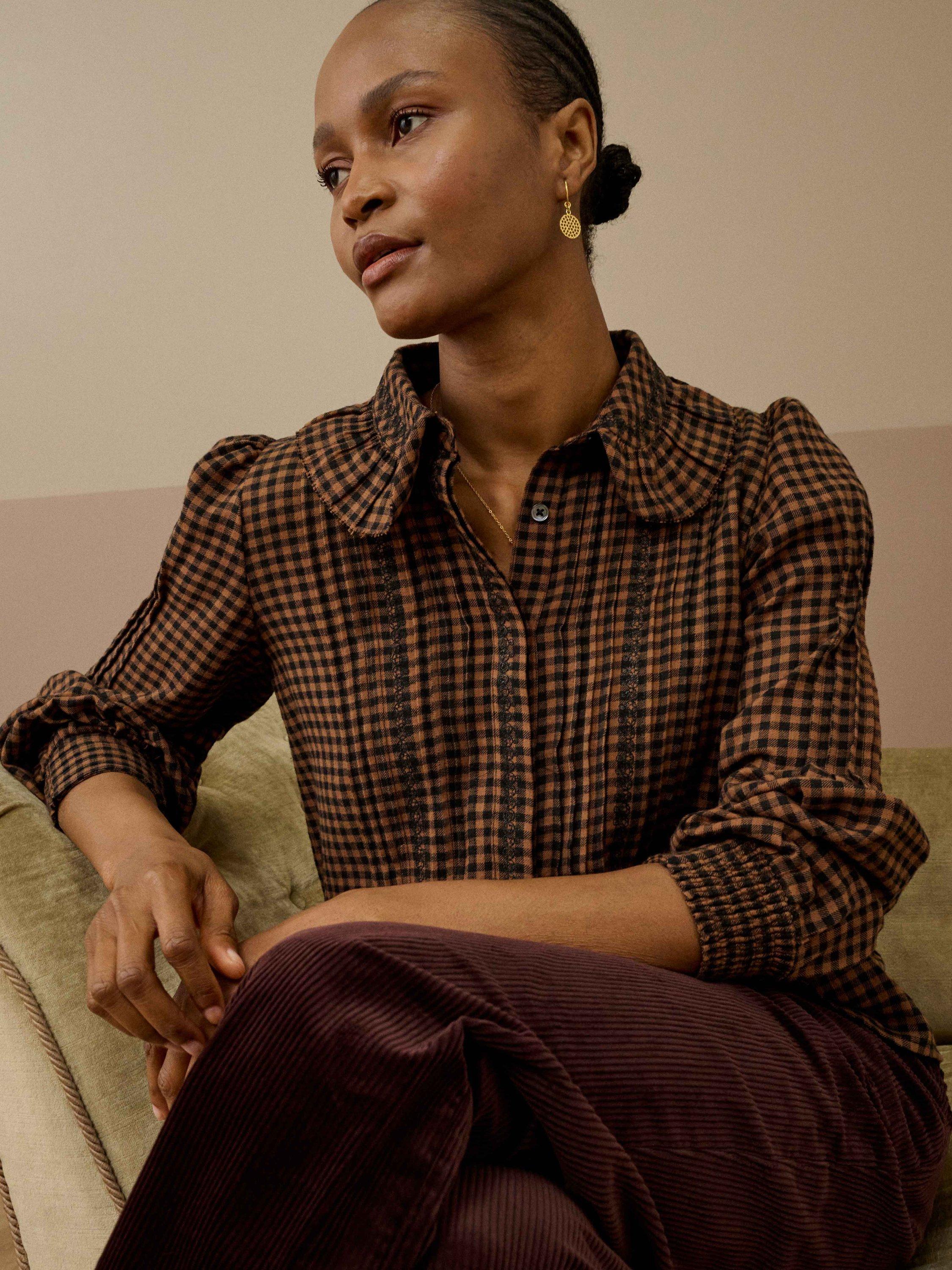For fans of Brora's gingham collection, this brushed cotton addition is brimming with thoughtful touches you'll love, such as a statement frill collar, trailing embroidery and pin-tucks galore!