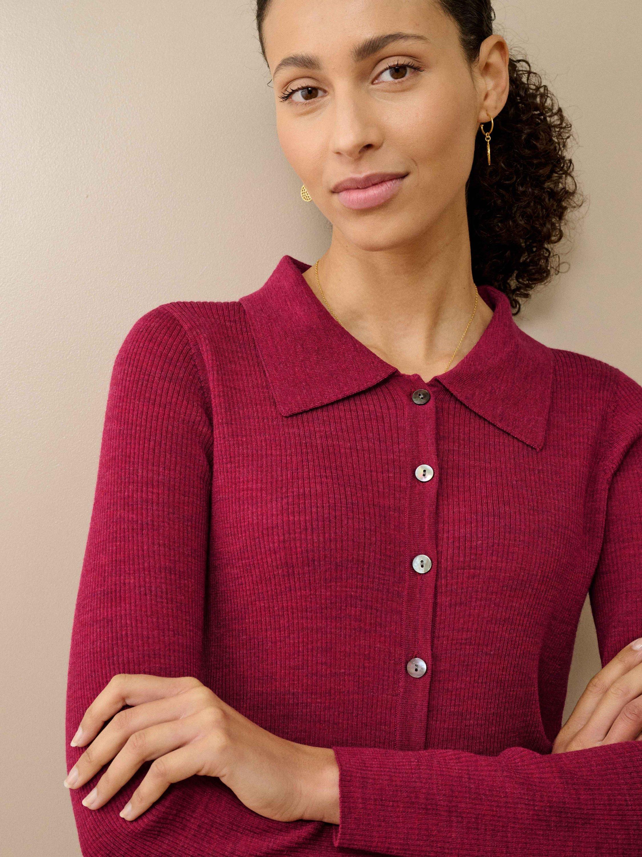 These seriously chic pure merino wool cardigans showcase a statement collar, contrast buttons, a flattering, neat fit and an all-over textural rib, delivering a contemporary, very Brora twist on a wardrobe classic.