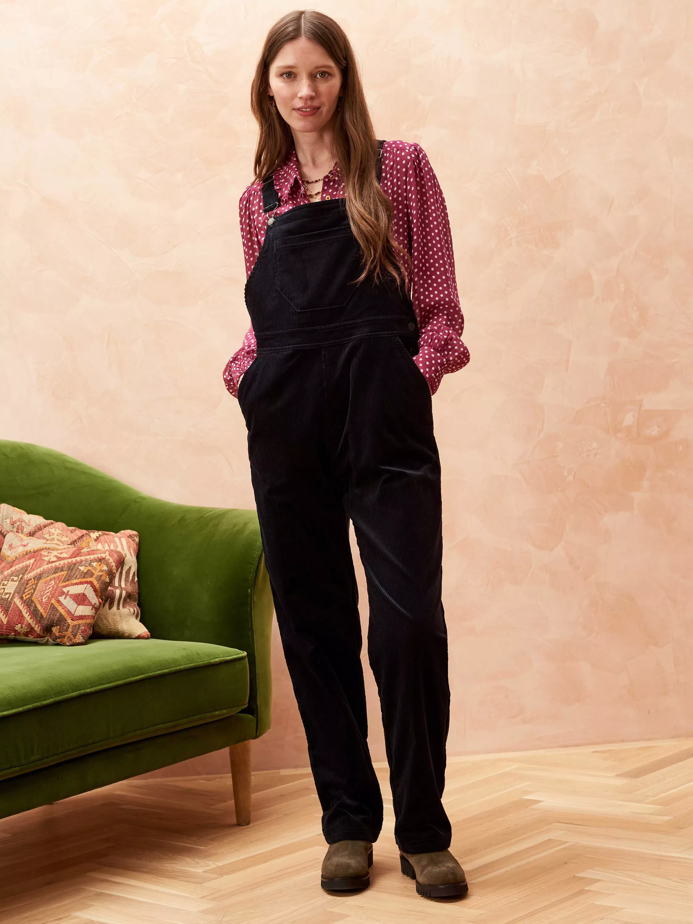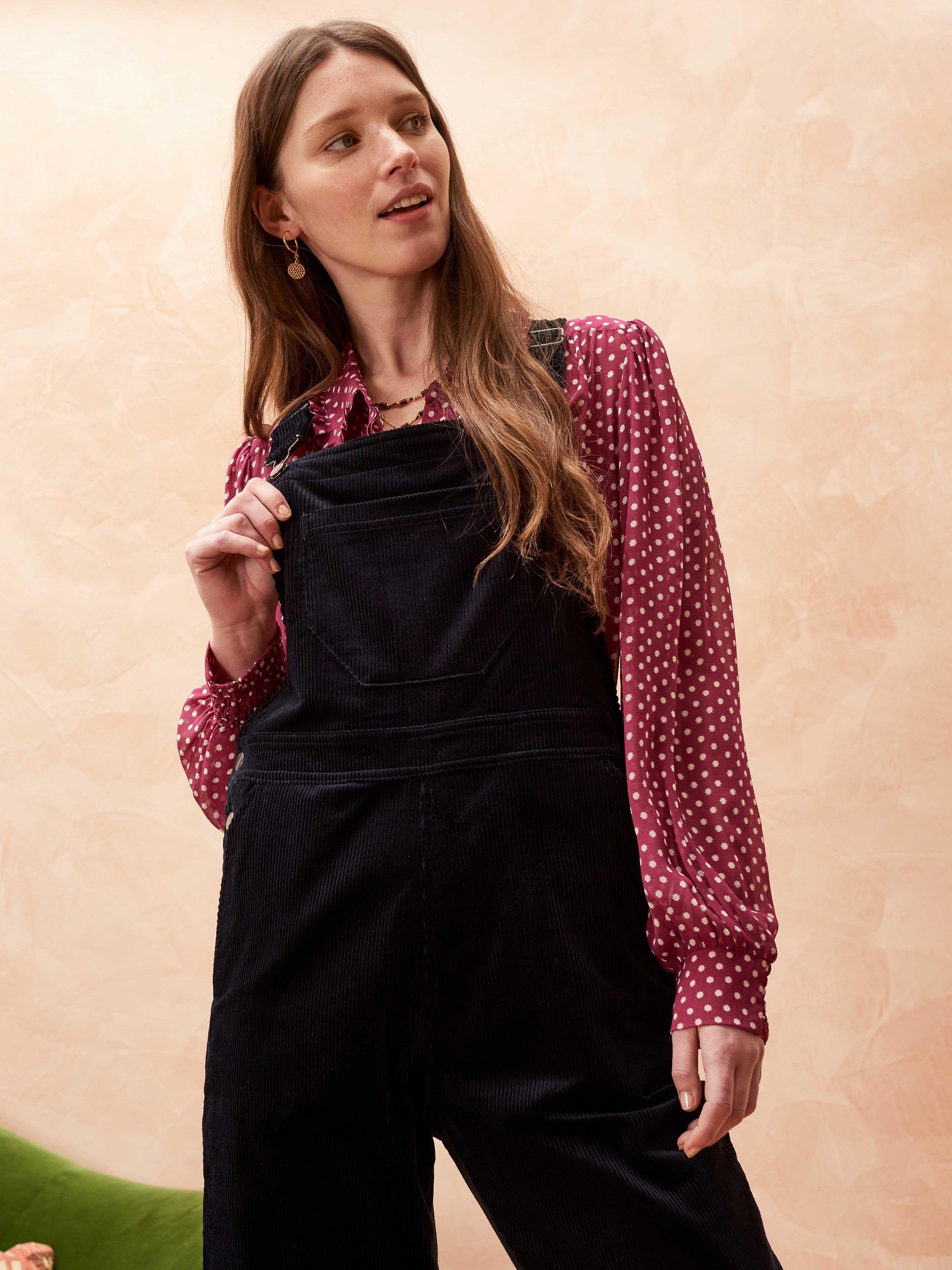 With a flattering square neckline, this pair of dungarees from Brora falls straight through the legs and is constructed from durable cord.