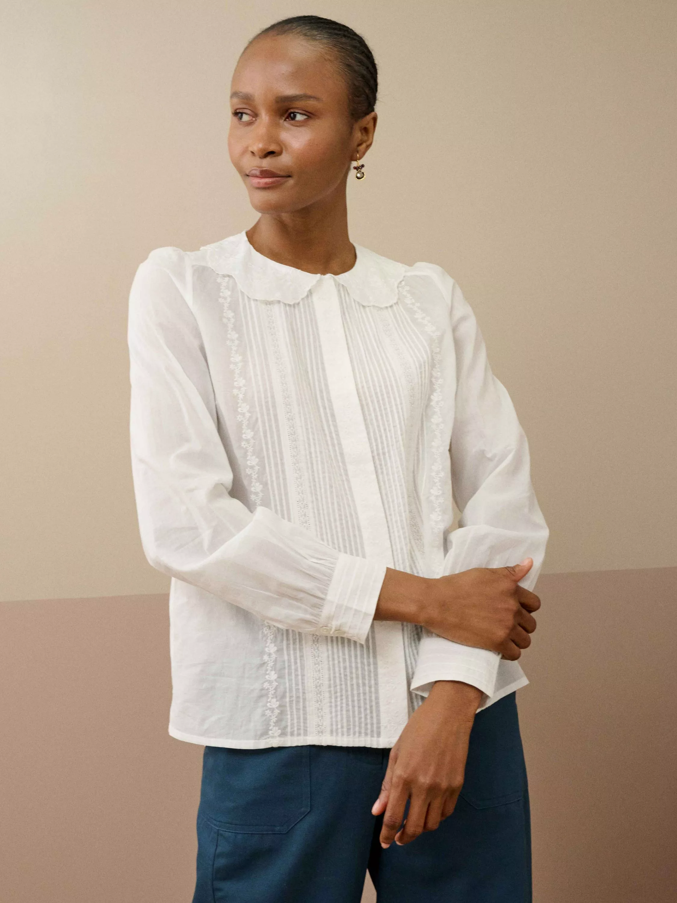 Exclusively developed for Brora and showcasing our penchant for thoughtful design, this cotton blouse features a feminine scallop-edge collar, intricate pin-tucks, tri-button cuffs and pretty floral embroidery.
