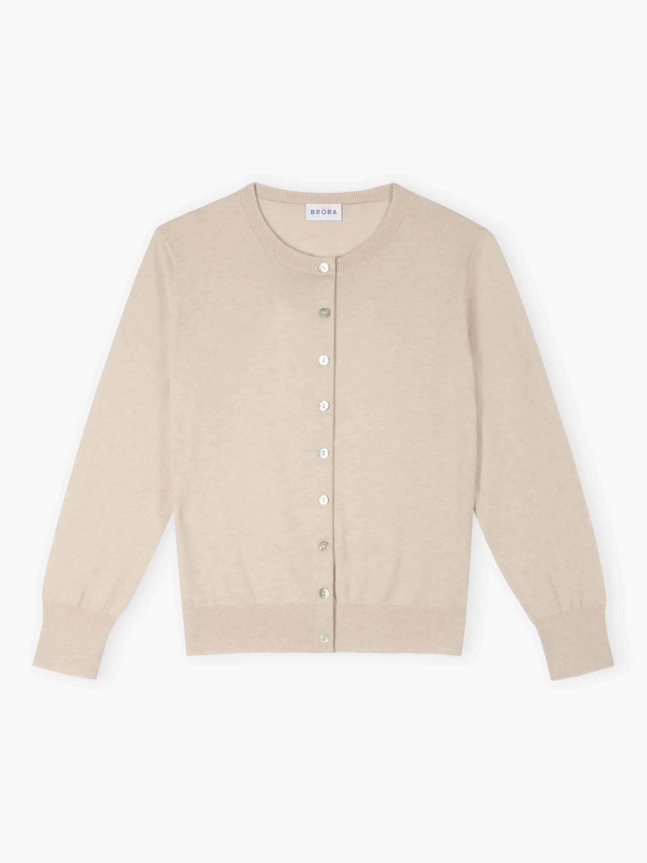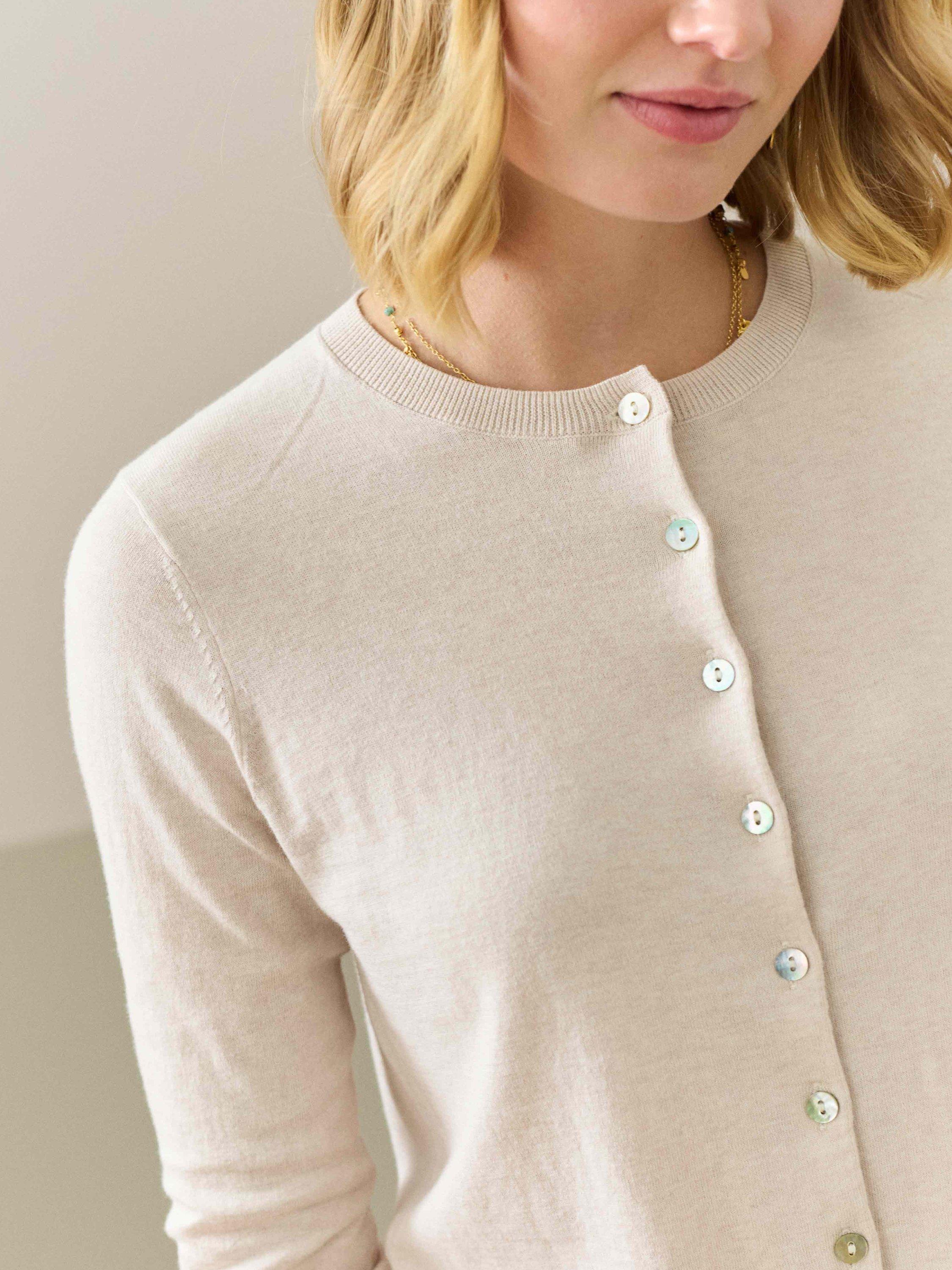 With a rounded neckline, ribbed trims and bracelet-length sleeves, it's no surprise why this fine gauge cotton knit button-up cardigan is deemed a wardrobe must-have.