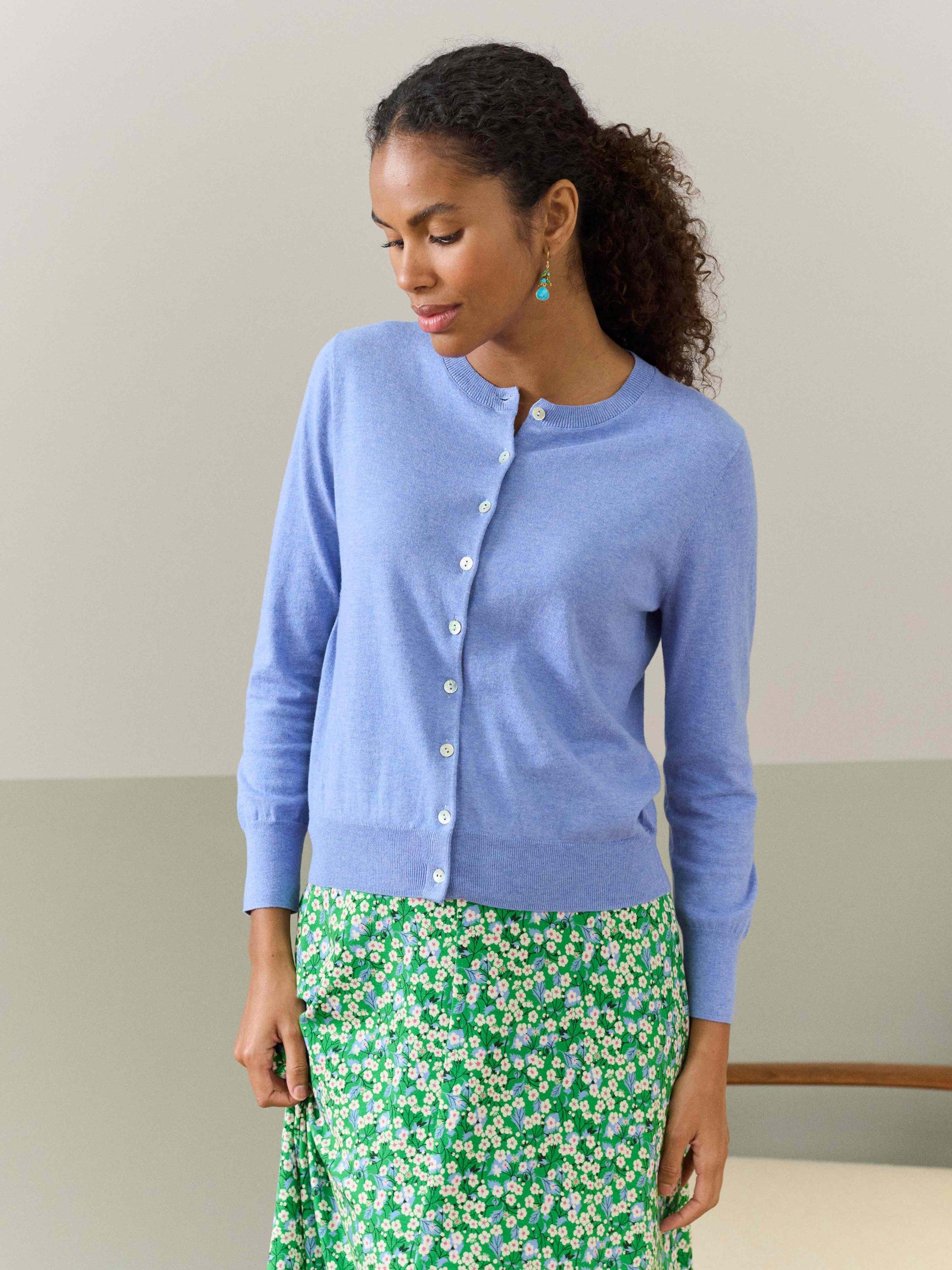 With a rounded neckline, ribbed trims and bracelet-length sleeves, it's no surprise why this fine gauge cotton knit button-up cardigan is deemed a wardrobe must-have.