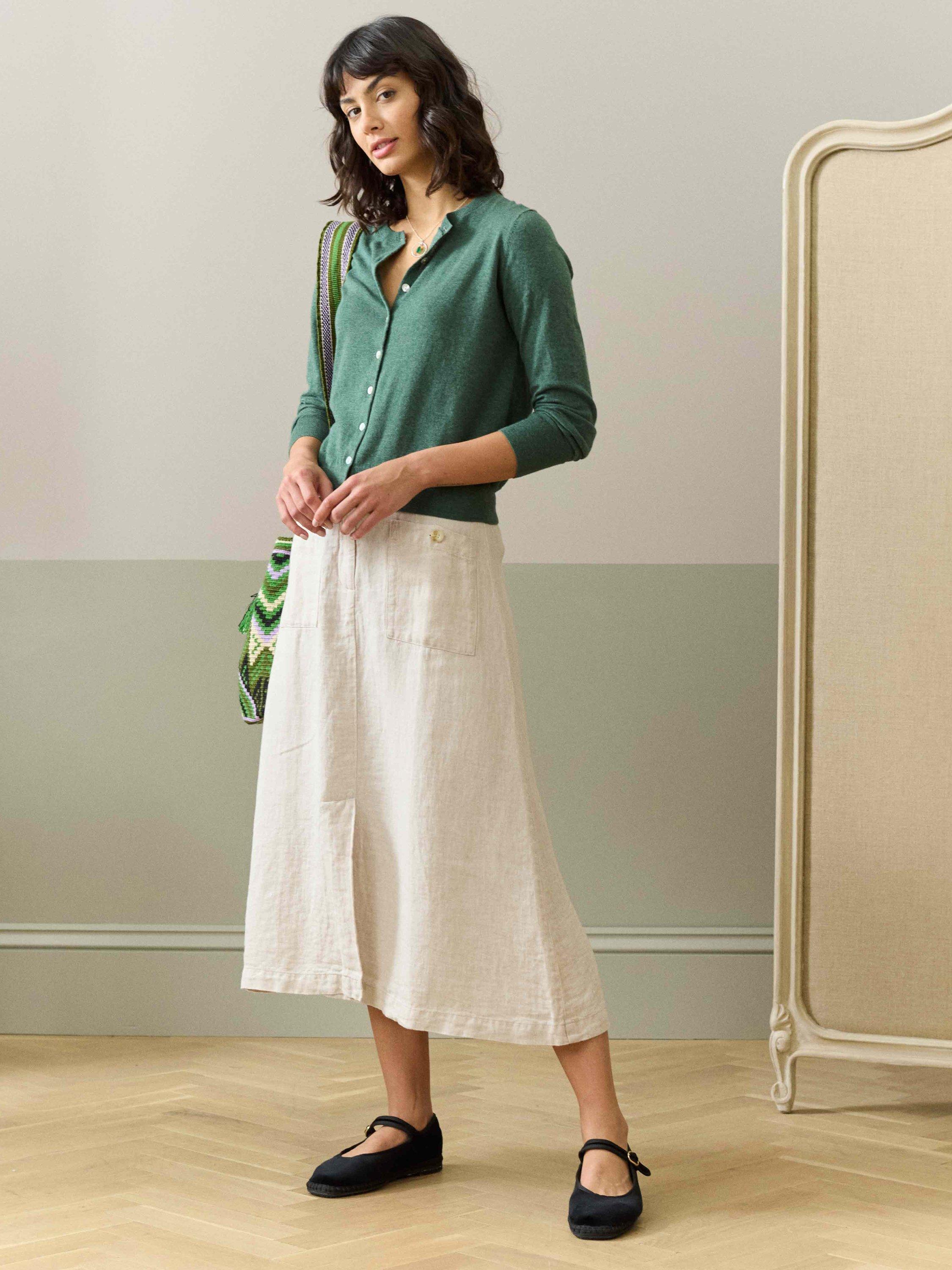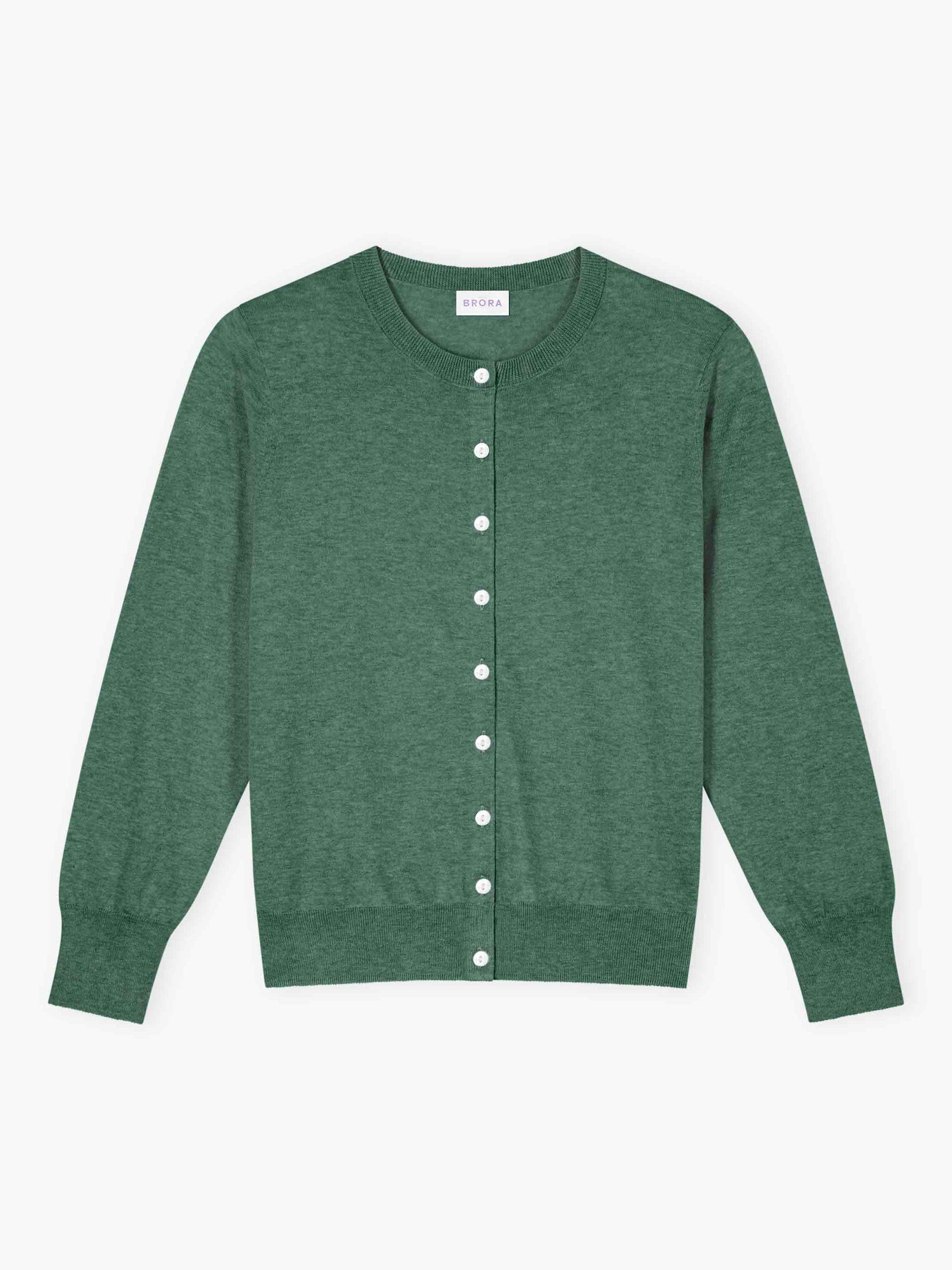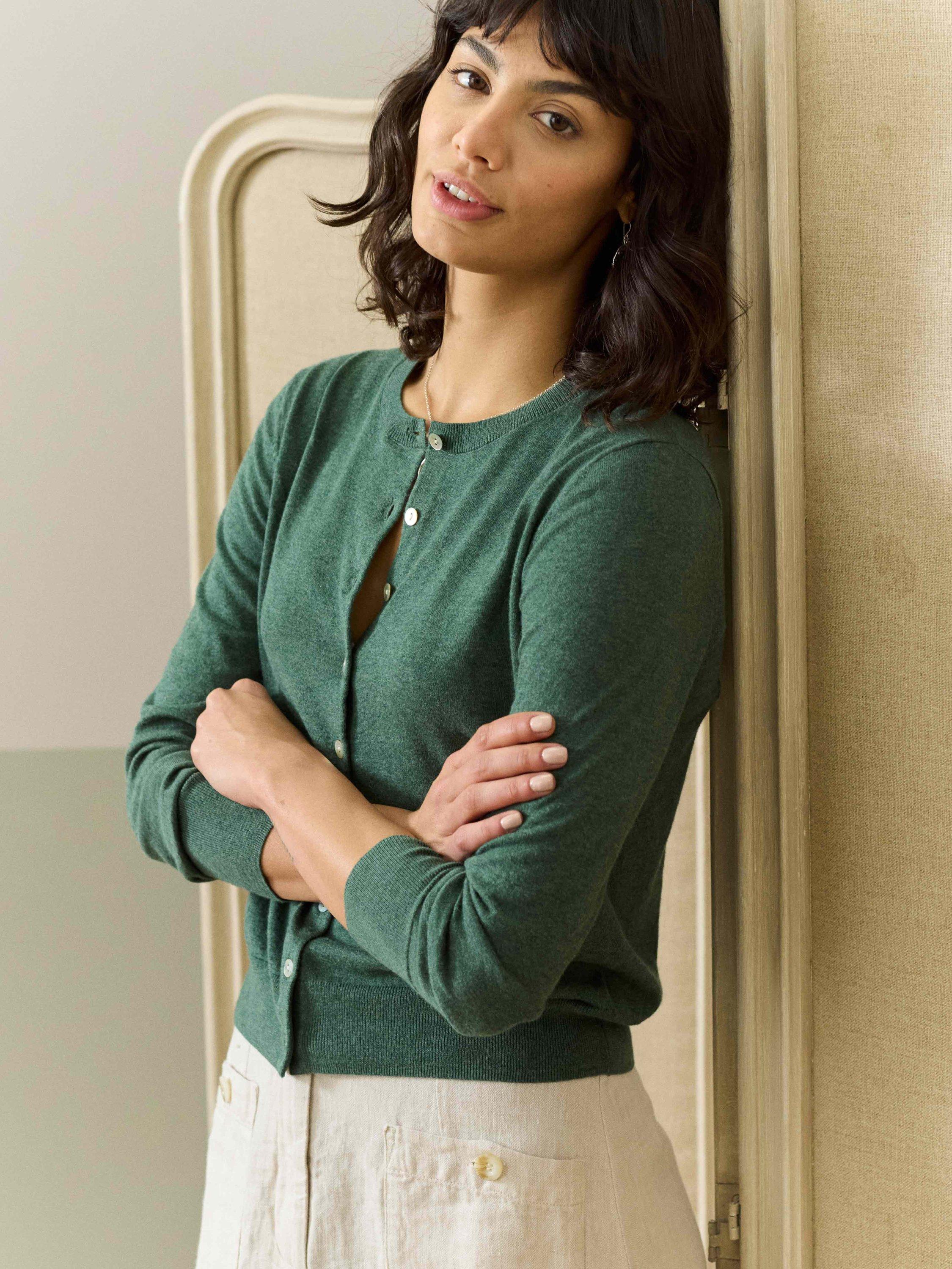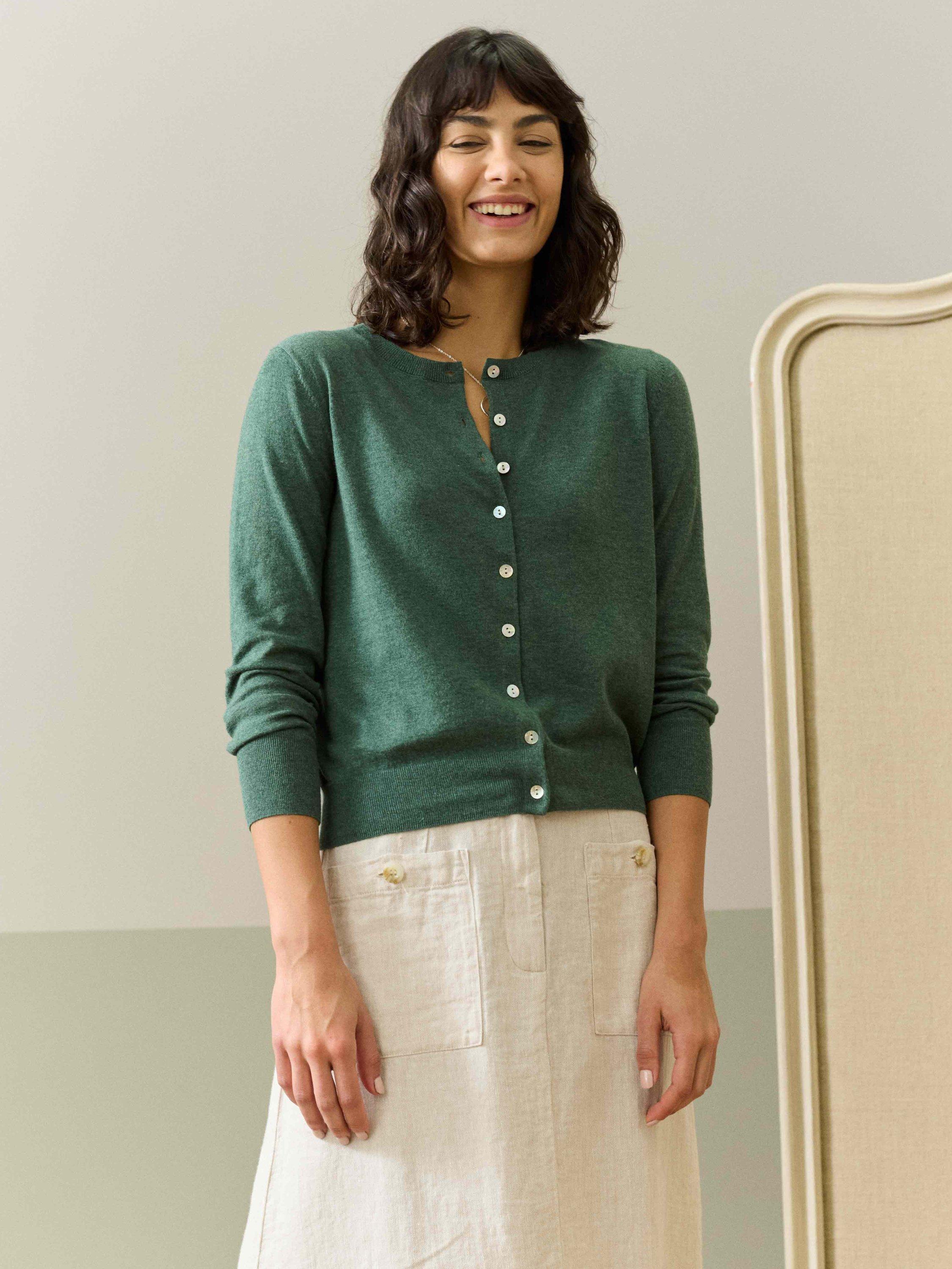With a rounded neckline, ribbed trims and bracelet-length sleeves, it's no surprise why this fine gauge cotton knit button-up cardigan is deemed a wardrobe must-have.