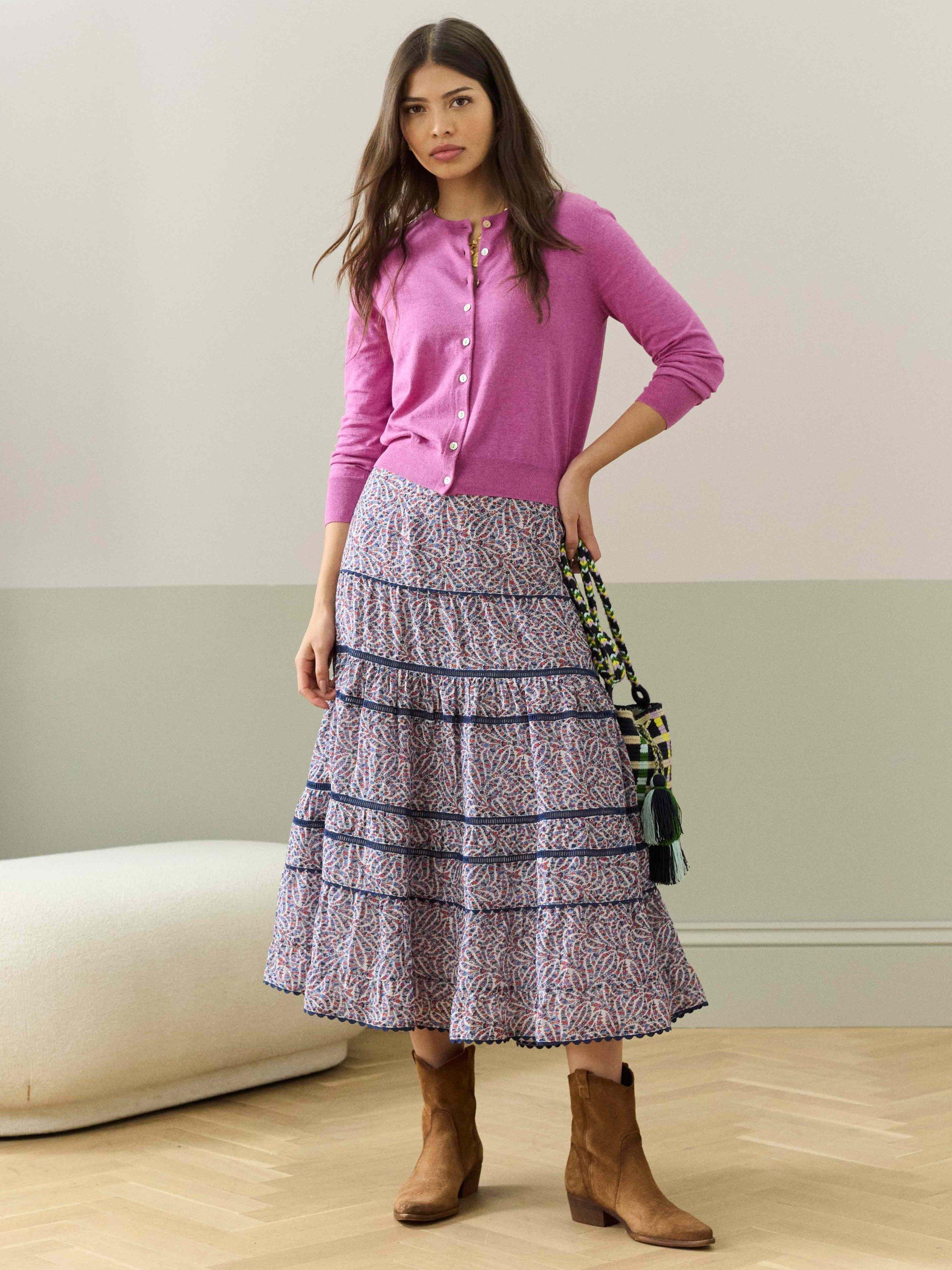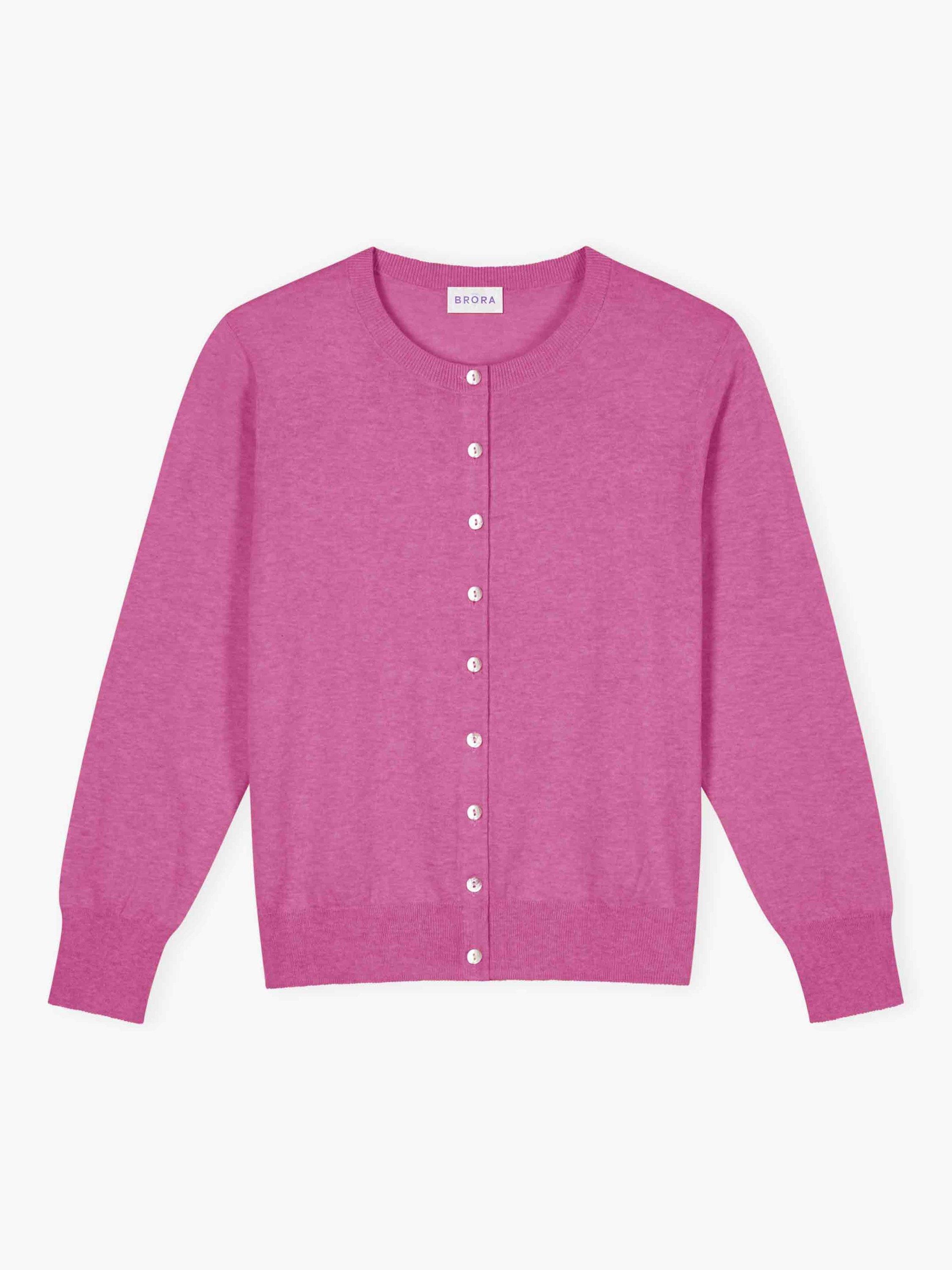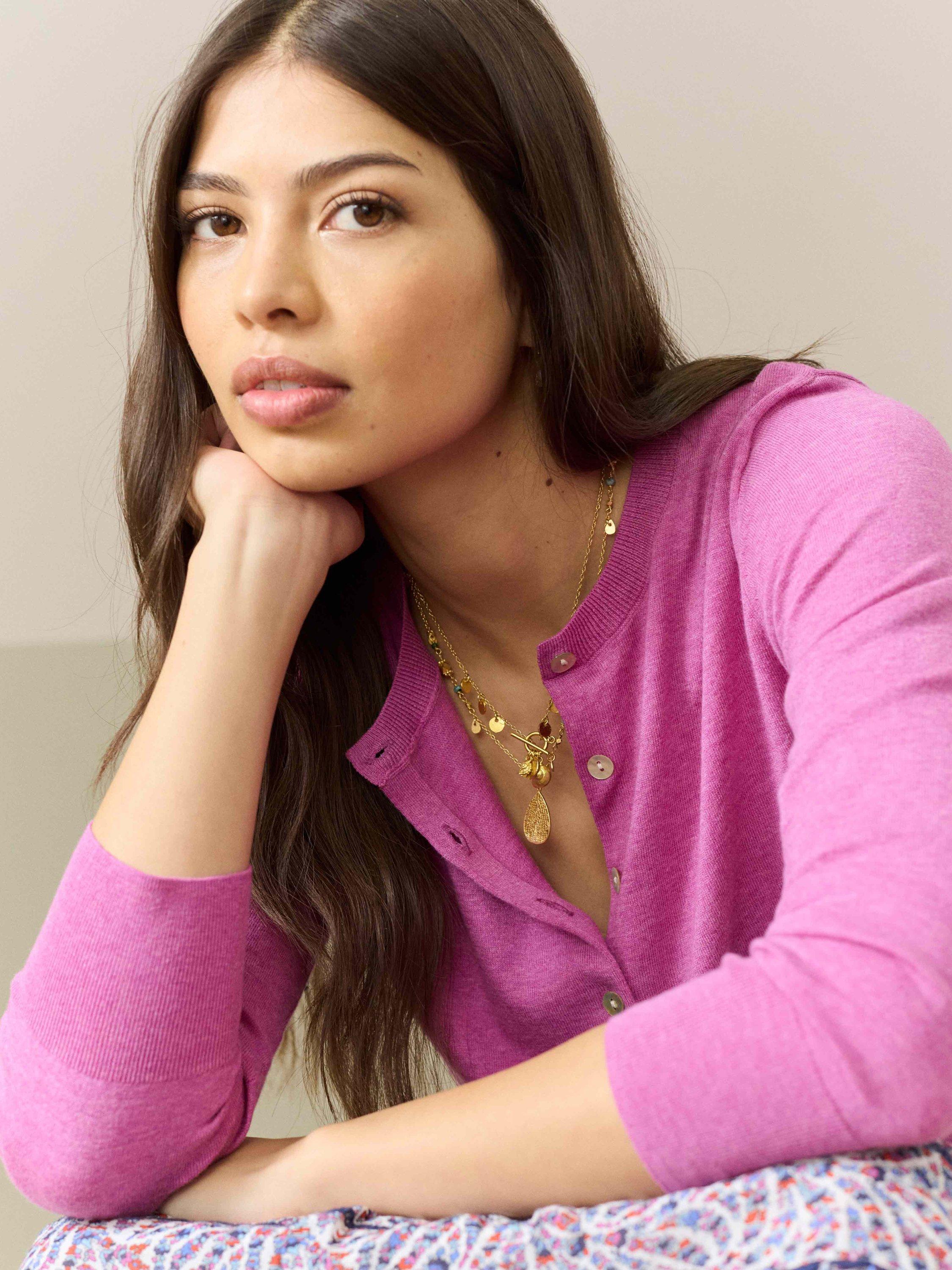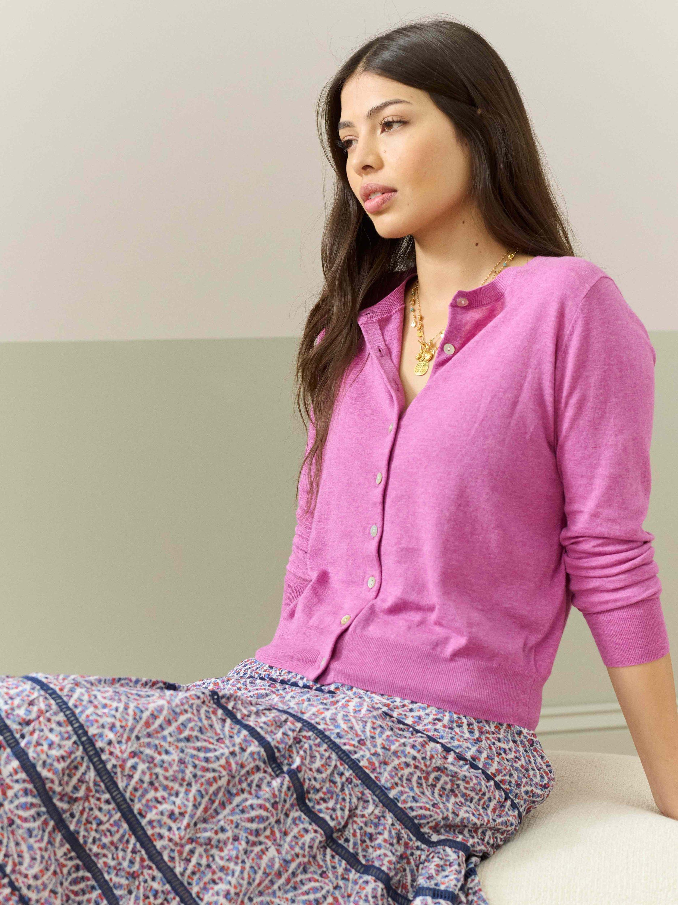 With a rounded neckline, ribbed trims and bracelet-length sleeves, it's no surprise why this fine gauge cotton knit button-up cardigan is deemed a wardrobe must-have.