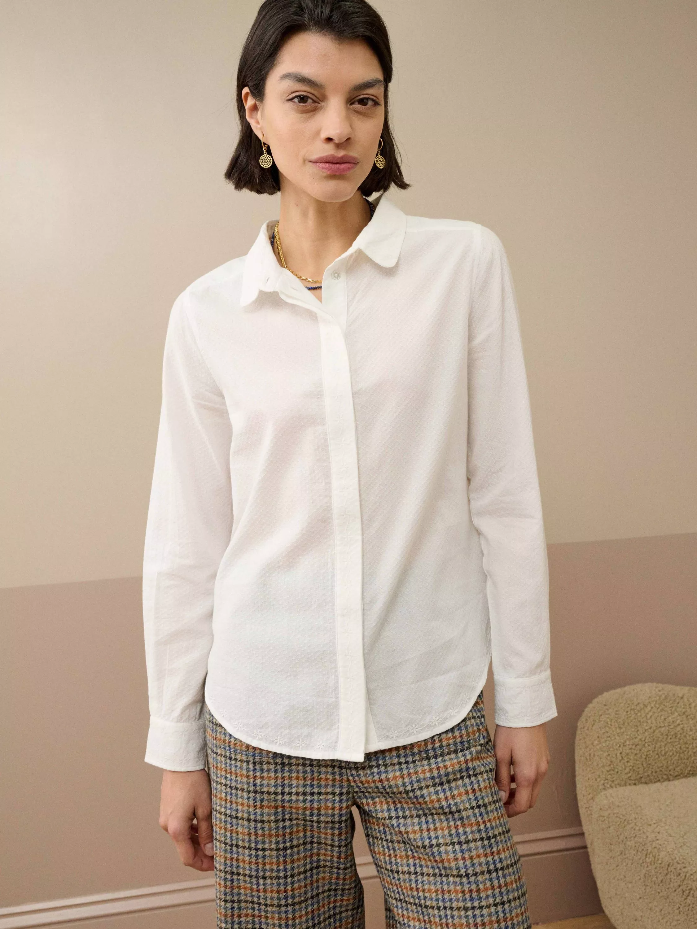 A classic with a twist, this organic cotton shirt features a textured finish, subtle embroidered details, a charming Peter Pan collar, inserts on the sides and a sleek, concealed placket.