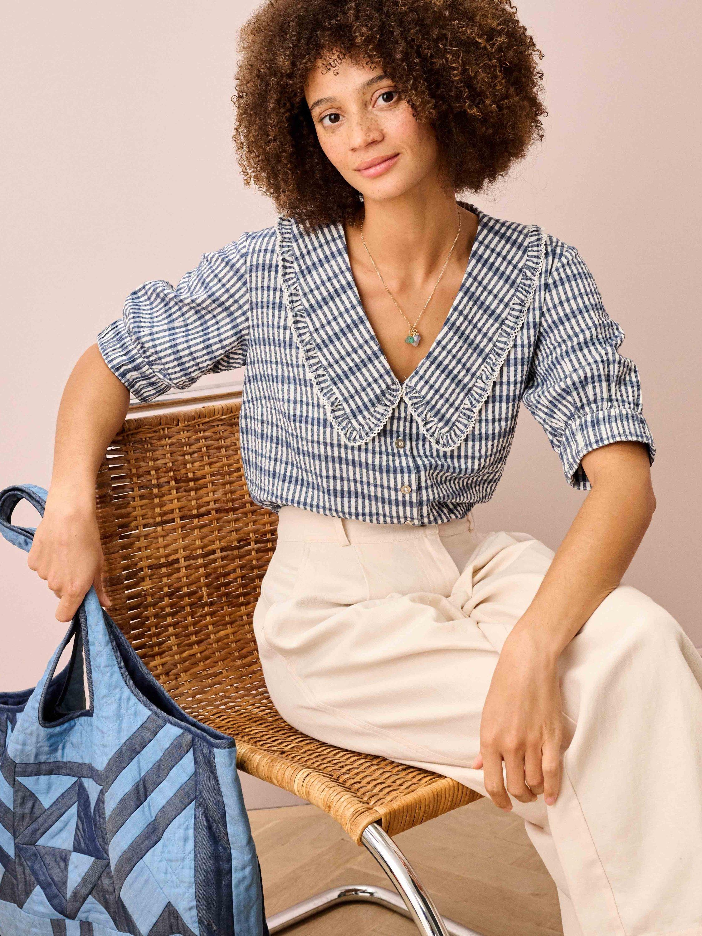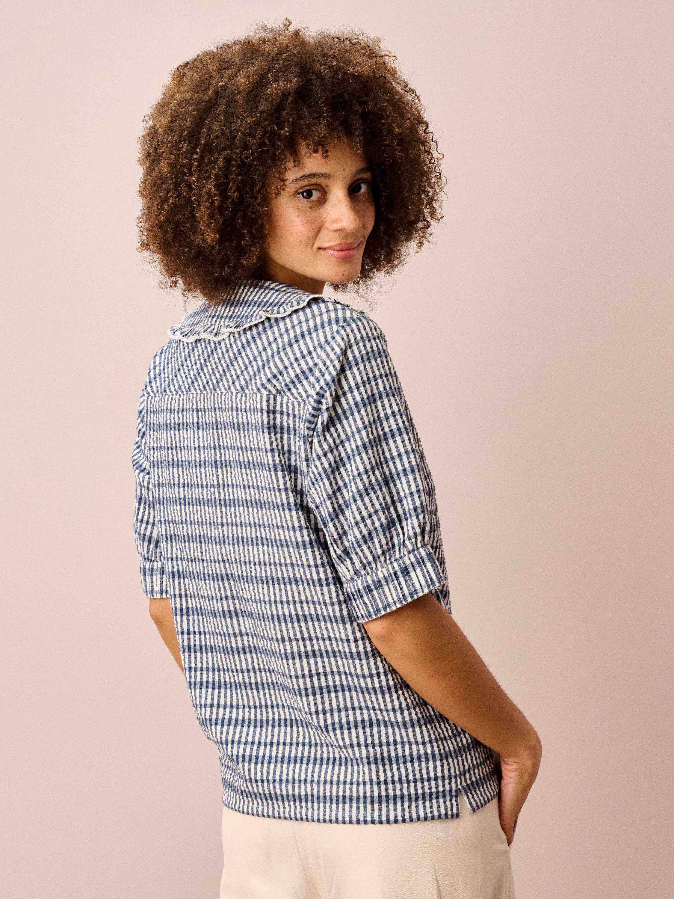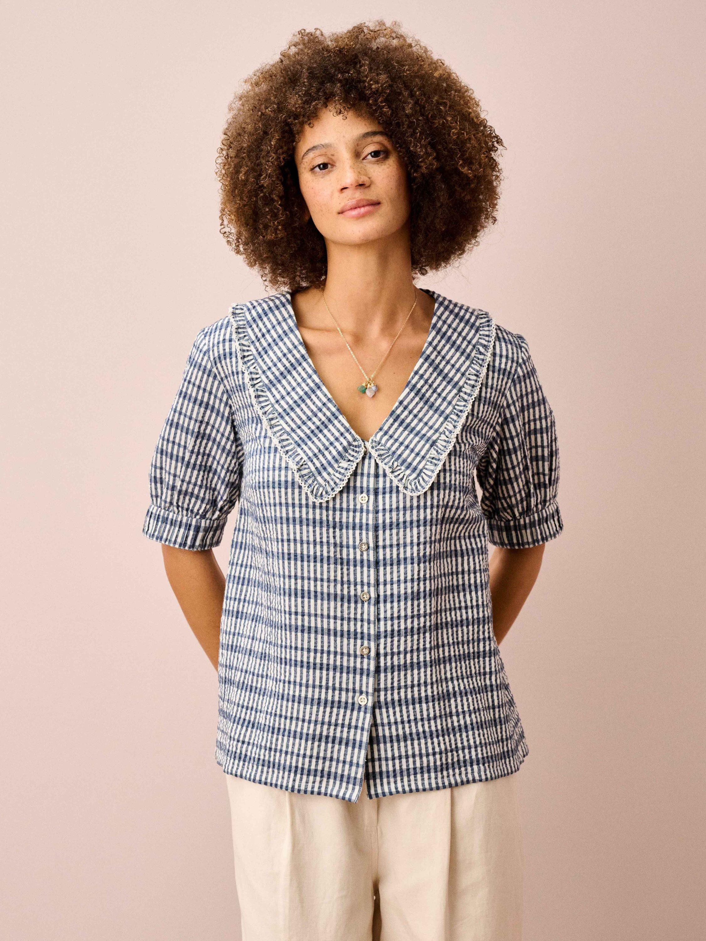 Exclusively designed in-house at Brora with fans of their bestselling Gingham Chelsea Collar Blouse in mind, this fresh, nautical-infused take has been made from cotton seersucker fabric and finished with delicate lace trim details.