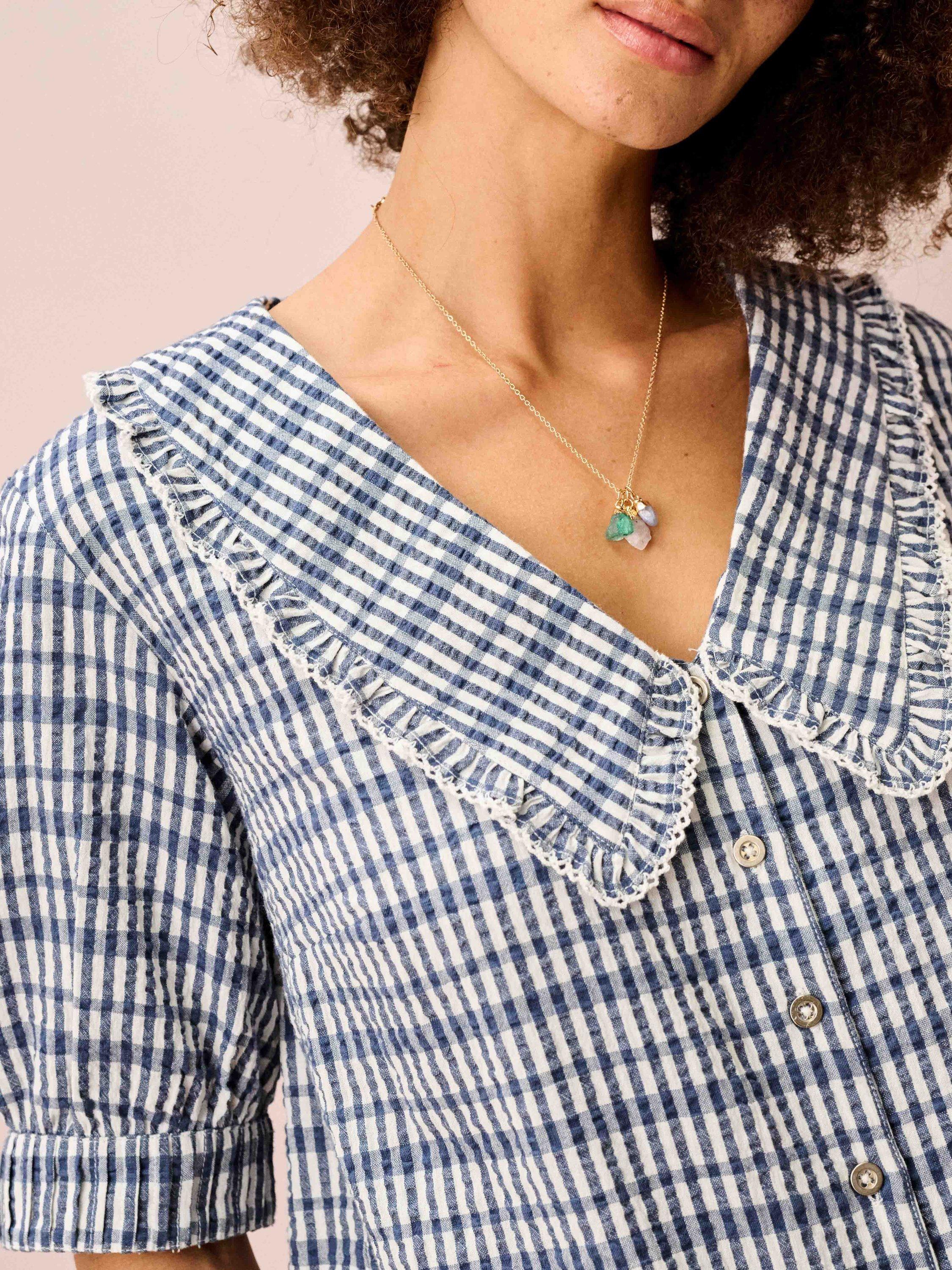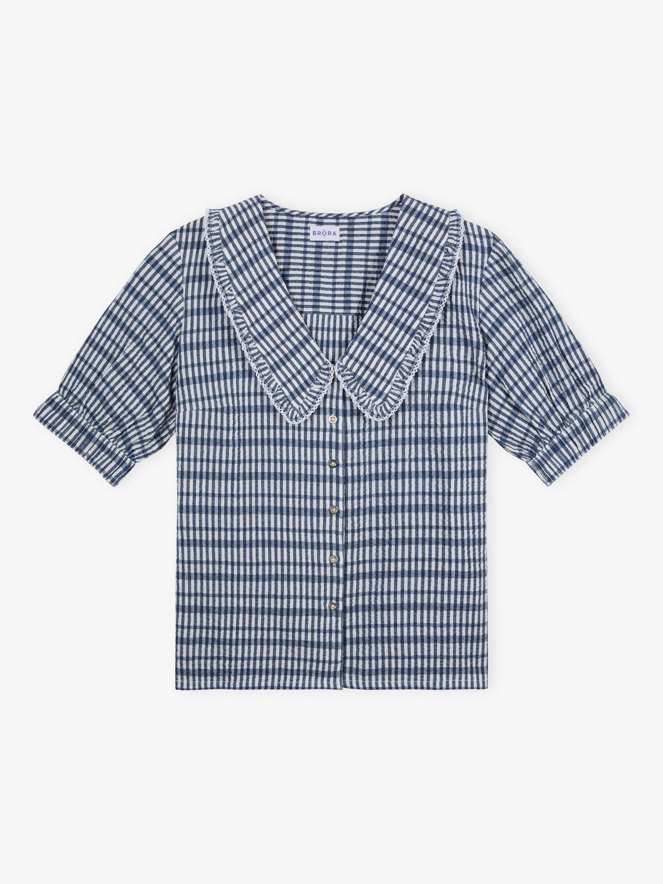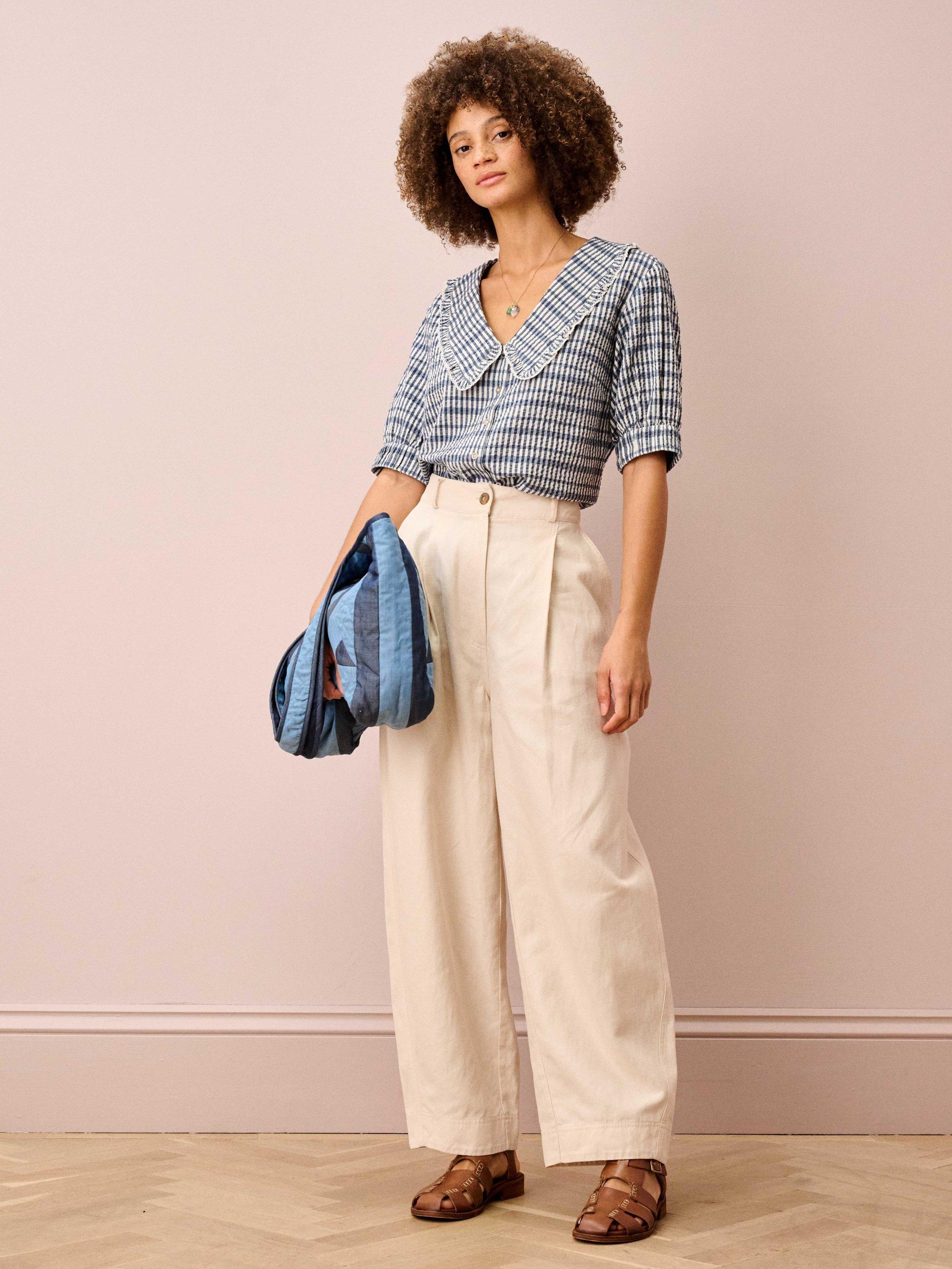Exclusively designed in-house at Brora with fans of their bestselling Gingham Chelsea Collar Blouse in mind, this fresh, nautical-infused take has been made from cotton seersucker fabric and finished with delicate lace trim details.