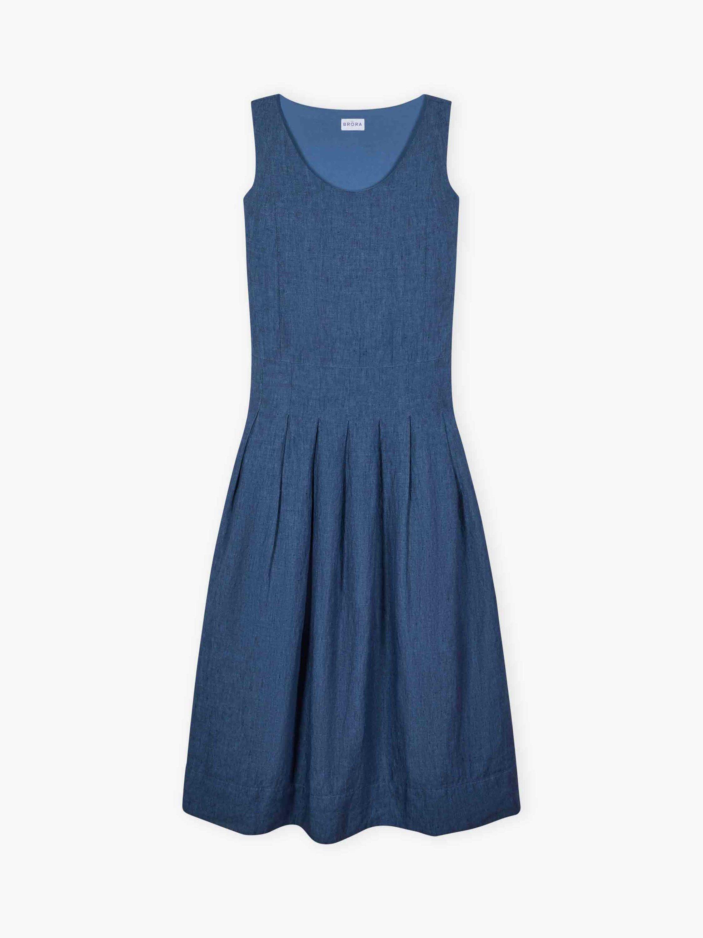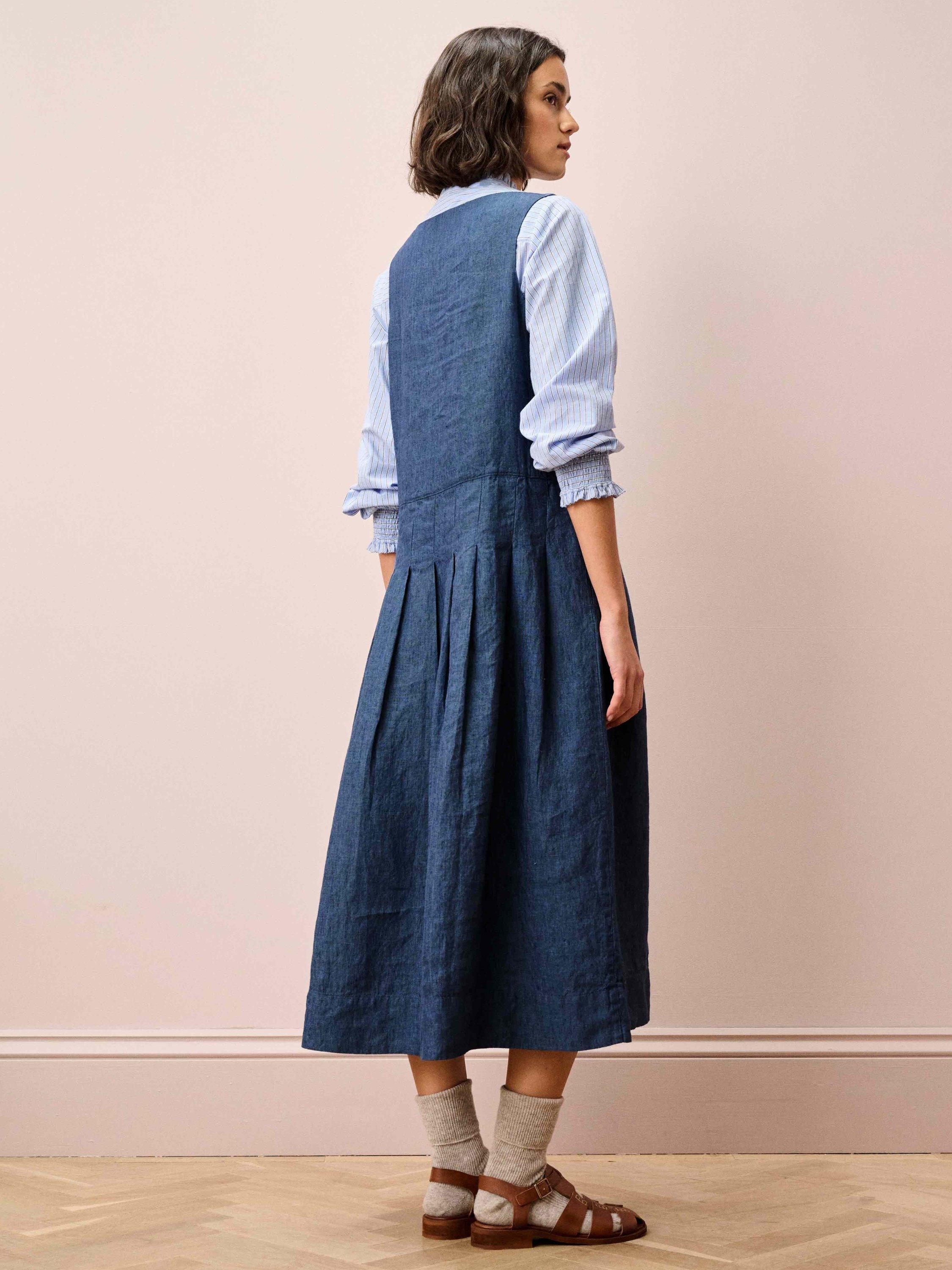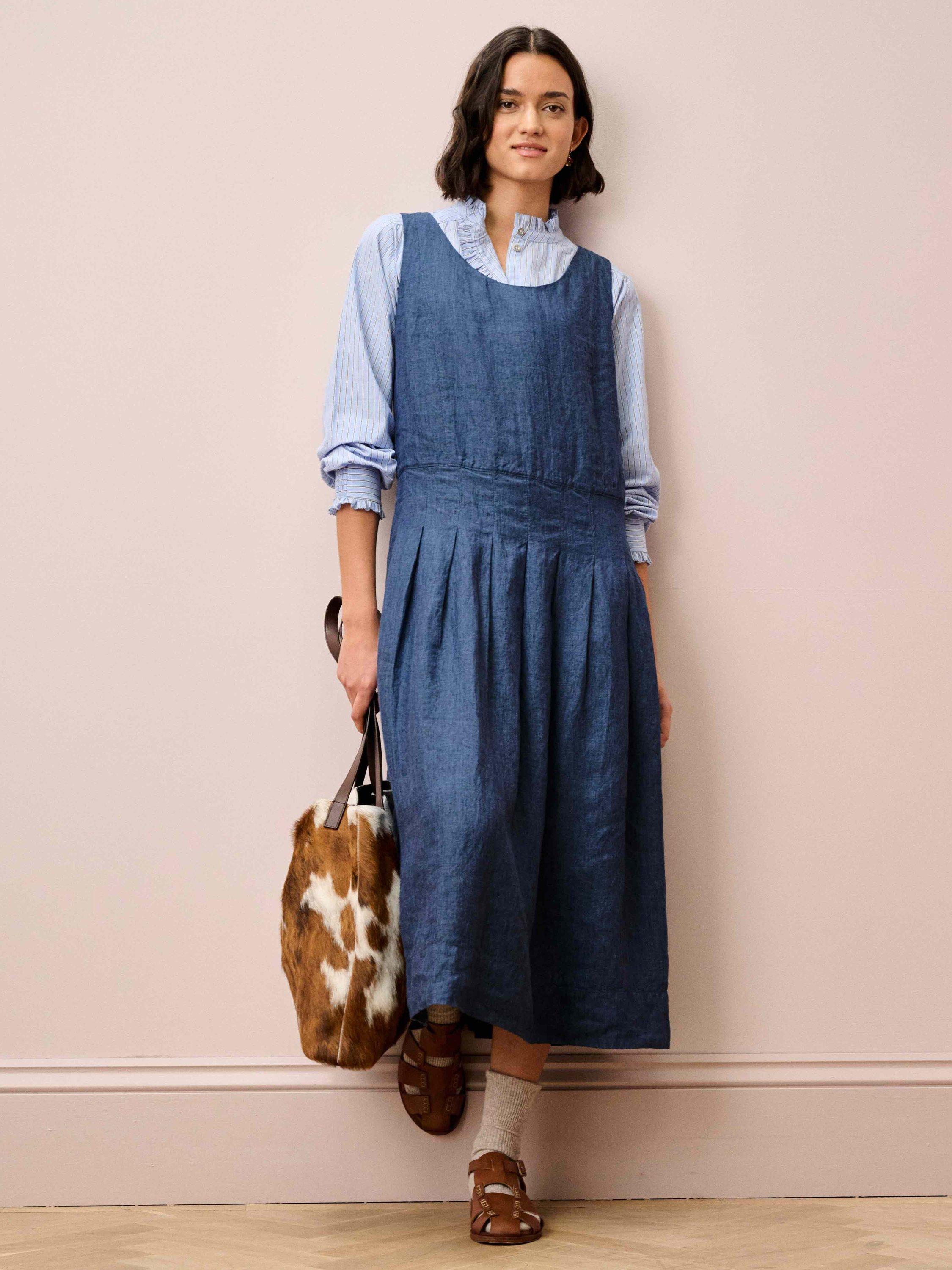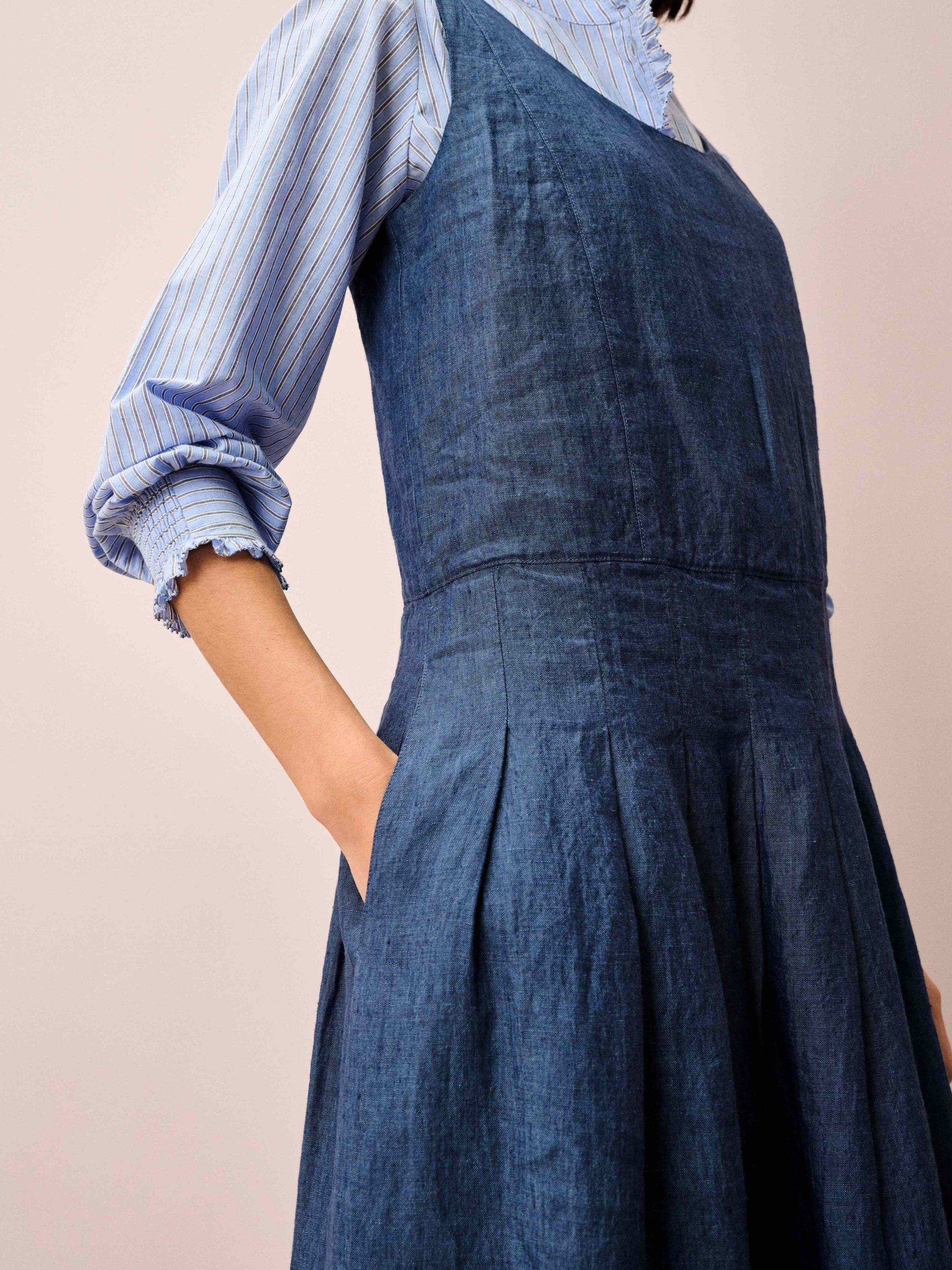 A winning alternative to denim, this cross-weave linen pinafore, made from start to finish in Europe, features a flattering, rounded neckline, functional pockets, an invisible zip and knife pleats on the skirt.