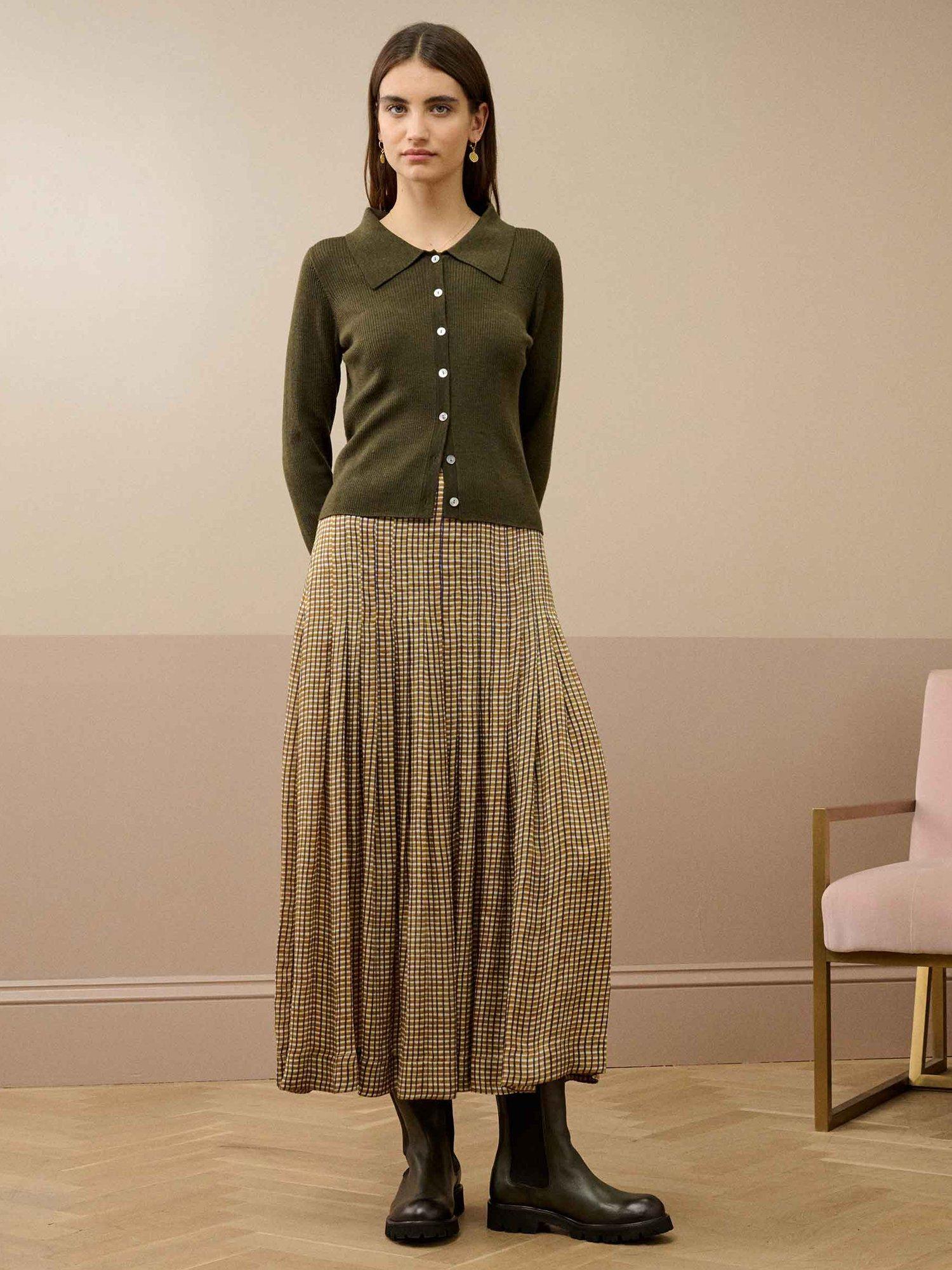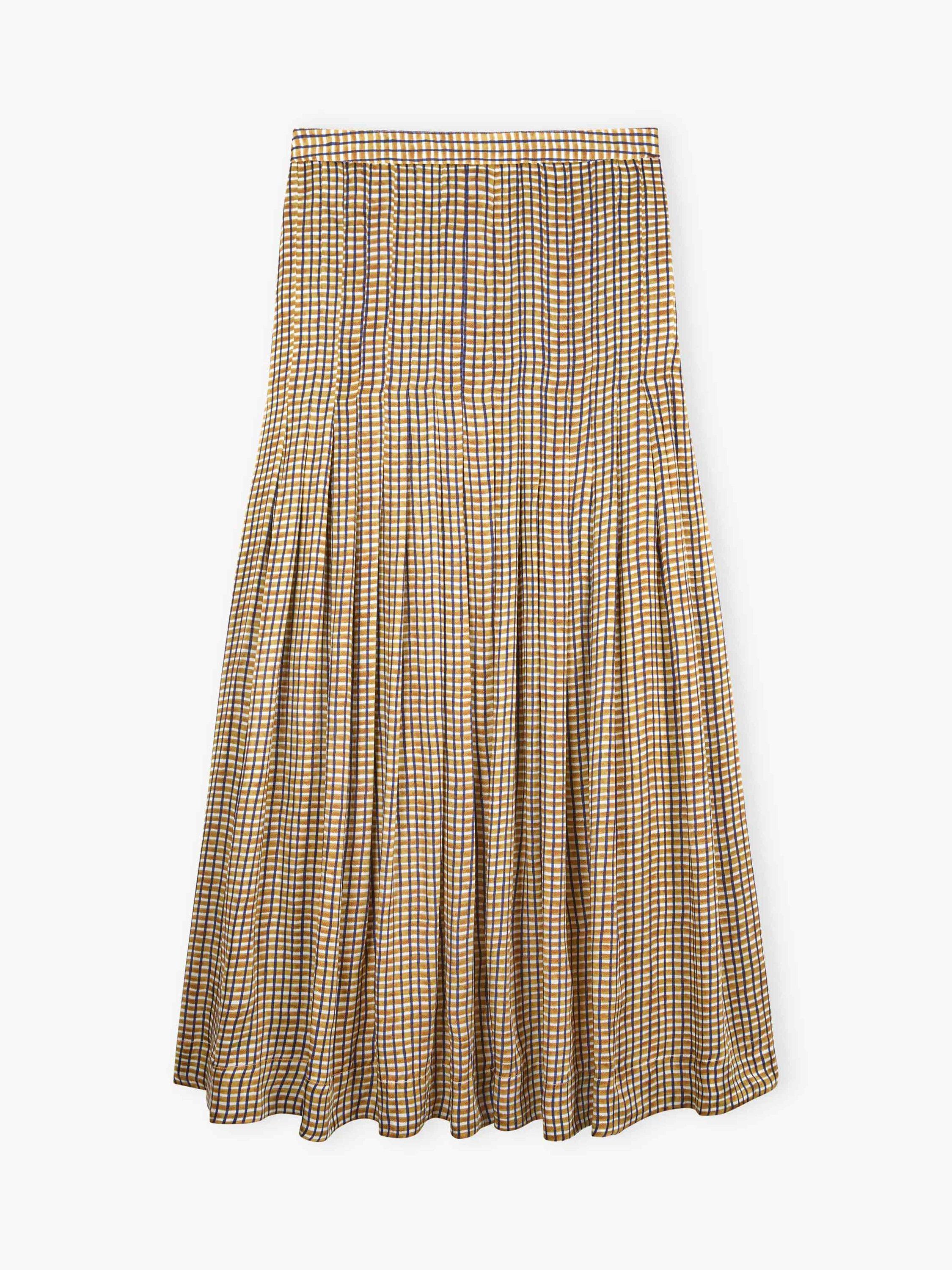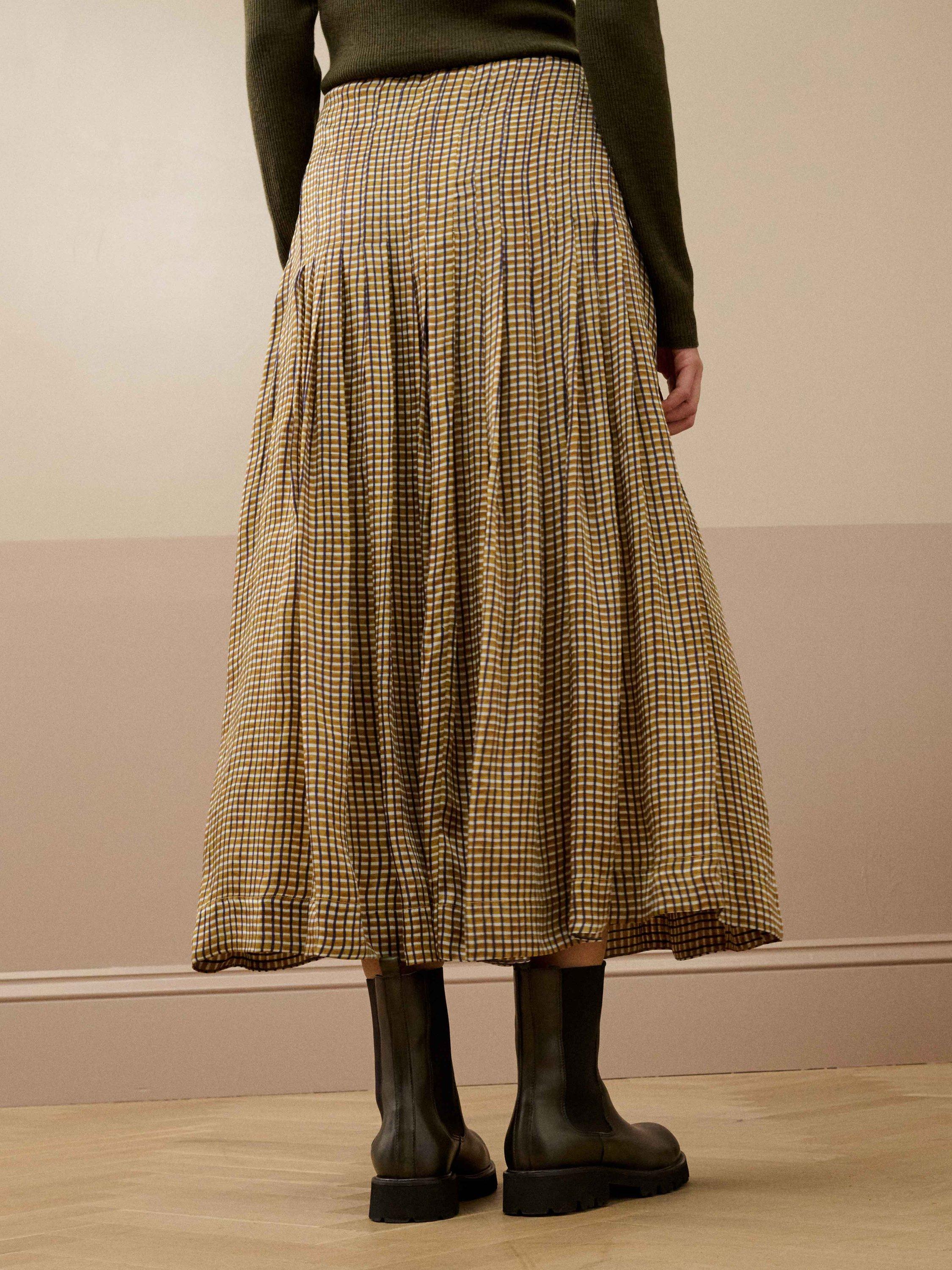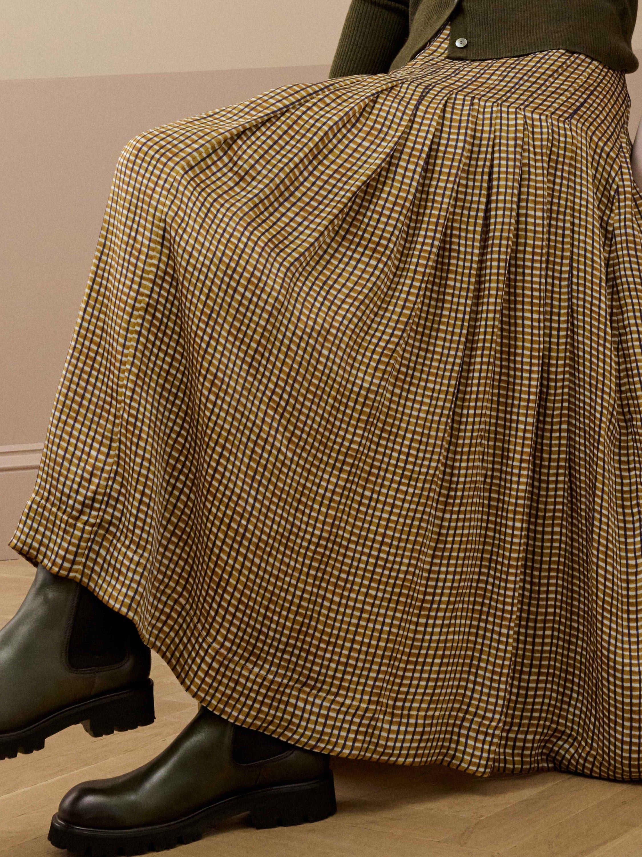 This new cupro satin skirt, available in seasonal ochre or tarragon, features a chic, in-house-drawn check pattern, all-around knife pleats for extra movement and our popular, super-flattering fit around the waist and hips.