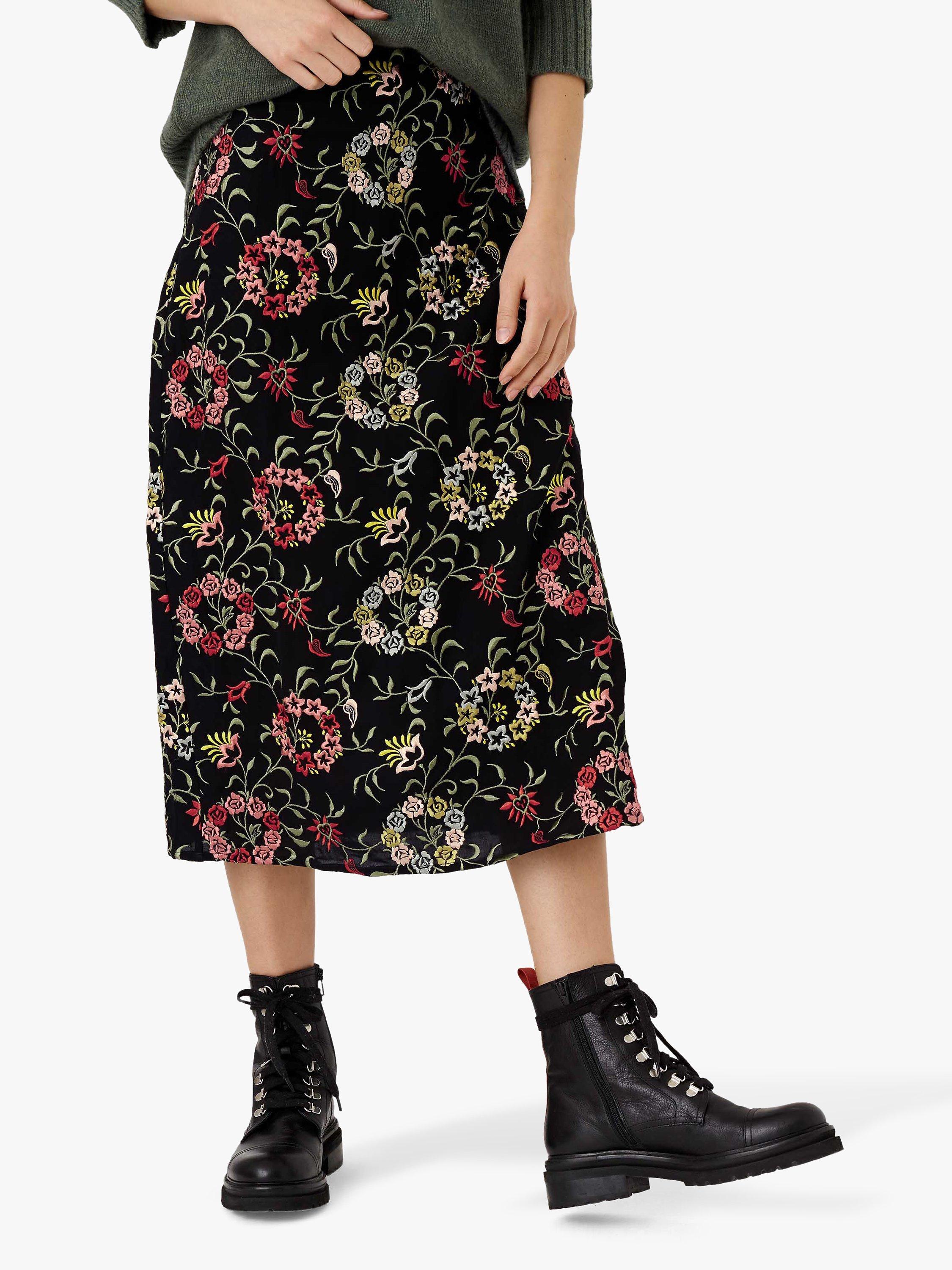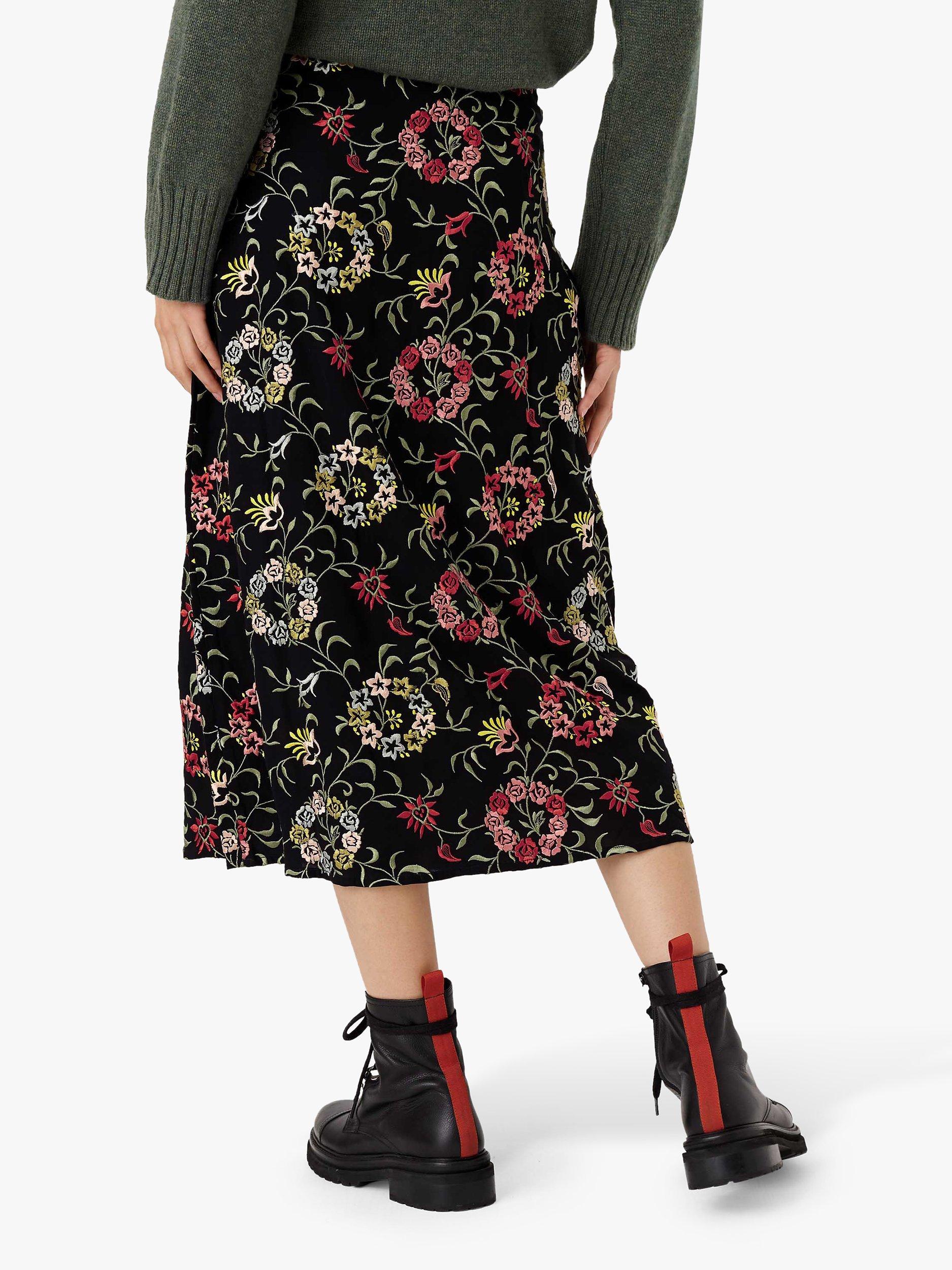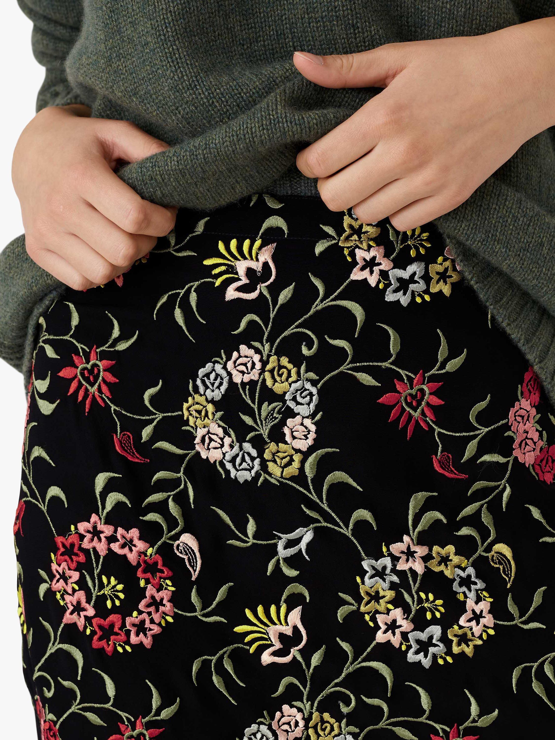 The origins of this skirt were a divine vintage embroidered jacket which was the starting point for the stunning embroidery in shades of dusty pink, fern green, ivory and greys all on a flattering dark base. Due to the intricate detailing the skirt is a perfect straight cut, falling mid-calf and can be dressed up but also worn with a T-shirt and trainers for effortless charm.