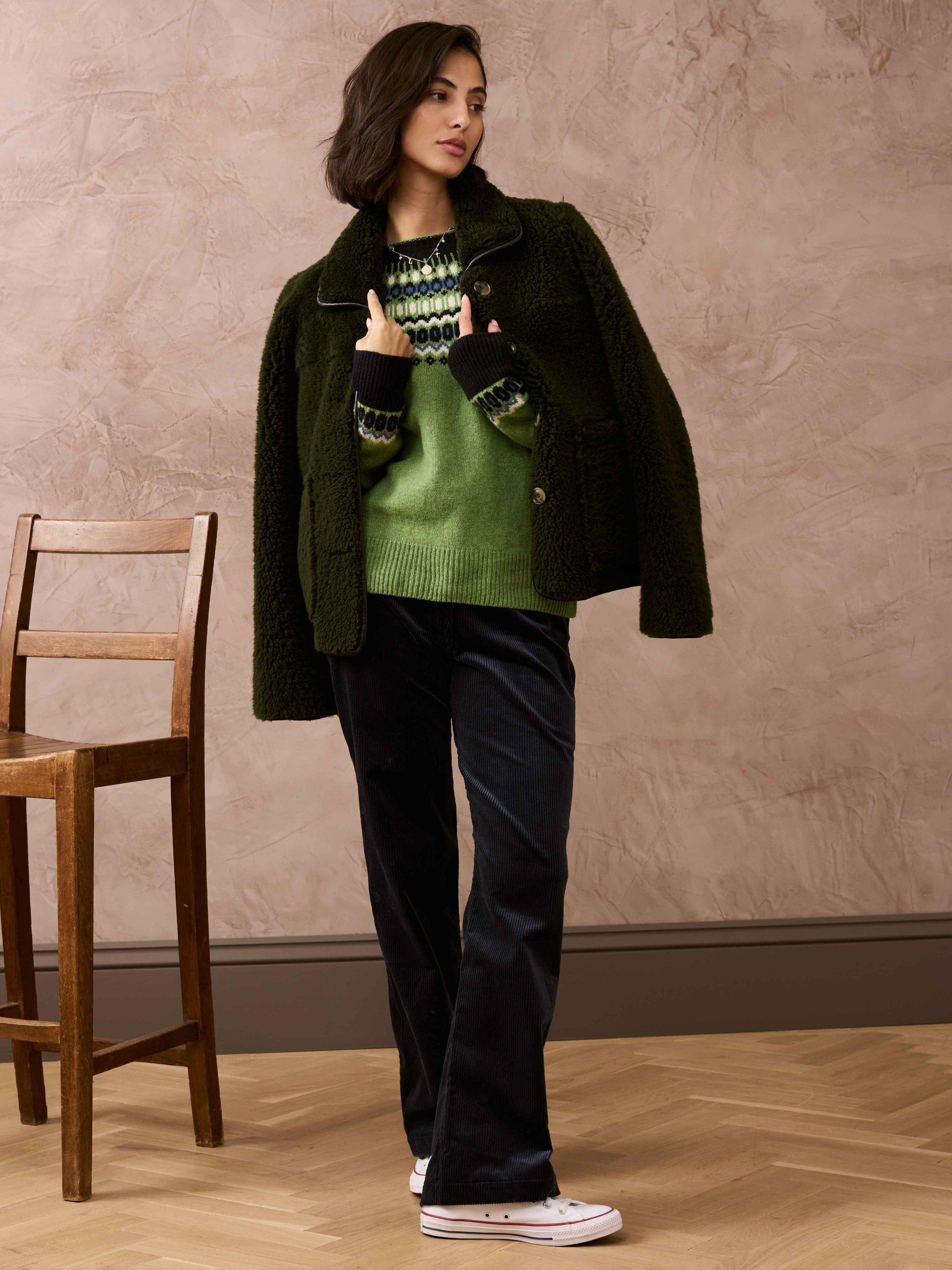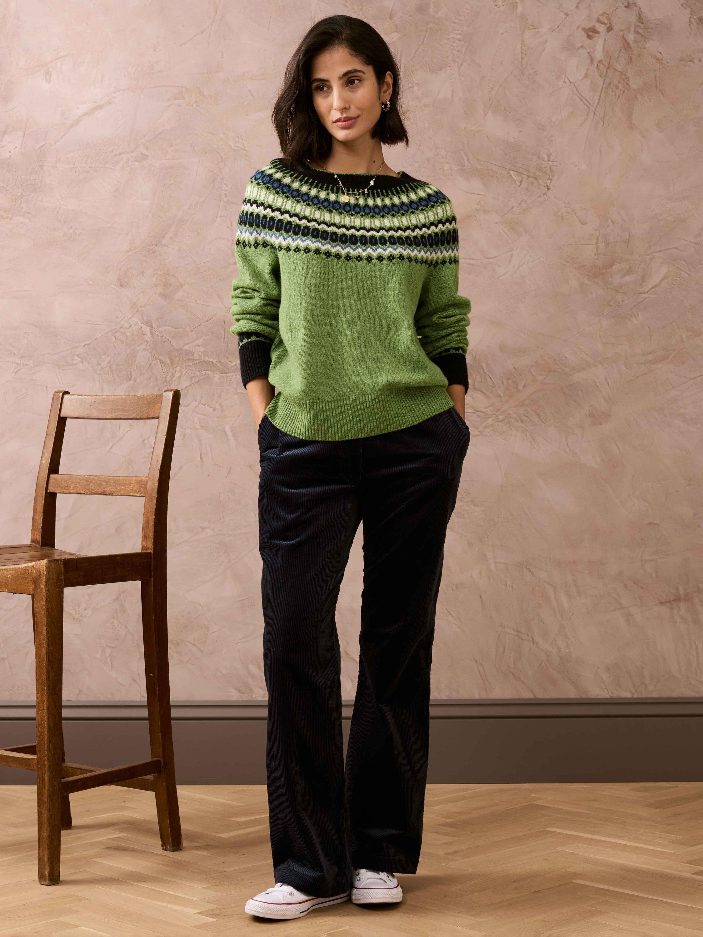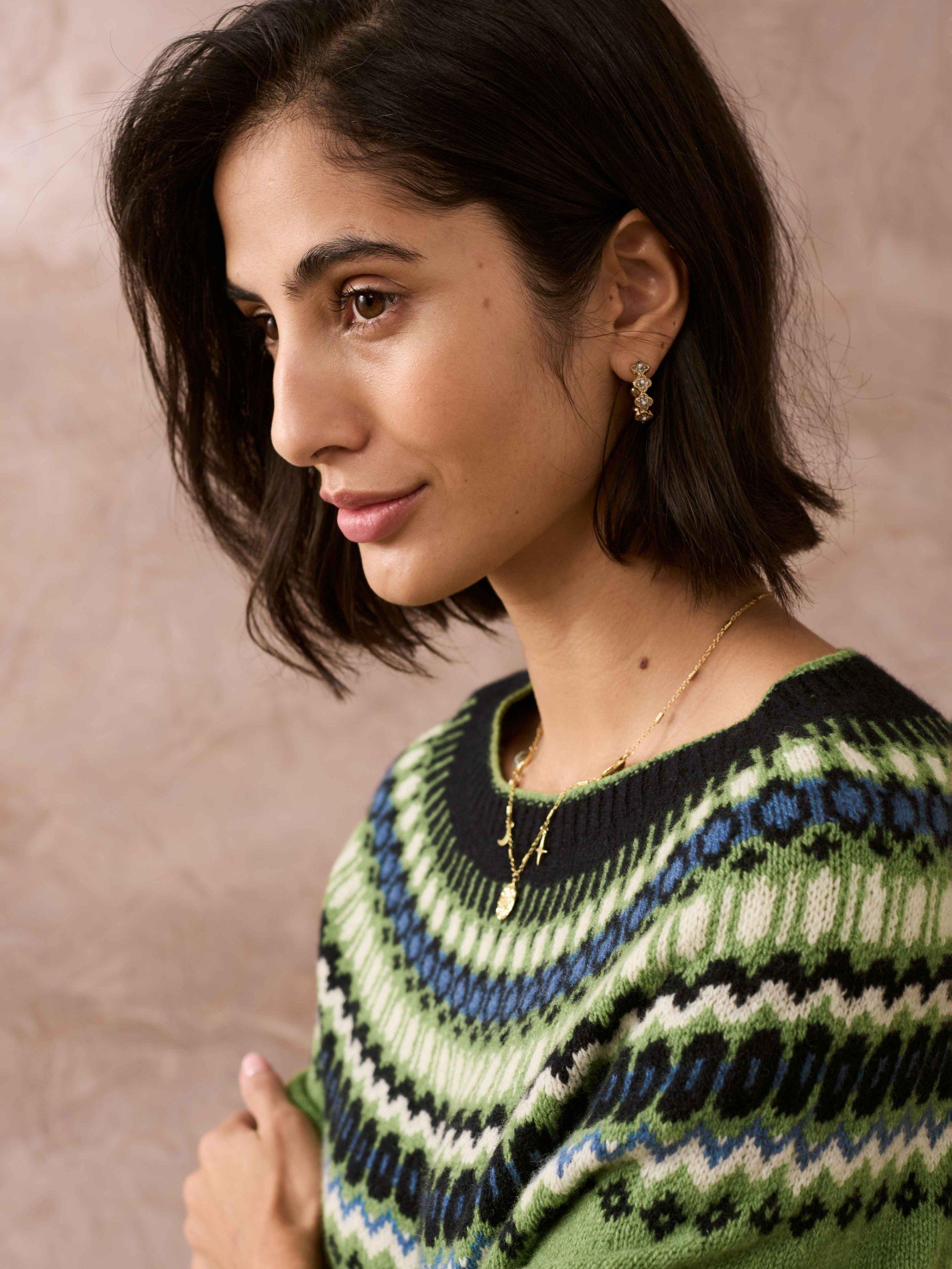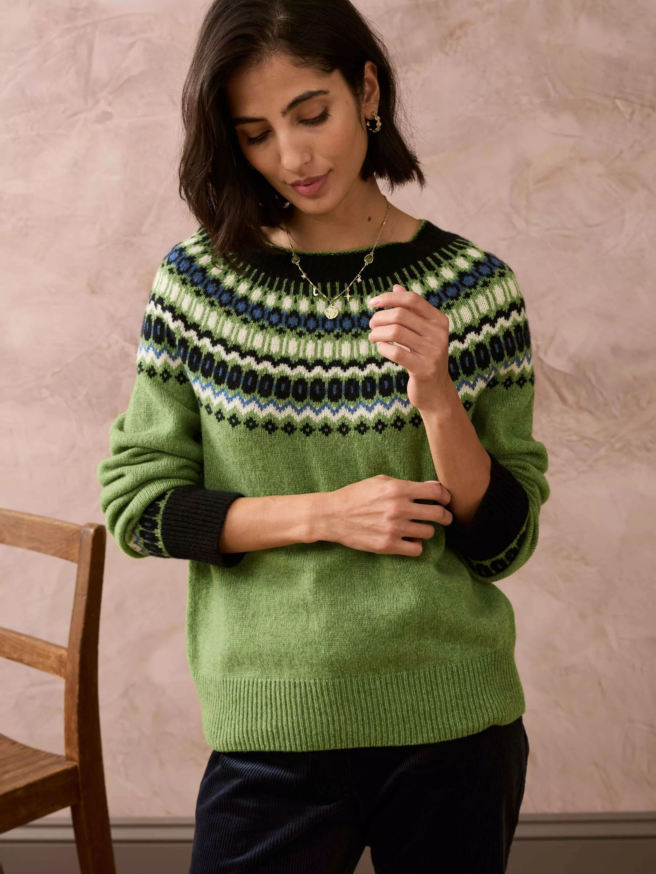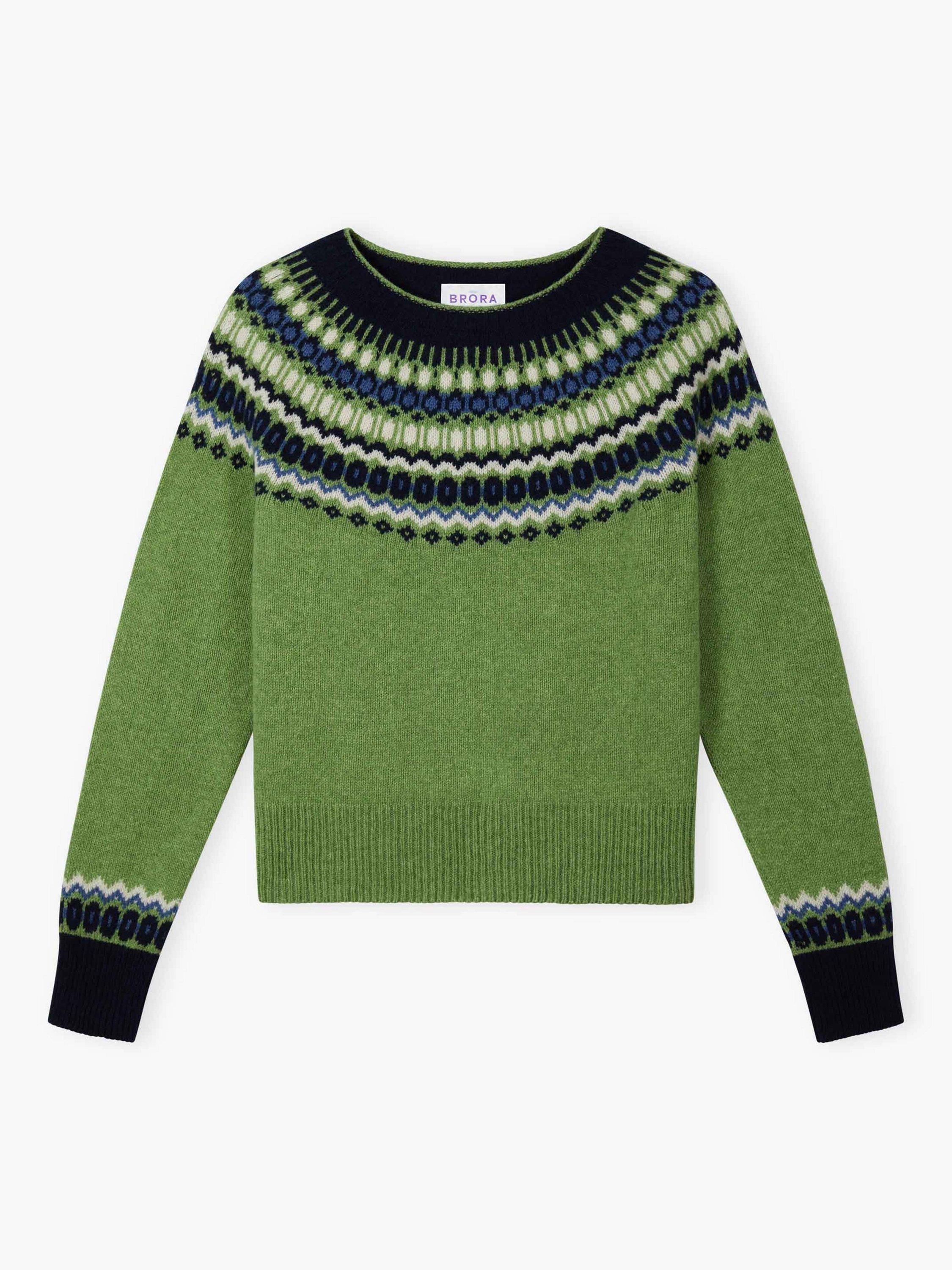 With a striking, geometric Fair Isle pattern across the yoke and cuffs, this sublimely soft, seamless jumper has been expertly knitted in Scotland using superfine lambswool fibres.