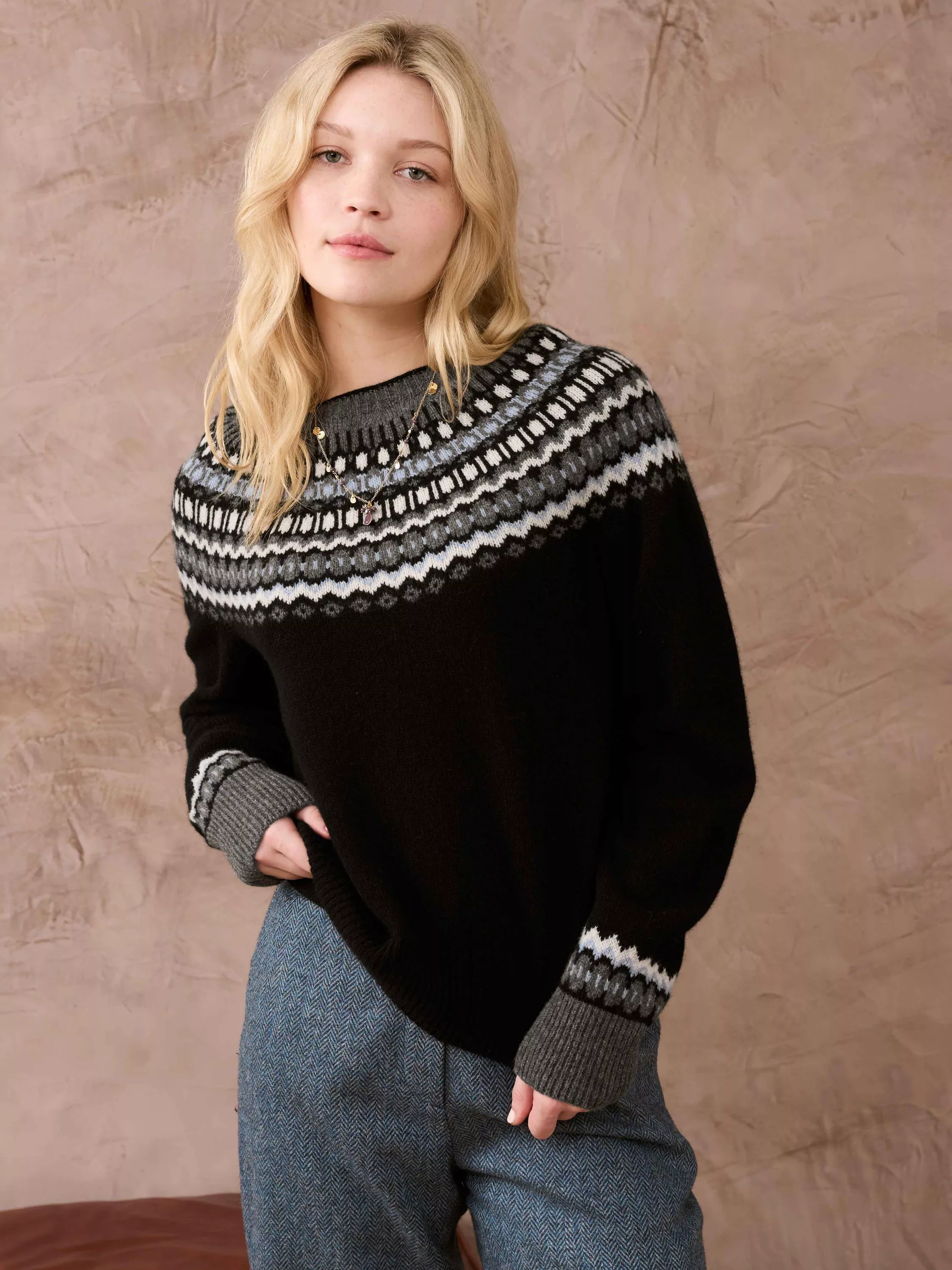 With a striking, geometric Fair Isle pattern across the yoke and cuffs, this sublimely soft, seamless jumper has been expertly knitted in Scotland using superfine lambswool fibres.