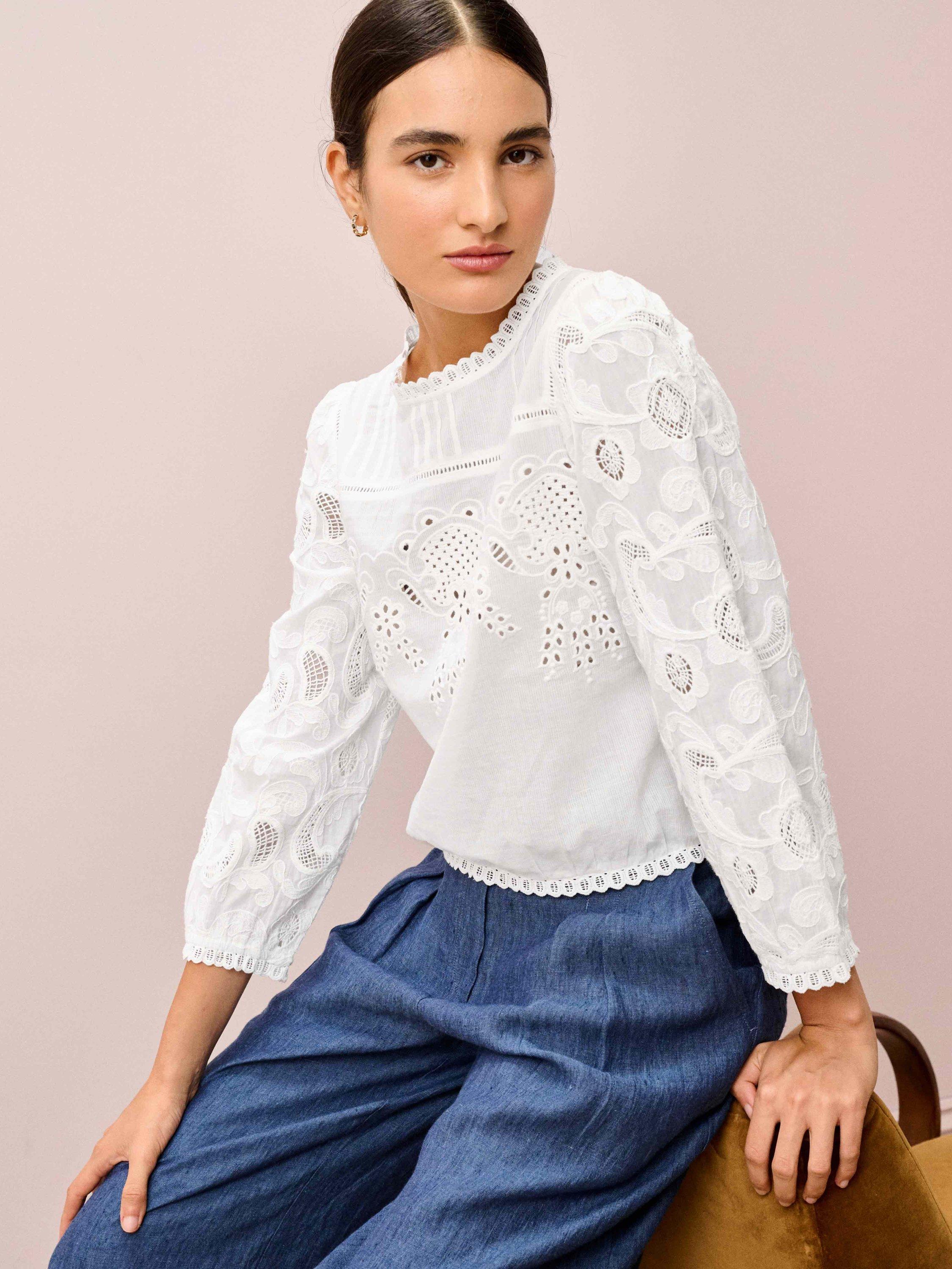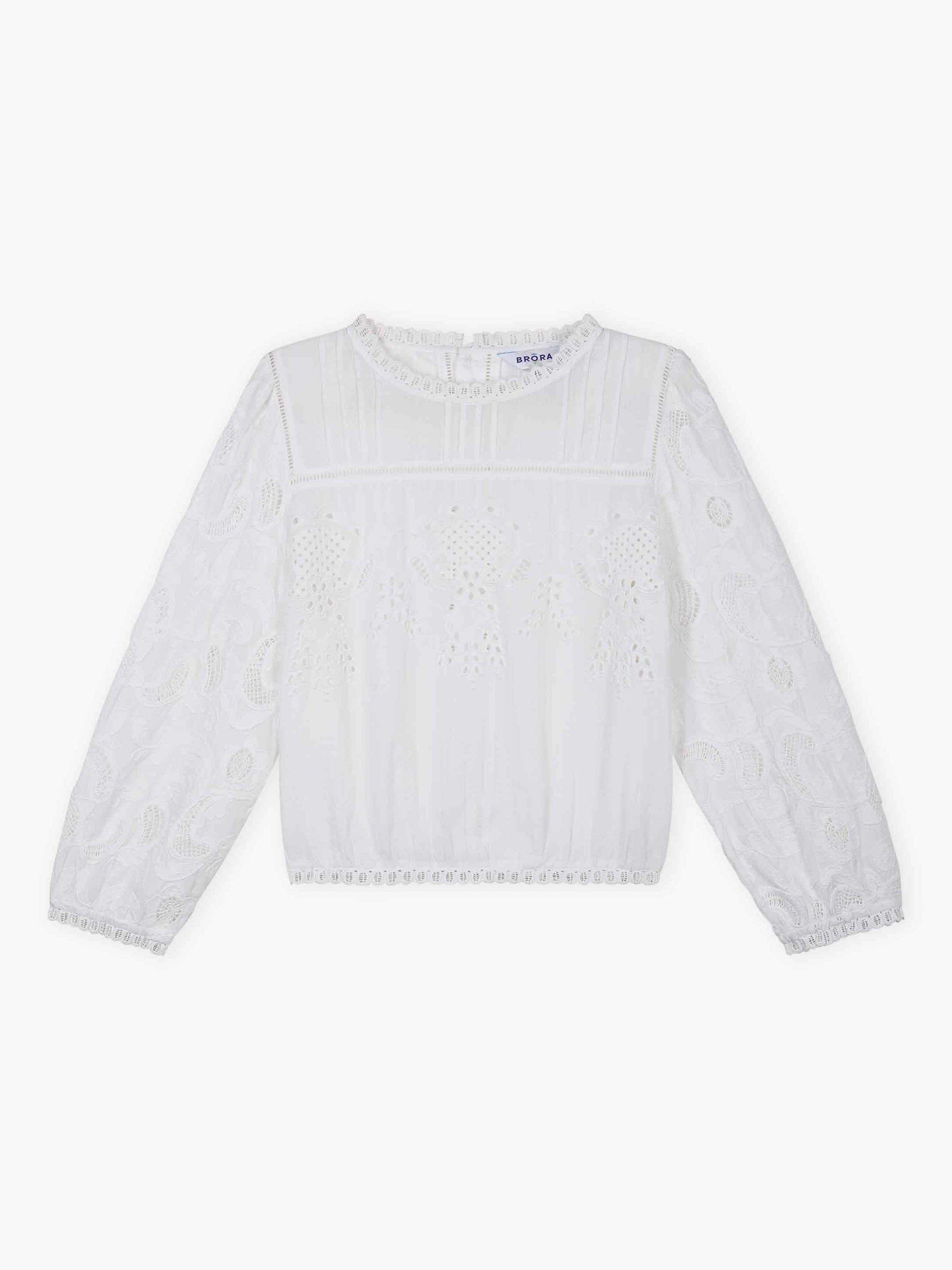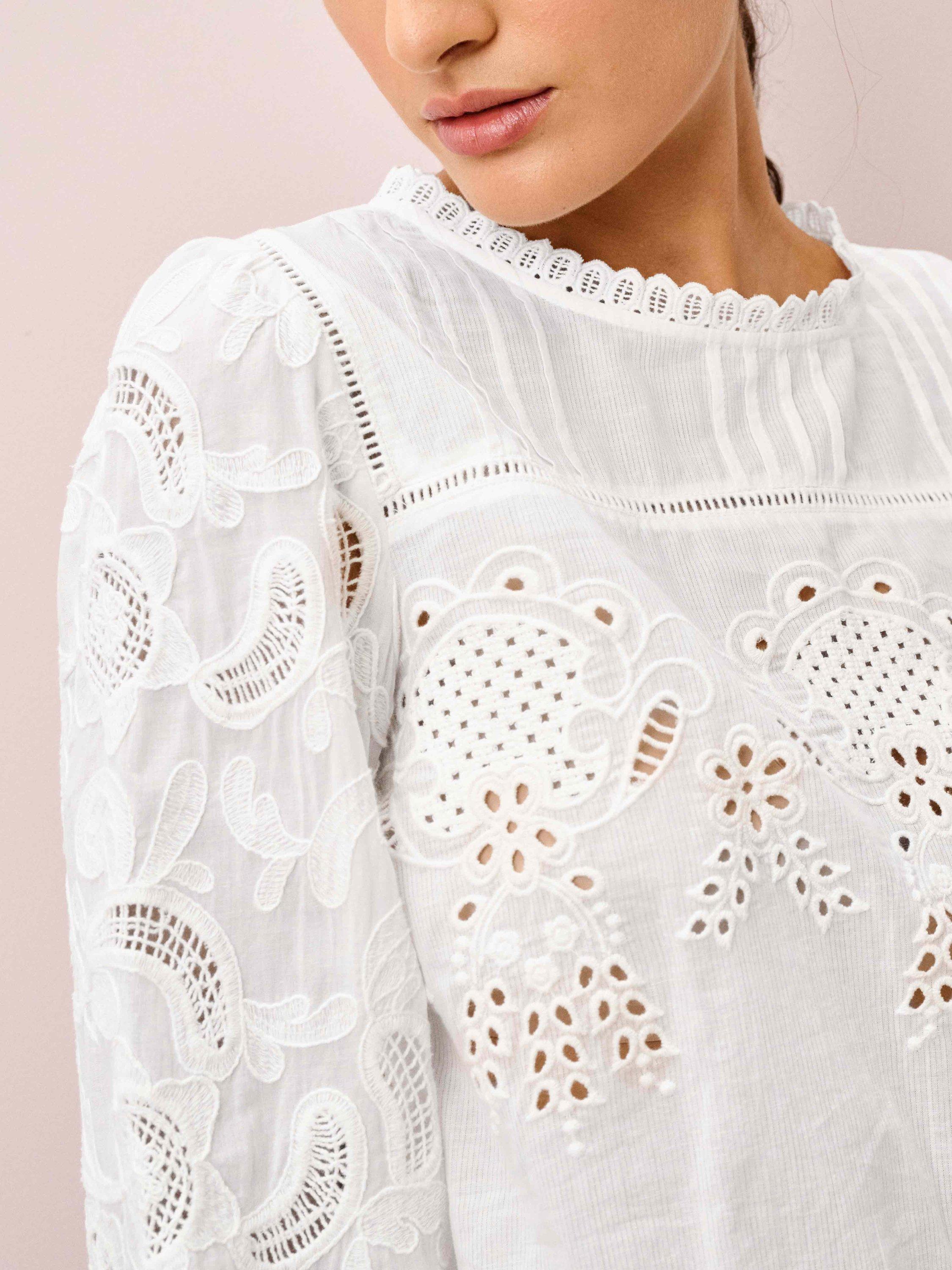 Designed in-house, this cotton beauty combines all the details you love: floral broderie anglaise, intricate embroidery, ladder-stitch inserts, pintucks, elasticated cuffs, frill trims and buttons down the back.